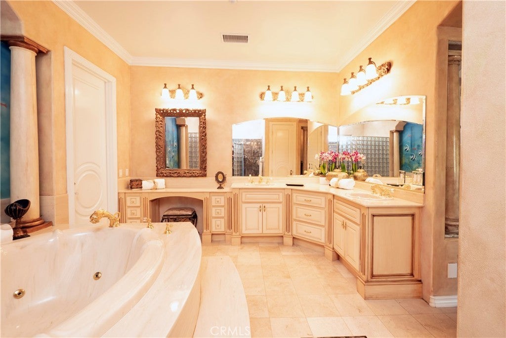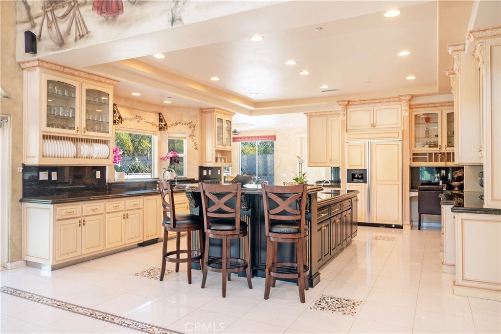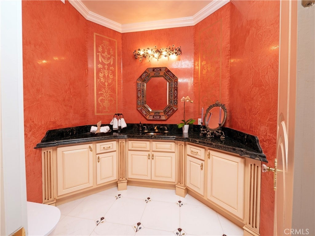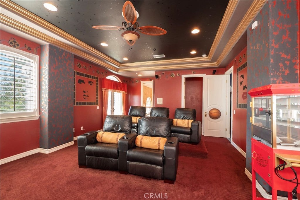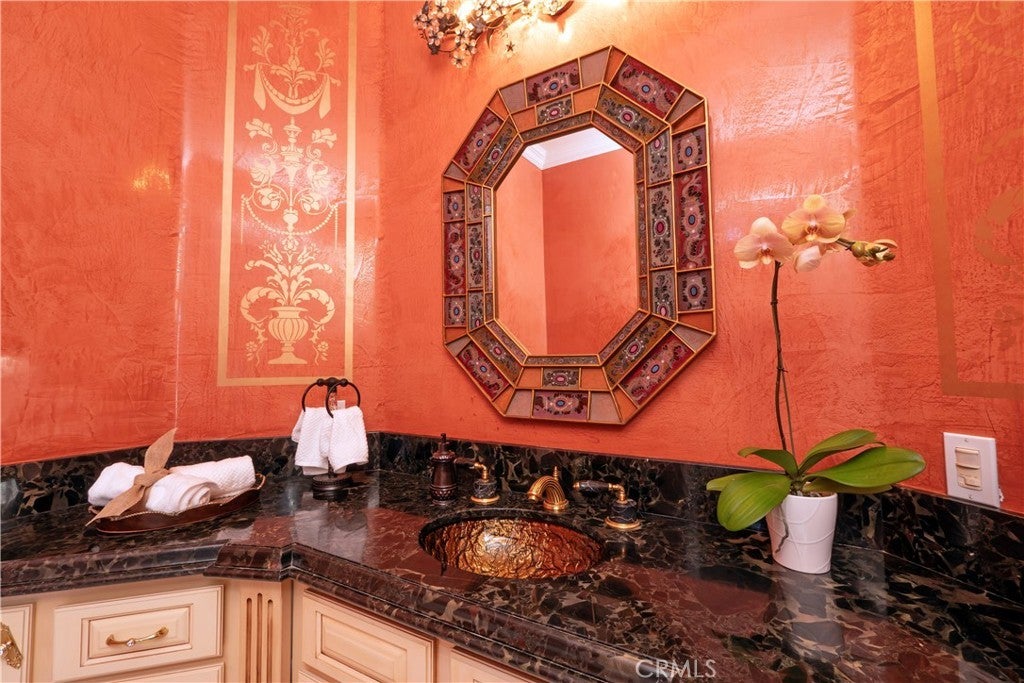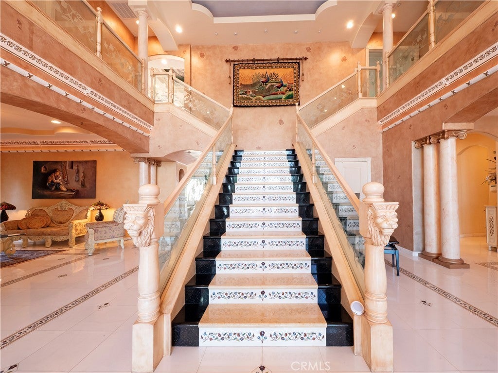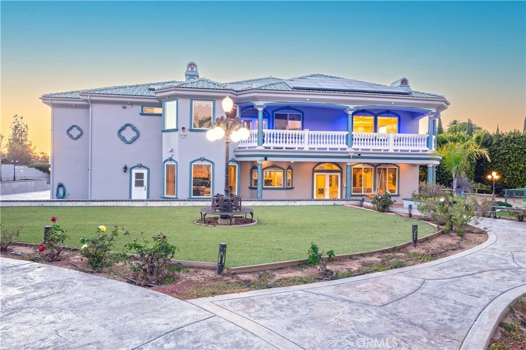 The original owners raised a large family here and loved to host events of all kinds—and it shows in every thoughtful detail of this grand estate. From intimate family dinners to grand celebrations, this home was designed to create lasting memories and exceptional entertainment. Guests will be captivated from the moment they arrive. Walking past the welcoming sculpture, they'll enter through double beveled glass doors into a dramatic two-story foyer that takes center stage. Elegant mother-of-pearl inlay adorns the marble flooring, while rope lighting illuminates the soaring space. Surrounding this stunning foyer, discover a music alcove, two versatile bedrooms, a gracious living room, a formal dining room, and a bonus room perfect as library, wine cellar, home office, or bar tailored to your lifestyle. The second floor offers five spacious bedrooms, each thoughtfully positioned for privacy and a designed theater room —that can convert easily to an additional bedroom. The crowning jewel is the opulent primary suite; complete with a private balcony, cozy fireplace, reading nook, luxurious 14k gold bathroom fixtures, makeup vanity, dual sinks, and a walk-in closet with built-in dressers. The chef's kitchen is where this home truly shines for entertaining. Featuring two stoves with 10 total burners, stainless steel appliances, granite countertops, extensive cabinetry, a walk-in pantry, and a massive island. It opens to a second, casual dining area and family room—ideal for everyday gatherings. A large butler's pantry with a separate entrance makes catered events seamless as it leads out to the resort-like yard. With its outdoor kitchen area, complete with generous counter space, grill, refrigerator, and sink; lighted tennis/basketball court that allows for play any time of day or night; resort-style pool featuring a cascading waterfall, rock slide, and integrated hot tub; multiple covered patios and thoughtful lighting placed throughout every element truly feels like is has been carefully designed for hosting memorable events or simply relaxing with family. Perched above neighboring homes, the property offers privacy and stunning views of mountains, and city lights; and also includes dual 2-car garages with ample storage space, extra-exterior parking for large gatherings. This is more than a house—it's a lifestyle designed for connection, celebration, and making memories that last a lifetime.