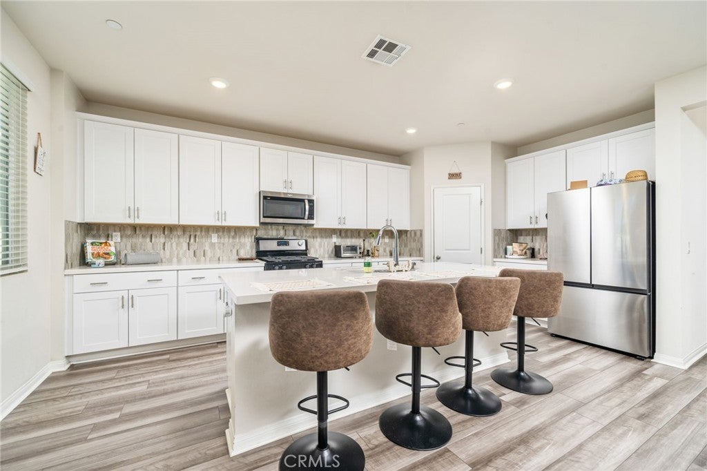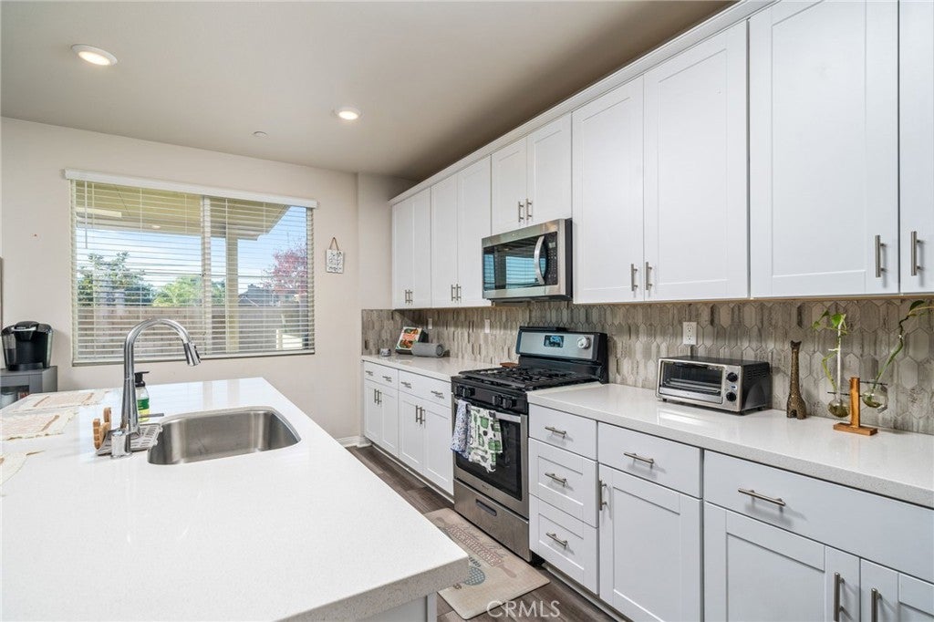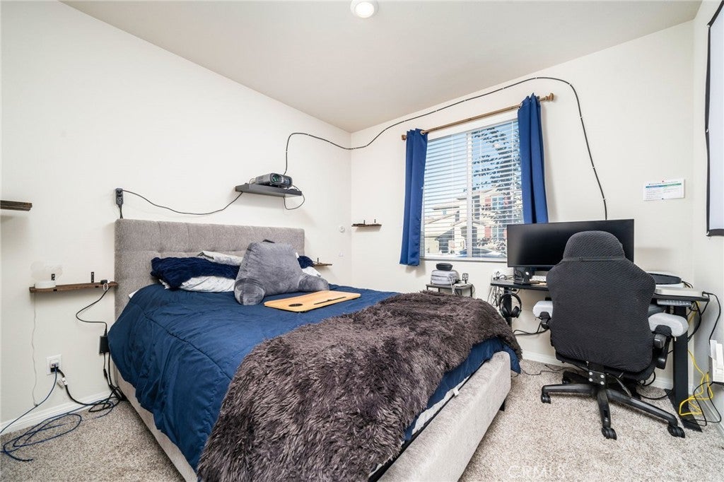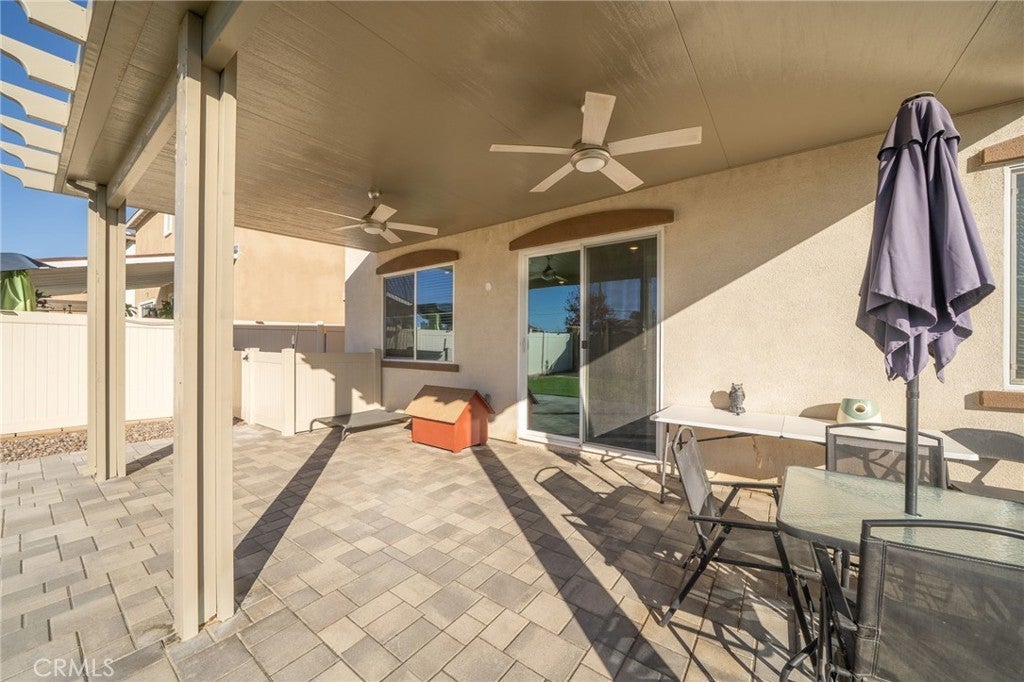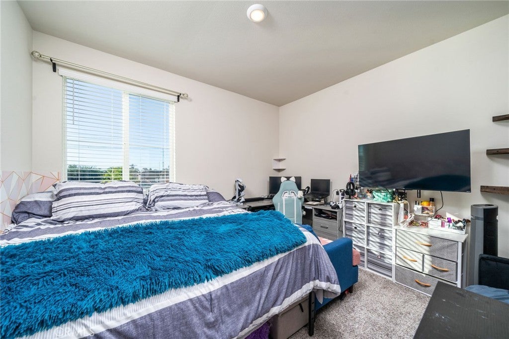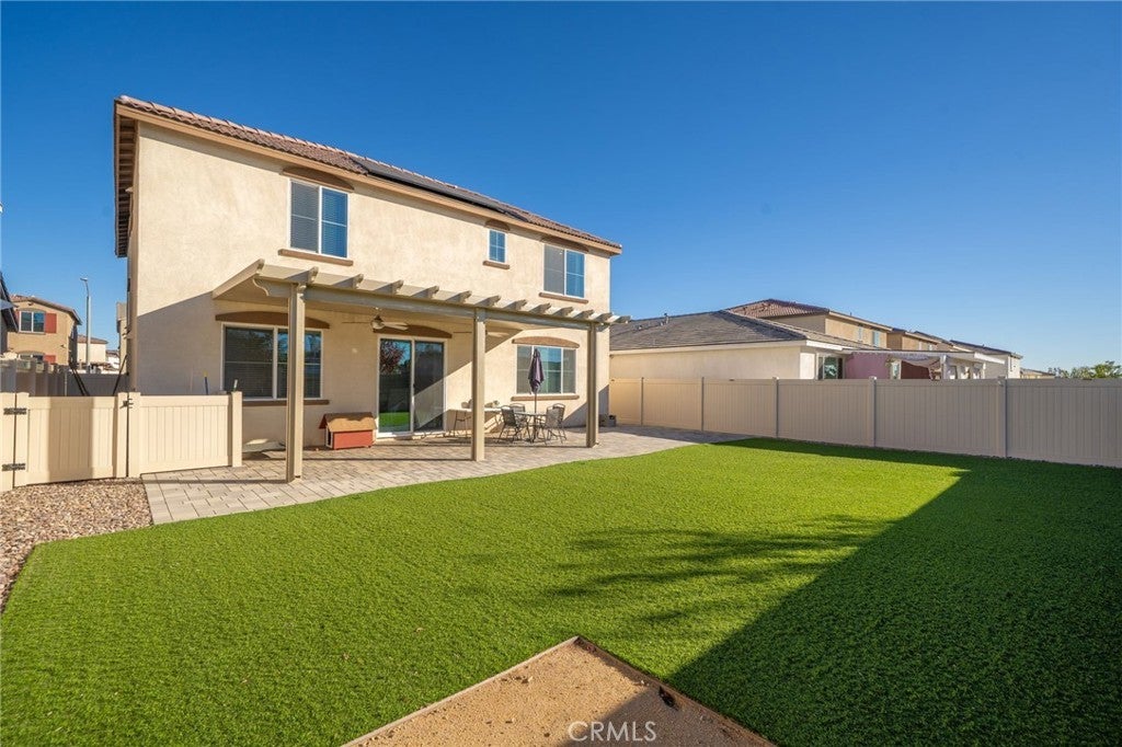 Welcome to this 2022-built home offering 4 bedrooms, 3 bathrooms, and 2,320 sq. ft. of modern living space, designed with both comfort and efficiency in mind. From the moment you step inside, you’ll appreciate the open and functional layout enhanced by vinyl flooring throughout the main floor, providing a sleek look and easy maintenance. The main level features a convenient bedroom and full bathroom, perfect for guests, multigenerational living, or a private home office. The heart of the home is the beautifully appointed kitchen, showcasing a center island with quartz countertops, ample cabinetry, and a walk-in pantry, making it ideal for everyday living and entertaining alike. Upstairs, you’ll find a spacious loft area offering endless possibilities—use it as a home office, playroom, or a home gym. The upstairs laundry room adds everyday convenience, while a full guest bathroom serves the secondary bedrooms. All upstairs bedrooms are carpeted, creating warm and inviting retreats. The primary suite is generously sized and flows seamlessly into the primary bathroom, which features vinyl flooring, a walk-in shower, and a spacious walk-in closet Step outside to a backyard designed for relaxation and entertaining. Enjoy a covered patio with ceiling fans, elegant paver hardscaping, and low-maintenance artificial turf, perfect for reducing water costs all year long. Adding to the home’s value and efficiency is paid-off solar, offering significant energy savings year-round. This is a huge plus! There is a tankless water heater for the home as well. The home is located within a well-maintained community where the HOA features a barbeque and picnic area, playground, and sport court, providing amenities for recreation and gatherings. This nearly new, energy-efficient home blends modern upgrades, flexible living spaces, and outdoor comfort—an exceptional opportunity you won’t want to miss. Make this great home yours today!