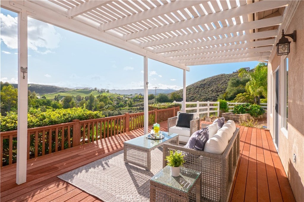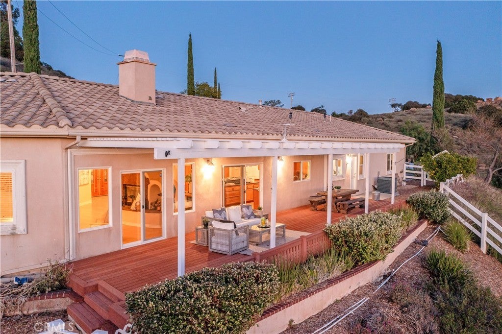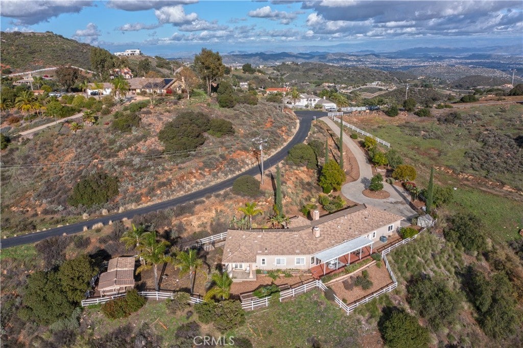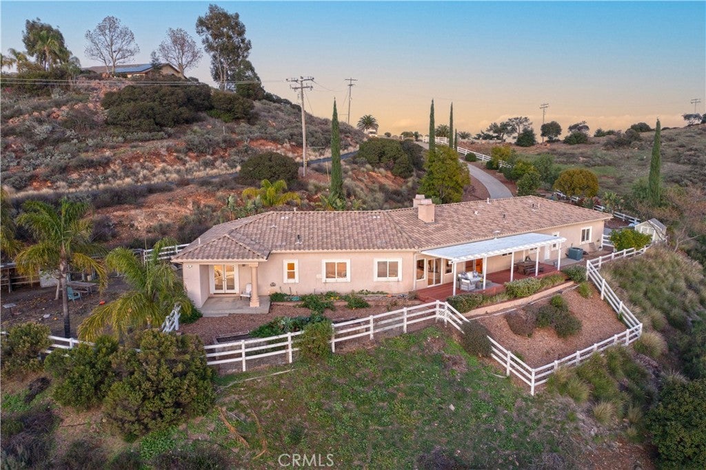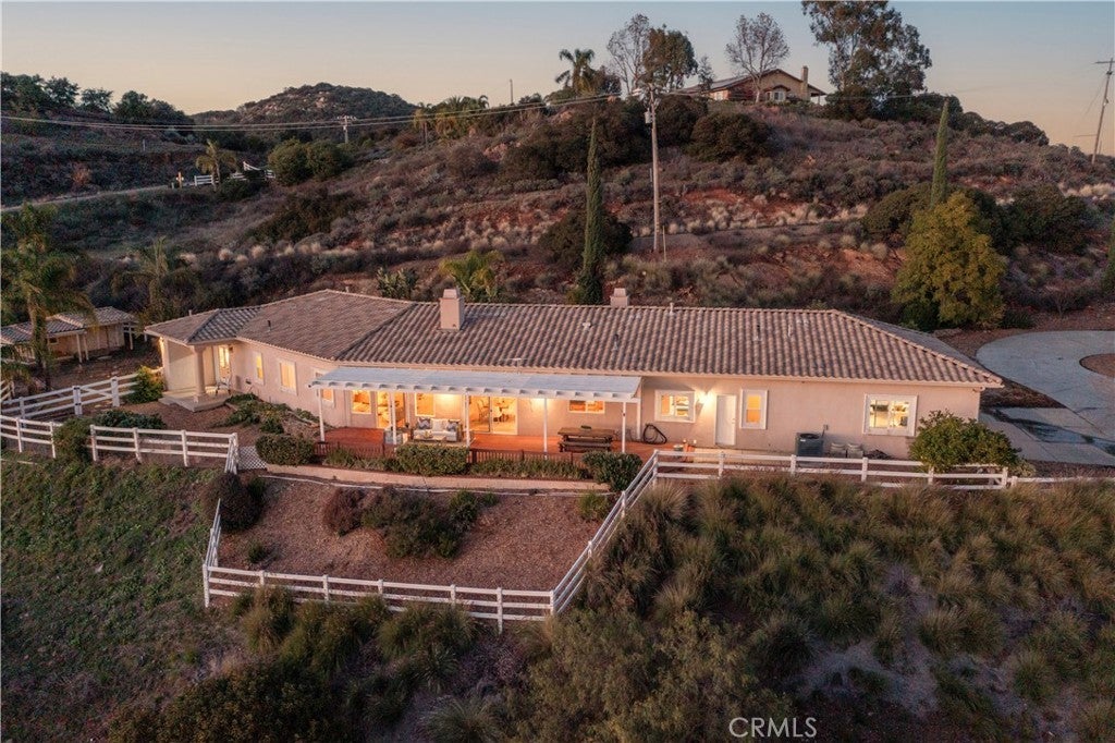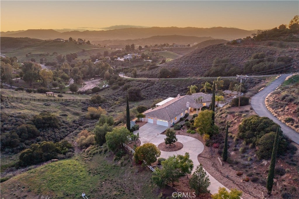 Welcome to your dream retreat situated on the scenic Santa Rosa Plateau in La Cresta. This stunning custom single-family residence sits on a sprawling 5 acre parcel, ensuring both privacy and tranquility while still enjoying the warmth of a close-knit community. Designed for comfortable, upscale living, this 3,317 sq ft home features an open floorplan, five spacious bedrooms, and three luxurious bathrooms — perfect for families of any size or those who love to entertain. Step into sophistication and charm with elegant 12-inch crown molding, high ceilings, and rich hardwood flooring throughout. The heart of the home is the expansive family and dining rooms, seamlessly connected by a dual fireplace that creates an inviting atmosphere for gatherings. An additional fireplace in the living room adds warmth and ambiance to your evenings. The gourmet kitchen will delight the home chef with Corian countertops, a center service island with breakfast bar and ample space for culinary creativity. Whether you’re preparing everyday meals or hosting festive celebrations, this kitchen is designed to inspire. Ideal for multi-generational living, the attached “Next Generation” unit provides comfort and independence. Complete with a full bathroom and a kitchenette, it is perfect for extended family or guests. Embrace the beautiful California outdoors from the expansive rear deck, offering breathtaking views of rolling hills and picturesque countryside. The primary suite features a private covered viewing deck, creating a personal sanctuary to enjoy sunrises, sunsets, and peaceful moments. The property includes a fenced area suitable for raising chickens or goats which can easily be converted for horses, making it a perfect fit for animal lovers or hobby farmers. Enjoy the bounty of your own land with a variety of mature, fruit-bearing trees such as peach, persimmon, apple, and fig. La Cresta is renowned for its vibrant social life and supportive family-centered community, yet the 5 acre parcel minimum ensures the ultimate in privacy and seclusion. Here, you have the freedom to relax, explore, and enjoy life at your own pace — all while remaining connected to neighbors and local activities. This extraordinary estate offers the rare combination of luxurious living, multi-generational flexibility, and rural charm. Experience the best of Southern California in a home that truly has it all — space, elegance, and a setting that welcomes both relaxation and adventure.