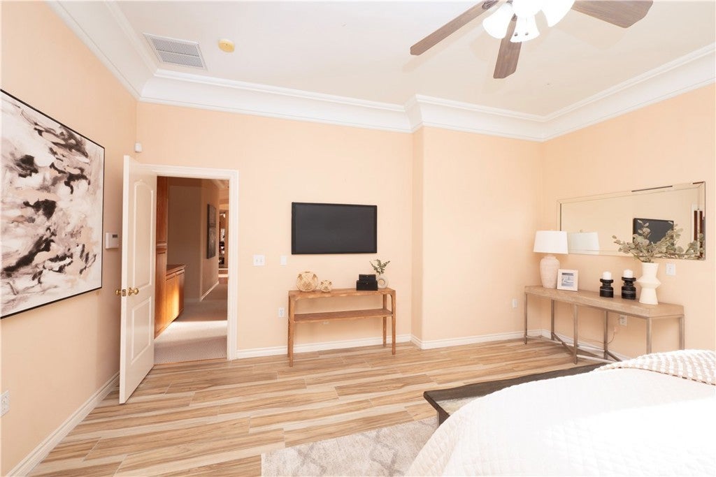 • Interior FeaturesBreakfast Bar, Ceiling Fan(s), Crown Molding, Separate/Formal Dining Room, Eat-in Kitchen, High Ceilings, Open Floorplan, Pantry, All Bedrooms Down, Bedroom on Main Level, Main Level Primary, Primary Suite, Walk-In Closet(s), Entrance Foyer, In-Law Floorplan, Living Room Deck Attached, Phone System, Solid Surface Counters, Wired for Sound
