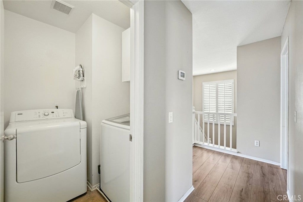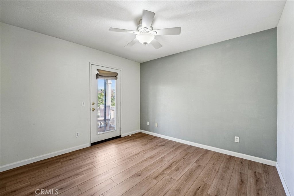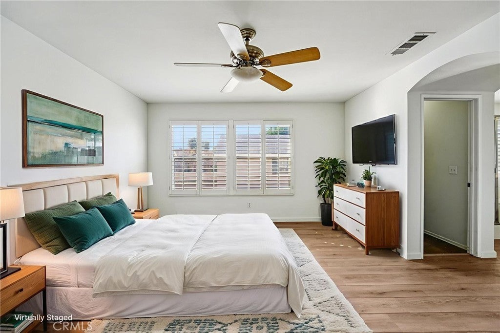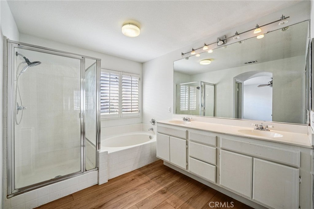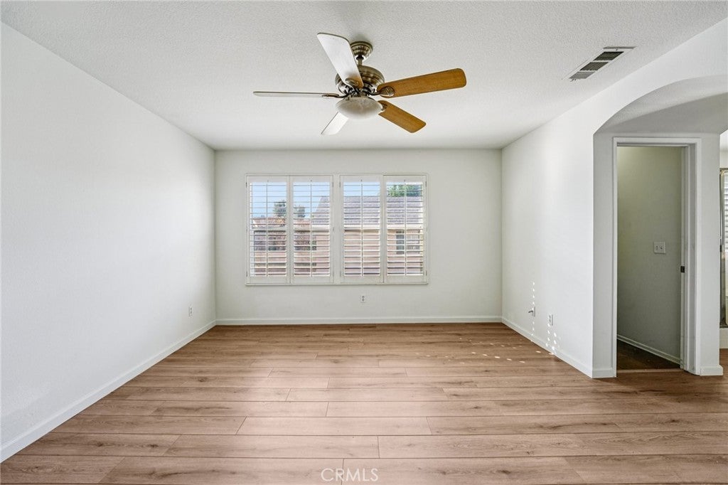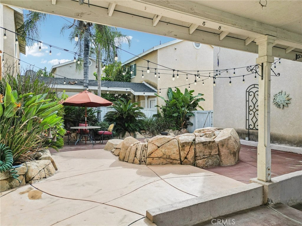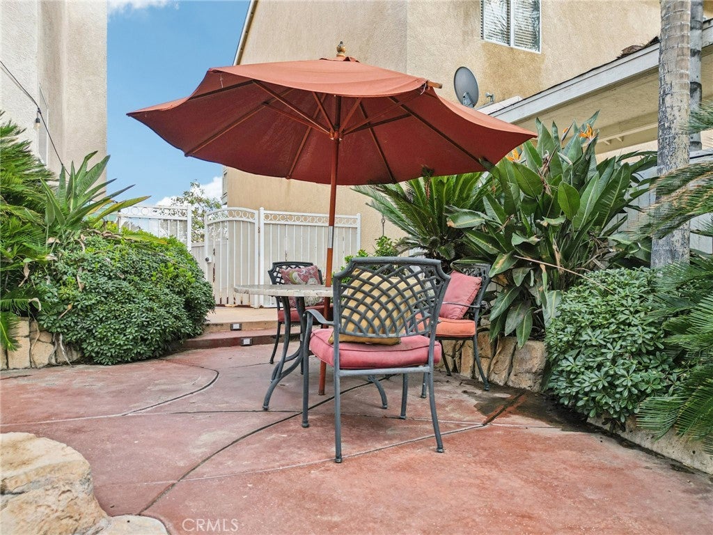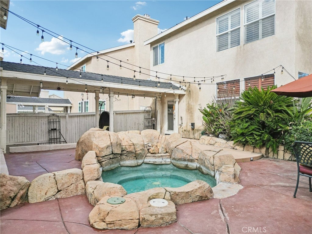 Welcome to this beautifully maintained two-story home located within a desirable gated community, where pride of ownership is evident throughout. The home opens to elegant formal living and dining rooms filled with natural light, enhanced by classic wood shutters, newer interior paint, recessed lighting, and handsome laminate flooring. The updated kitchen features quartz countertops, white shaker cabinetry, subway tile backsplash, and included appliances, and flows seamlessly into the inviting family room with a cozy gas fireplace—ideal for everyday living and entertaining. The backyard is designed for relaxation, offering a rock spa and built-in fire pit, perfect for unwinding at the end of the day. A detached two-car garage with epoxy floors provides excellent storage, while the private studio above adds exceptional flexibility. Complete with a full bathroom, its own A/C, and a dedicated water heater, the studio is ideal for guests, extended family, or a creative or fitness space. Upstairs, the spacious primary suite includes an en-suite bathroom with dual sinks, a separate tub and shower, and a large walk-in closet. Secondary bedrooms are generously sized and share a large balcony, each with its own access. An upstairs laundry room includes the washer and dryer. HOA covers grounds and park maintenance. This is a truly special home you won’t want to miss.