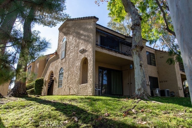 Located within the beautiful Canyon Creek community full of trees and tranquil landscaping. End unit upper level condominium unit. Private staircase to your entry, wood flooring throughout, and vaulted ceilings. Entry space opens to large living and dining rooms, sliding glass doors look out to the treetops. Galley style kitchen keeps everything close but still provides ample countertop and cabinet space. The bedroom is large and spacious with two closets with mirrored doors and the bathroom has a large vanity with storage below. There is additional cabinetry in the hall for linens or extra storage. The balcony patio off the living room is private with a great view of the trees, a peaceful spot to unwind. The Canyon Crest town center and golf course are both within walking distance. This community has walking trails, jacuzzi, pool, basketball court, recreation room and laundry facilities.