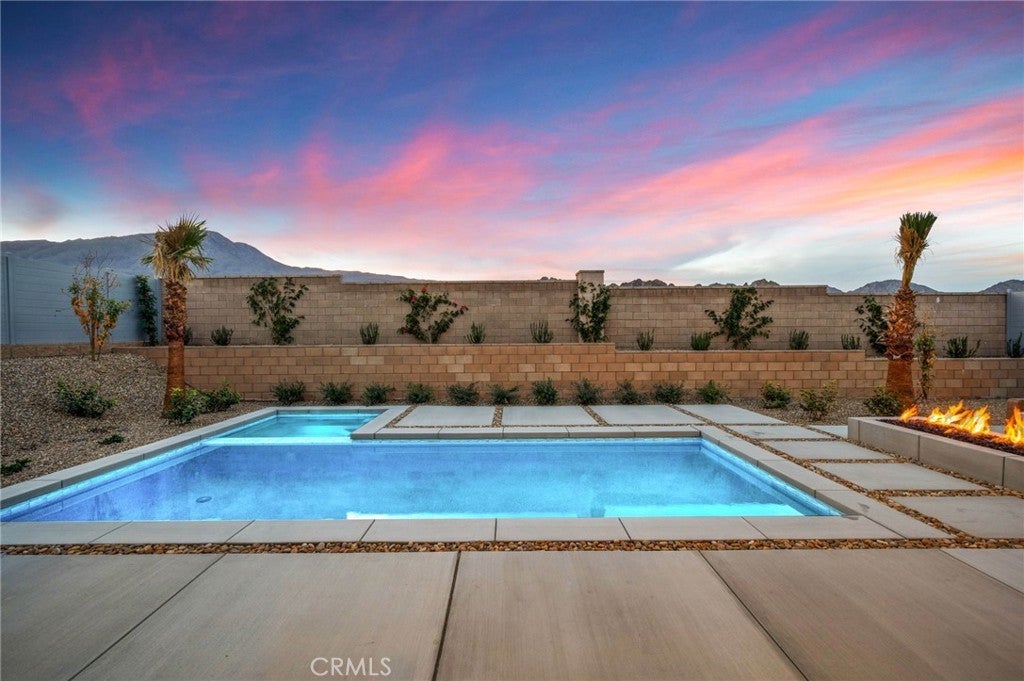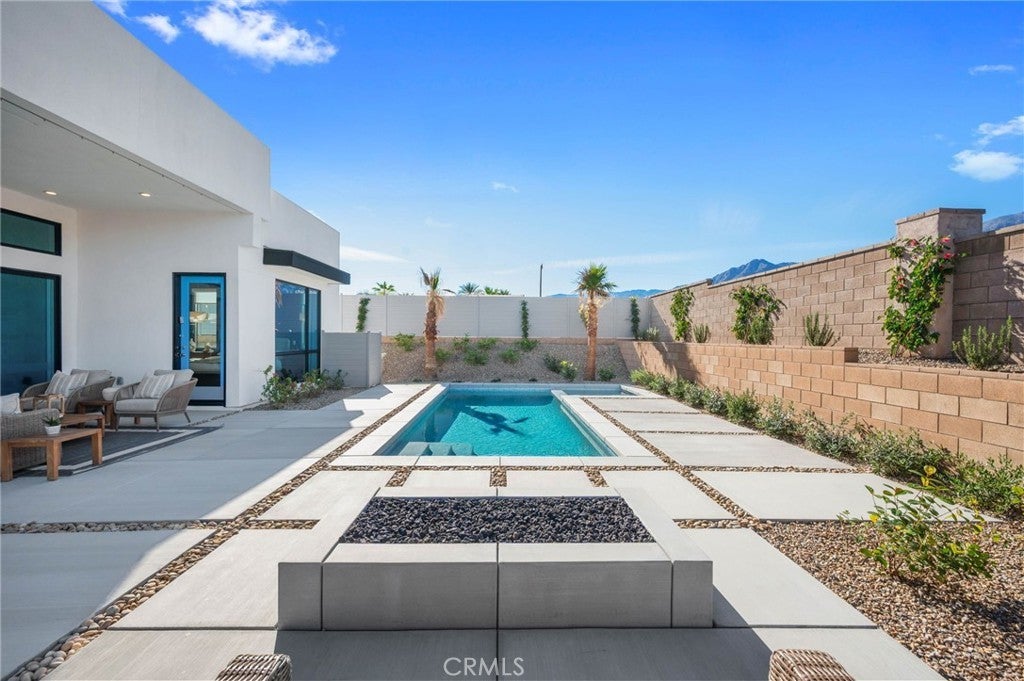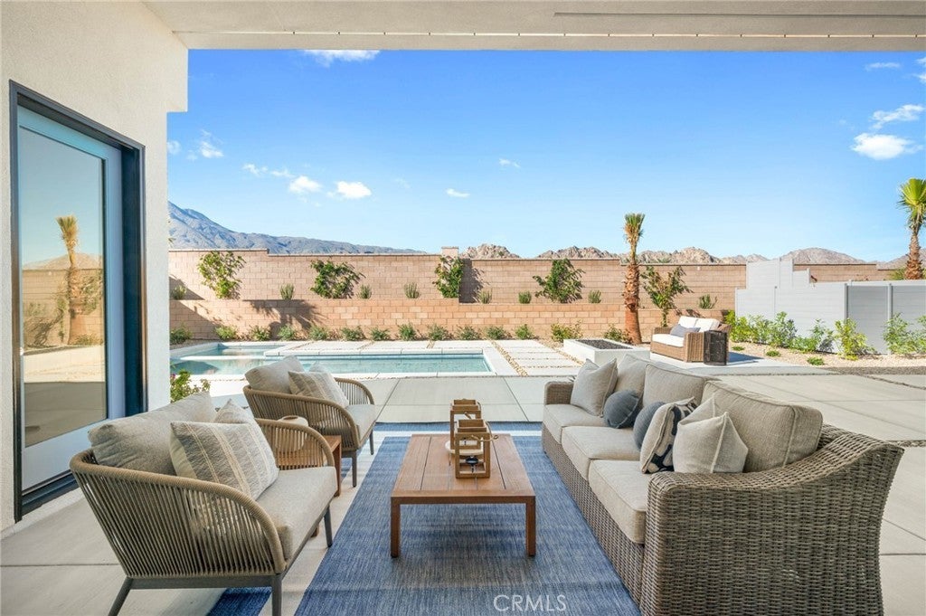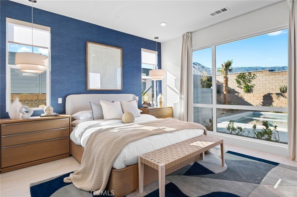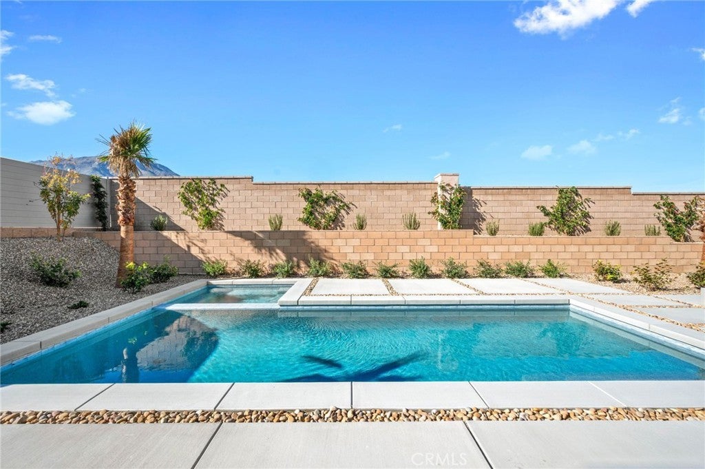 Welcome to Oasis by Crestwood Communities, a gated community offering modern desert living with breathtaking mountain views in the heart of La Quinta. This unique single-story modern home features 2,458 square feet with 3 bedrooms, 3.5 bathrooms, and a 3-car garage, and is accessed through a private gated courtyard that provides both privacy and style. Inside, soaring ceilings, striking 12x24 tile floors, and an open-concept great room are filled with natural light from front to back, enhanced by expansive sliding glass doors that create a seamless indoor-outdoor flow to the covered patio. The outdoor space is resort style, perfect for entertaining or relaxing beside the included pool and spa. The open kitchen is designed for both functionality and elegance, featuring designer quartz countertops, an oversized island with waterfall edges, modern flat panel cabinetry with warm accent lighting, soft-close hinges, and stainless-steel Bosch appliances. Each bedroom includes its own en-suite bathroom, while the primary suite offers a resort-style retreat with direct access to the covered patio and a spa-inspired bathroom, thoughtfully separated from guest bedrooms for added privacy. Solar is available for purchase or lease, and the home includes many additional amenities. Conveniently located near golf, hiking, biking, and horseback riding, yet away from traffic and congestion. Model grand opening is Saturday, January 24th. Photos shown are of the model home; the subject property is currently under construction.