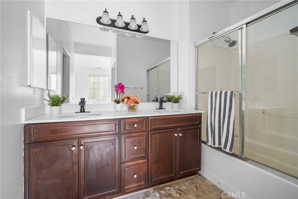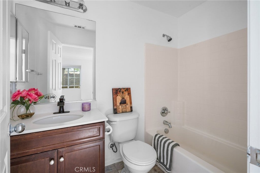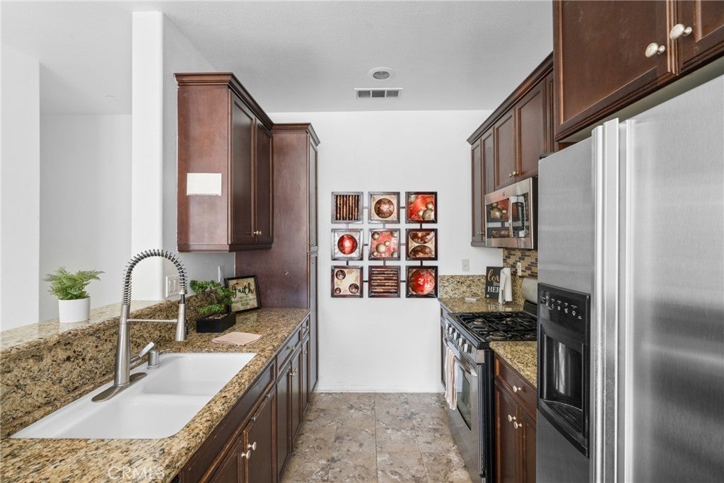 Location, Location, Location! Highly desirable corner unit in a gated community with only one shared wall, offering exceptional privacy. This beautiful 2-bedroom, 2.5-bath home features a convenient downstairs bedroom with a full bath, ideal for guests or multi-generational living. Enjoy easy access with an attached 2-car garage. The bright, open floor plan is warm and inviting, highlighted by a cozy fireplace in the living room that adds an elegant touch. Upstairs, a private balcony off the loft area provides the perfect space to relax. Move-in ready and fully equipped with all appliances included, including washer, dryer, and refrigerator. Located within top-rated schools, including Eleanor Roosevelt High School, and conveniently close to the 15 and 60 freeways for an easy commute. Just minutes from Costco, major shopping centers, fine dining, and entertainment. The HOA includes water and trash and offers resort-style amenities such as a pool, jacuzzi, basketball court, playground, and BBQ area. Property is VA approved! Come on in and make it yours!