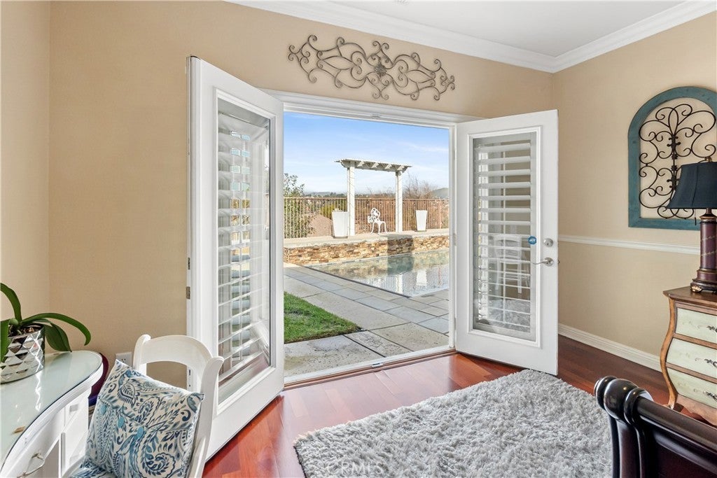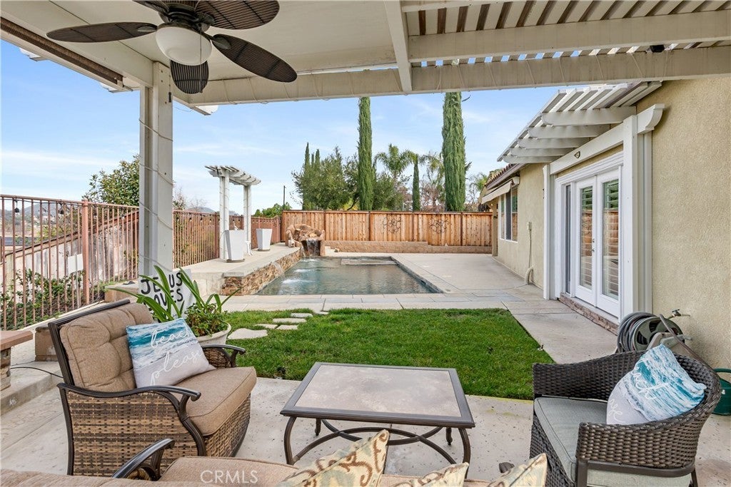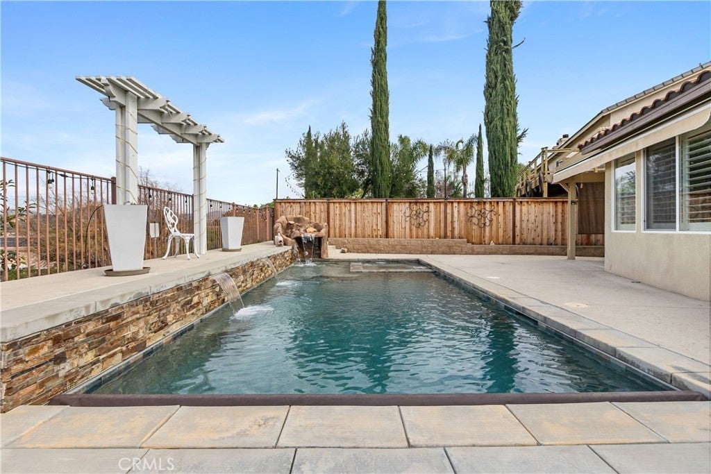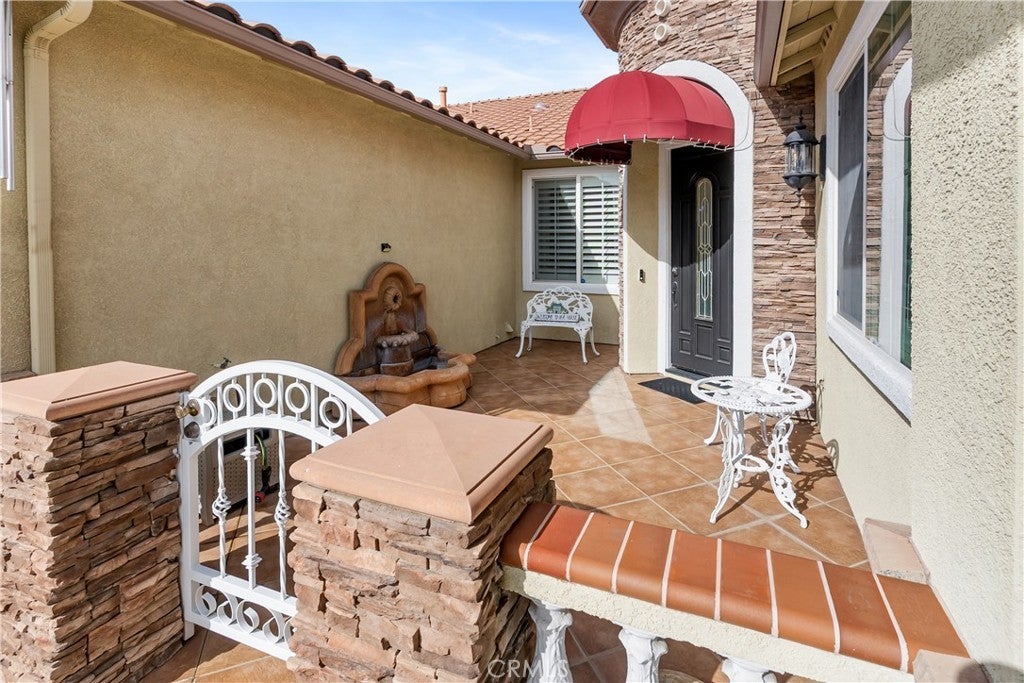 Welcome to 26313 Palm Tree Lane - a rare, completely upgraded and meticulously maintained single-story sanctuary in the heart of Murrieta. From the moment you arrive, you’re greeted by a private gated courtyard with a tranquil fountain, setting the tone for the elegance that awaits inside. Step through the front door into a stunning rotunda foyer, where custom inlaid tile accents seamlessly blend into rich Brazilian cherrywood floors, all crowned by custom shutters and crown molding throughout the home. This thoughtfully designed 4 bedroom, 3 bath residence offers exceptional flexibility and privacy. Two living rooms and a formal dining space offer entertaining space for a crowd and small, intimate gatherings as well. One bedroom and full bath are located in their own separate wing, making it ideal for guests, multi-generational living, or grown children who want space of their own. The primary suite is a true retreat, privately situated within the home and featuring dual closets, dual sinks, a soaking tub, separate shower, private water closet, and French doors that open directly to the backyard, patio, and resort-style pool and spa. The third bedroom features a walk in closet, and the fourth bedroom is currently configured as a home office, but easily adapts to a sitting room, library, nursery, or flex space to suit your lifestyle. The kitchen and bathrooms have been completely remodeled, offering modern finishes while maintaining the home’s timeless appeal. Designed for both relaxation and entertaining, the backyard is a private resort oasis. Enjoy a custom heated pool with a dramatic rock grotto and cascading waterfall, complementary lighting, and an attached spa with waterfall spillover. An automated solid pool cover prioritizes safety and simplifies maintenance. Two separate covered patio areas—both with ceiling fans—include roll-down shades in one space and a fireplace, fountain, and grill area in the other, creating year-round outdoor living options. The pool equipment is discreetly enclosed, enhancing the peace and tranquility of the setting while protecting it from the elements.