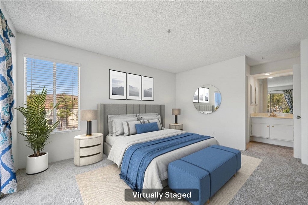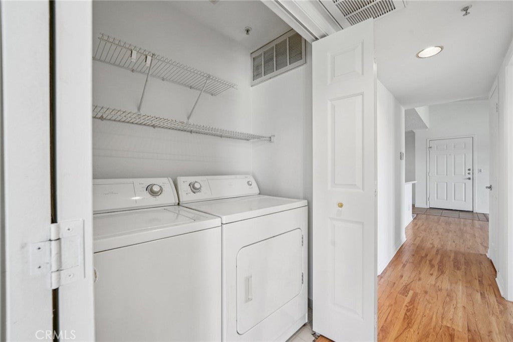 Welcome to this move-in ready condo centrally located in the desirable Triana gated community of Corona. This unit has a nice view to the park from the living room and both bedrooms. This spacious and open 2-bedroom, 2-bathroom home features vaulted ceilings, plenty of natural light, and fresh paint throughout. Key features of this property include wood -look laminate flooring in the living area, new carpet in both bedrooms, and updated stainless steel appliances in the kitchen (refrigerator, dishwasher, electric range, and microwave included) The primary suite includes a private ensuite with a large soaking tub, while both bedrooms offer access to private balconies. An in-unit laundry closet with a washer and dryer is also included. One car garage plus one additional designated parking space. Residents enjoy access to a sparkling pool and spa, an indoor gym, a clubhouse for gatherings, and outdoor dining areas. The HOA fee covers water, gas, trash, and landscaping, leaving the owner responsible only for electricity. The home is ideally located near parks, schools, and the shopping and dining centers off McKinley Street, with easy access to the 15 and 91 freeways.