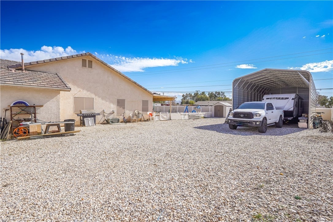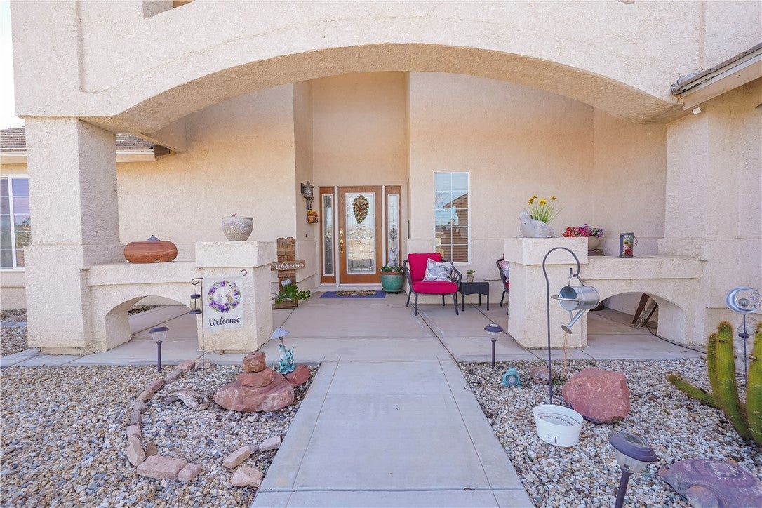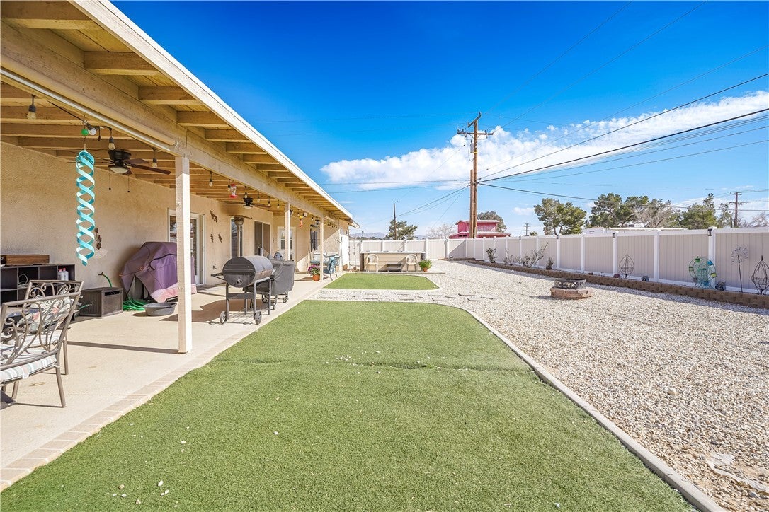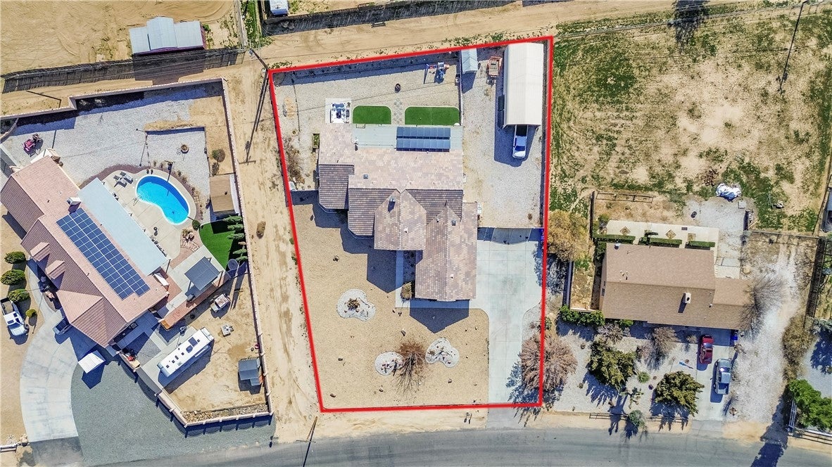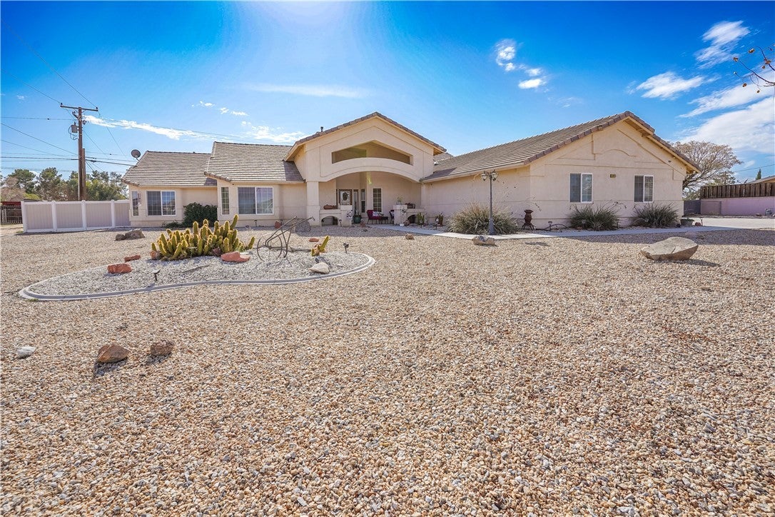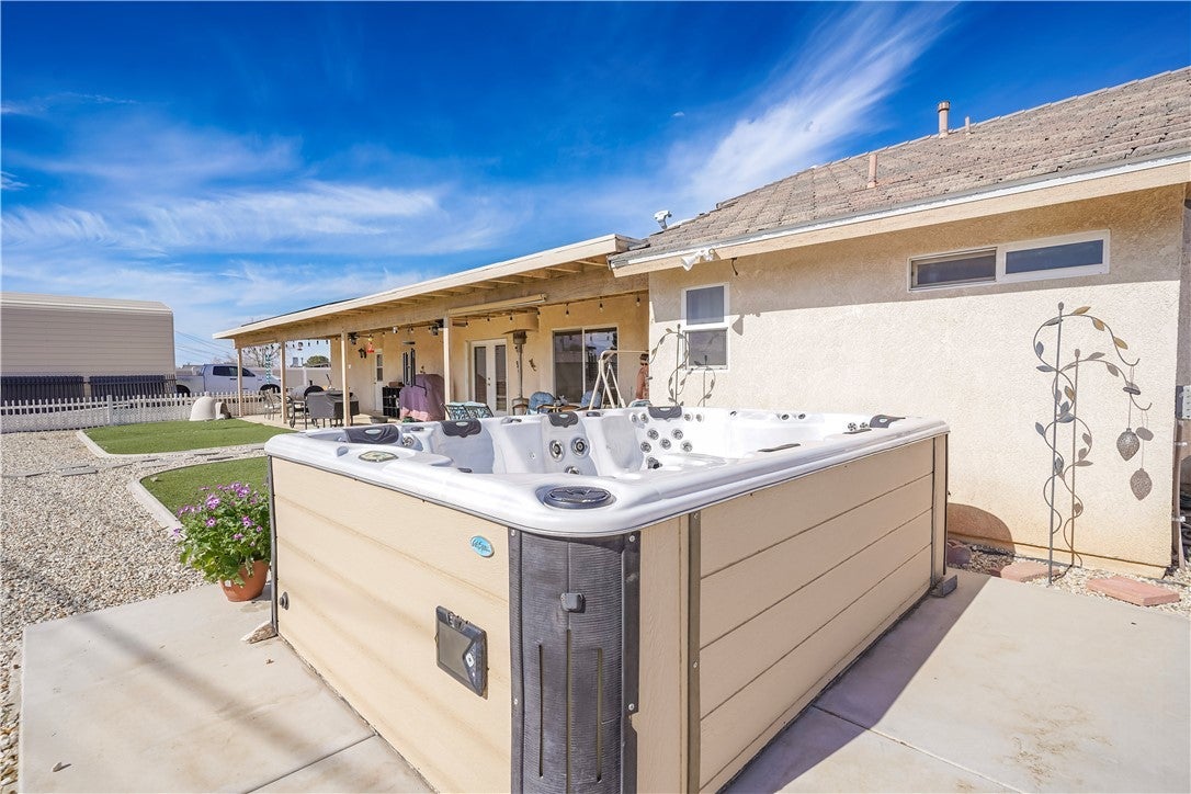 Welcome to 18423 Cocopah Rd in Apple Valley! This expansive ranch-style home offers 3,130 sq ft of thoughtfully designed living space on a .68-acre lot, zoned for horses and packed with features for comfort, efficiency, and RV-friendly living. The home includes 4 bedrooms and 3 bathrooms, with two primary suites, one featuring a jacuzzi tub and heated floors. Additional heated flooring extends through the kitchen and dining area, complementing the cozy pellet stove. The kitchen is outfitted with upgraded appliances and instant hot water for everyday convenience. Climate control is well covered with central air conditioning plus an evaporative cooling system for efficient seasonal comfort. Energy savings continue with owned solar (buyer to assume loan) and a new water heater installed in 2023, located in the garage. Outdoor features truly shine, including low-water landscaping with drip irrigation, three mature fruit trees (peach, apple, and plum), vinyl fencing, and a relaxing 6-8 person spa. The property also offers RV hookups with electric and septic dump, an RV carport, and a 3-car attached garage with workshop. Additional highlights include wheelchair-accessible doors to the back patio, exterior light outlets conveniently located in the eaves, septic system, and plenty of usable space for animals, toys, or future expansion.