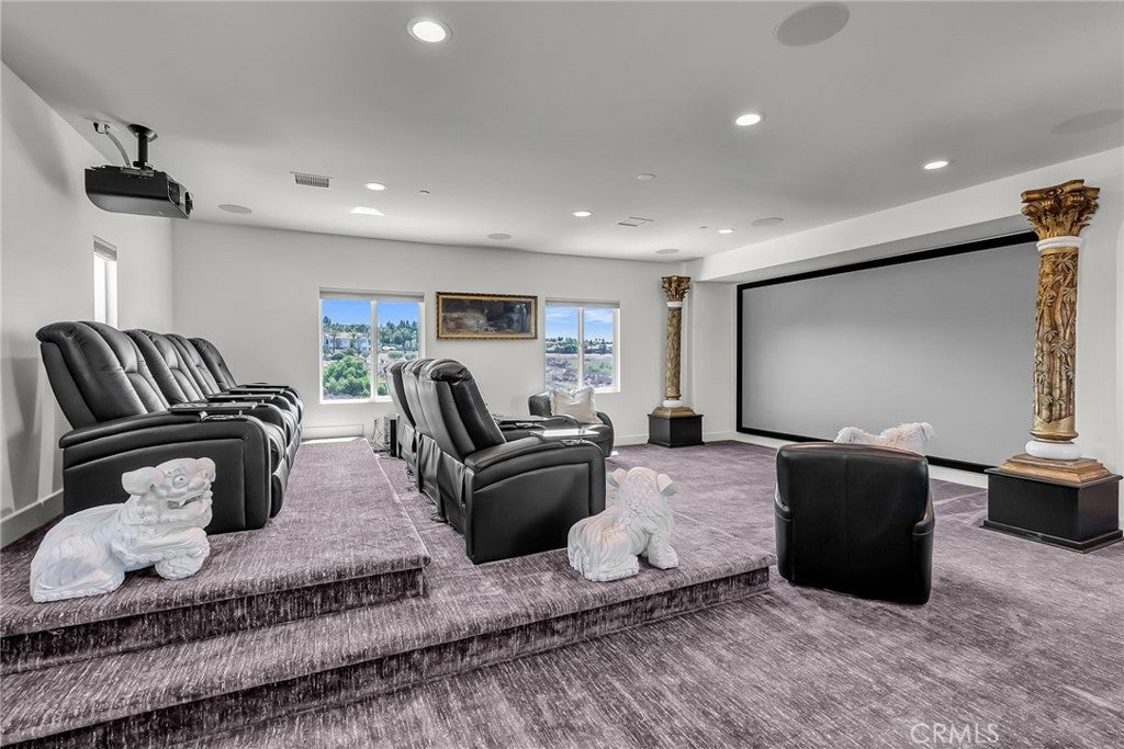 ALESSANDRO HEIGHTS- MONTECITO ESTATES- Entering the gates of this exclusive gate guarded community, you are greeted by pastoral mature Olive trees, white roses and city light/mountain views as far as the eye can see! The soaring foyer of this impressive residence lures you into the elegant entry gallery with floor to ceiling glass windows affording views to the central courtyard with its fireplace and entertaining patio, also providing access to the separate guest suite as well as the home theater/self-contained ADU above. The grand room moves seamlessly to the courtyard and the sunroom through retractable glass walls creating the ideal indoor/outdoor entertaining space all the way out to the pool. The kitchen offers top-tier designer appliances including 3 ovens, commercial range with pot filler, 2 dishwashers and a Butler's Pantry with built-in Miele coffee/espresso maker. Two massive islands provide ample meal preparation and serving surfaces on the pristine white quartzite counter-tops; Separate wine storage room and large walk-in pantry. The separate dining room accommodates any large party with stunning details and views of the surrounding hills; Separate family room/music room with views of the pool and city lights with soaring beamed ceiling and elegant fireplace; An office/library is located off the entry gallery affording views of the courtyard as well as the city lights. The primary bedroom suite is sequestered and contains the luxurious bedroom area with sitting area and fireplace, opulent spa-like white marble bath with walk-in shower, free-standing tub and dual vanities; Dual "boutique style" walk-in closets designed to insure optimal organization of all your clothing shoes and accessories in their designated spaces. The additional 4 large bedrooms for a total of 5 all have their own distinct ensuite baths and walk-in closets. The upper level contains the home theater with seating for 10 as well as a fully self-contained ADU with kitchenette, bedroom and spacious bath. Massive indoor laundry accommodates dual launder sets and loads of storage. The grounds perfectly encompass the residence with pristine landscaping providing ample privacy without impeding the incredible views enjoyed from the site! The classic pool with spa and water feature is surrounded by expansive decking and lawns evoking a rich European inspired scene which is additionally complimented by the private orchard of Avocado, Lemon and Naval Orange Trees!