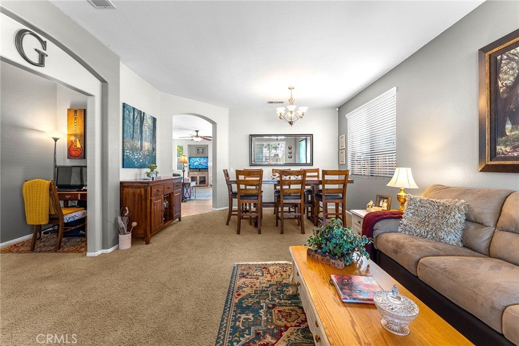 Charming and immaculate single story located in the desirable Moreno Valley Ranch located on a quiet street near schools and parks This home is filled with lots of natural light, has an open floor plan and is an entertainer's delight. Oversized kitchen with 2 nice sized pantries, upgraded cabinets and huge island that overlooks the family/great room with a cozy fireplace that leads to the outside backyard/patio and includes a built-in gas barbeque. Dual pane windows and ceiling fans throughout plus patio doors with built-in micro mini integrated blinds and french doors in primary bedroom Tile flooring in great room and kitchen. Newer stove with built in air fryer, dishwasher and microwave less than a year old. Beautiful custom front door with tempured glass. Newer neutral carpet and luxury vinyl plank flooring. Newly planted grass in front yard Moreno Valley Ranch HOA includes a long list of amenities including fishing lake, club house, swimming pools, picnic areas, gym, more! VERY LOW HOA AND NO MELLO ROOS. WELCOME HOME!