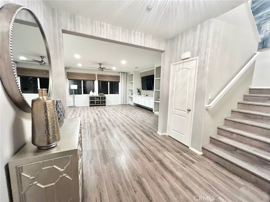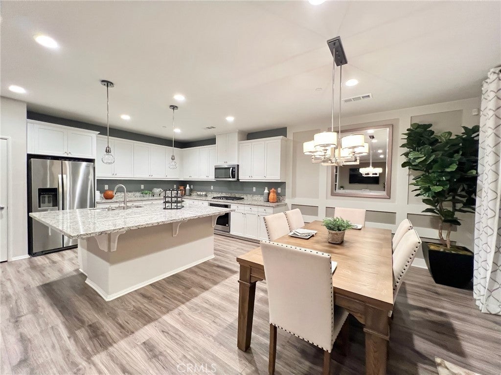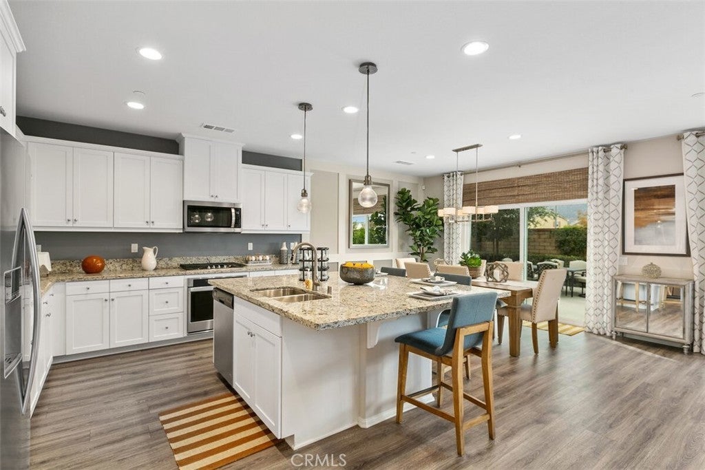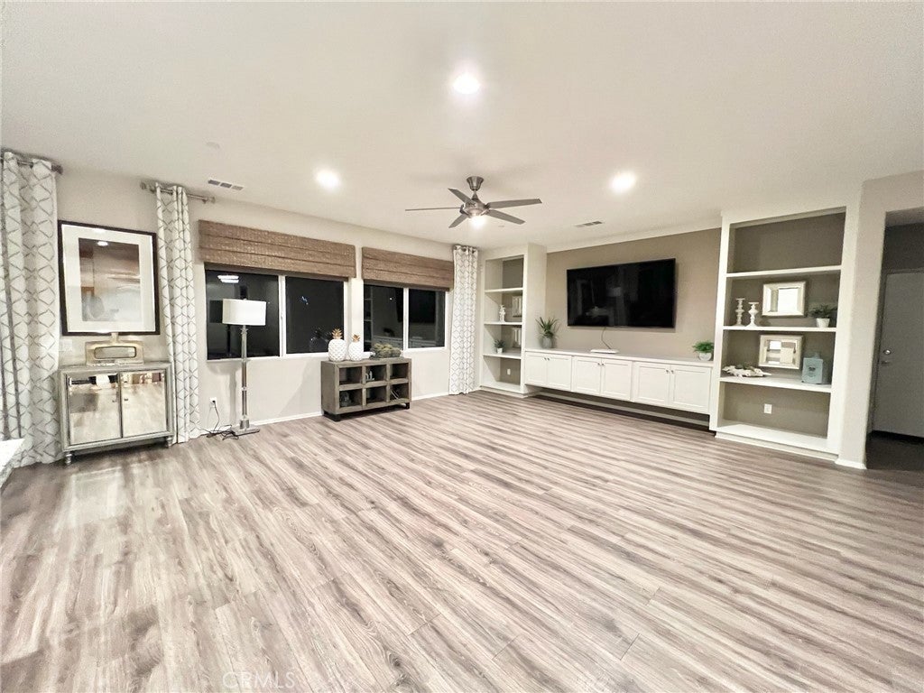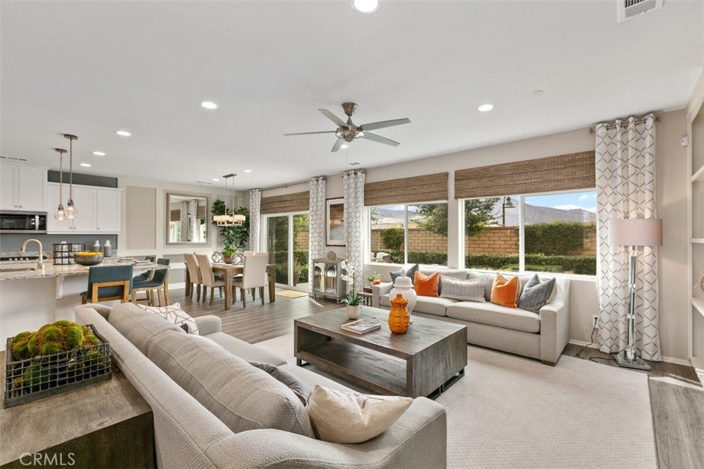 Resort-Style Living in Audie Murphy Ranch – Former Model Home Across from the Clubhouse! Welcome to this gorgeous former model home located in the highly sought-after Audie Murphy Ranch community in Menifee, perfectly positioned directly across the street from the clubhouse, pool, and resort-style amenities. This stunning 4-bedroom, 3-full-bath home with solar is loaded with custom upgrades and designer touches throughout. Step inside to a grand foyer featuring a beautiful chandelier and an elegant entry that flows seamlessly into the spacious family room with custom built-in media niches. The open floor plan continues into the formal dining area with direct access to the backyard patio, creating the perfect space for entertaining. The chef’s kitchen is both stylish and functional, offering: A huge center island with additional seating and prep space, White cabinetry, Pendant lighting, Black and stainless-steel appliances including refrigerator, Large walk-in pantry, The first floor also includes a convenient bedroom and full bathroom, ideal for guests, multi-generational living, or a home office. Upstairs you’ll find additional built-in storage and a large window that fills the space with natural light, along with an oversized loft featuring built-ins that can easily serve as a media room, office, playroom, or flexible living space. The primary suite feels like a private spa retreat, featuring designer accents and shelving, along with a luxurious ensuite bathroom with dual-sink vanity, separate soaking tub, walk-in shower, privacy door, and a huge walk-in closet. The secondary bedrooms are beautifully appointed with custom paint and lighting, and the guest bathroom is conveniently located nearby. Additional features include: Large laundry room with cabinets and shelving, Modern ceiling fans, Recessed lighting, Designer paint colors, Brand new flooring installed after photos were taken, 3-car garage with epoxy flooring. Step outside to a well-manicured backyard with mature trees, providing a peaceful setting to relax or entertain. Residents of Audie Murphy Ranch enjoy incredible resort-style amenities, including: Clubhouse, Multiple pools & spas, Fitness center, Sports parks, Hiking and biking trails, Playgrounds and community events. All just steps from your front door. This beautiful former model home with designer upgrades and a prime location truly offers the best of resort-style living in Menifee. A must see!