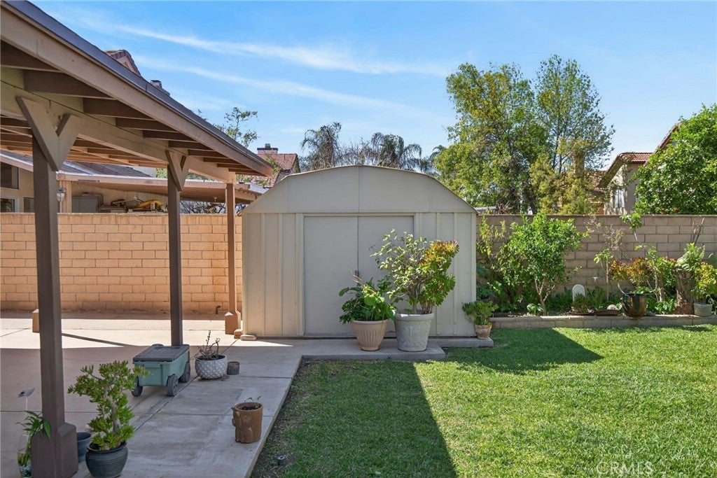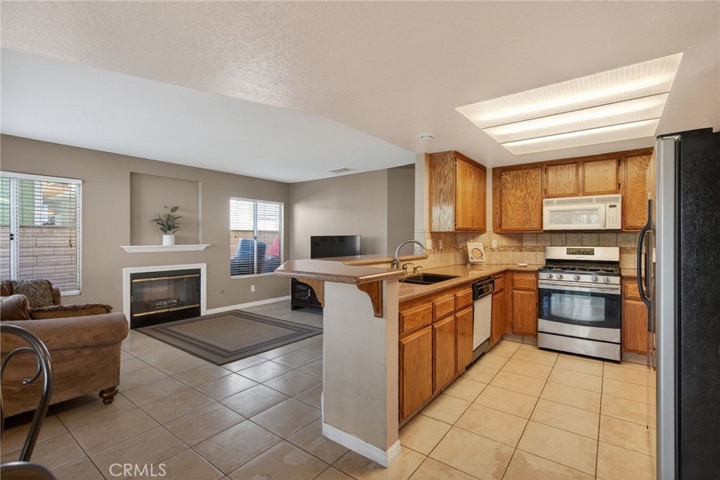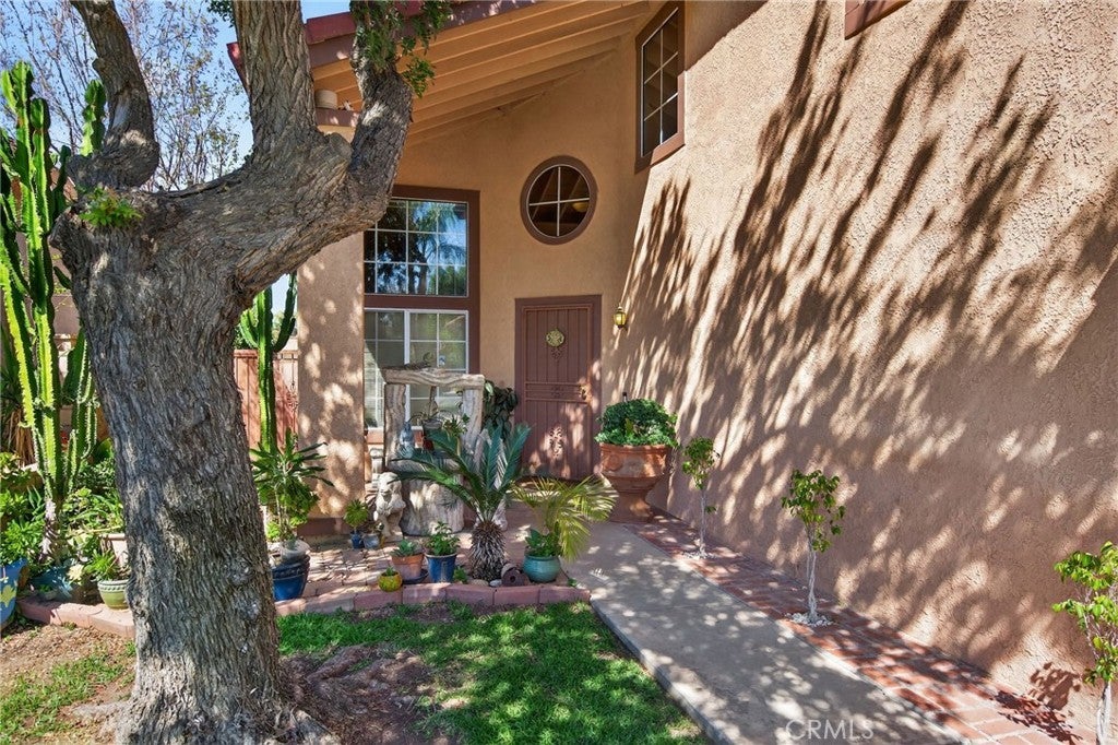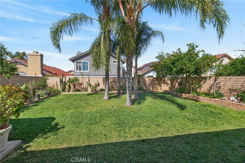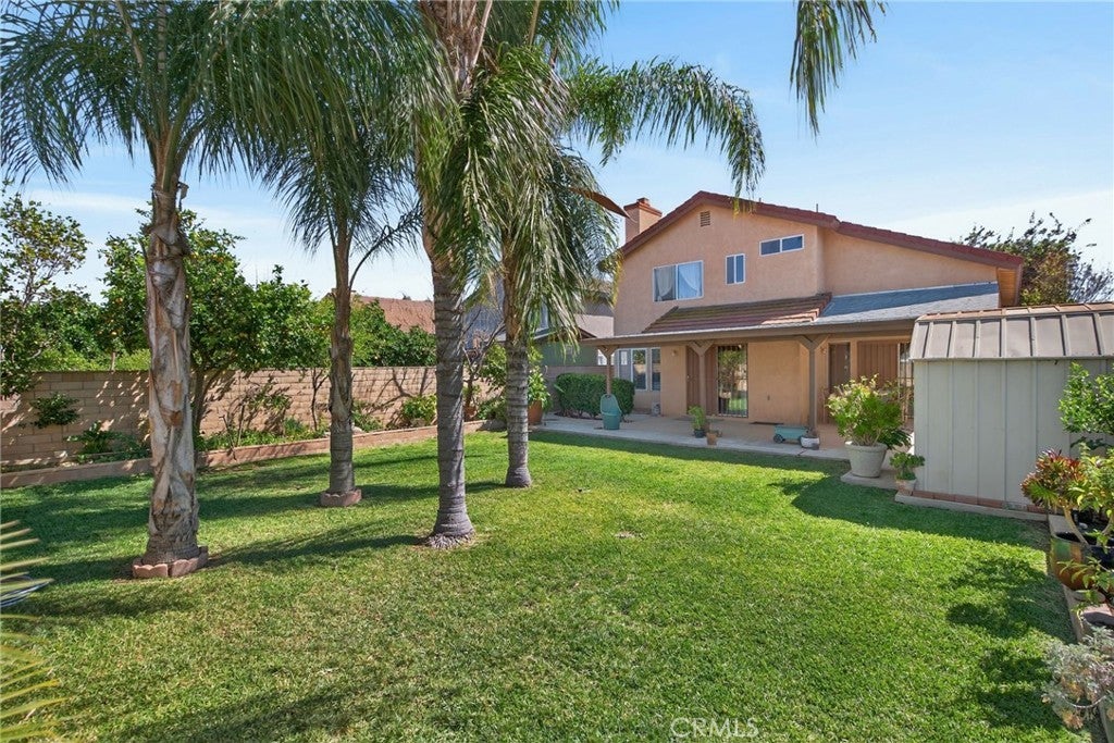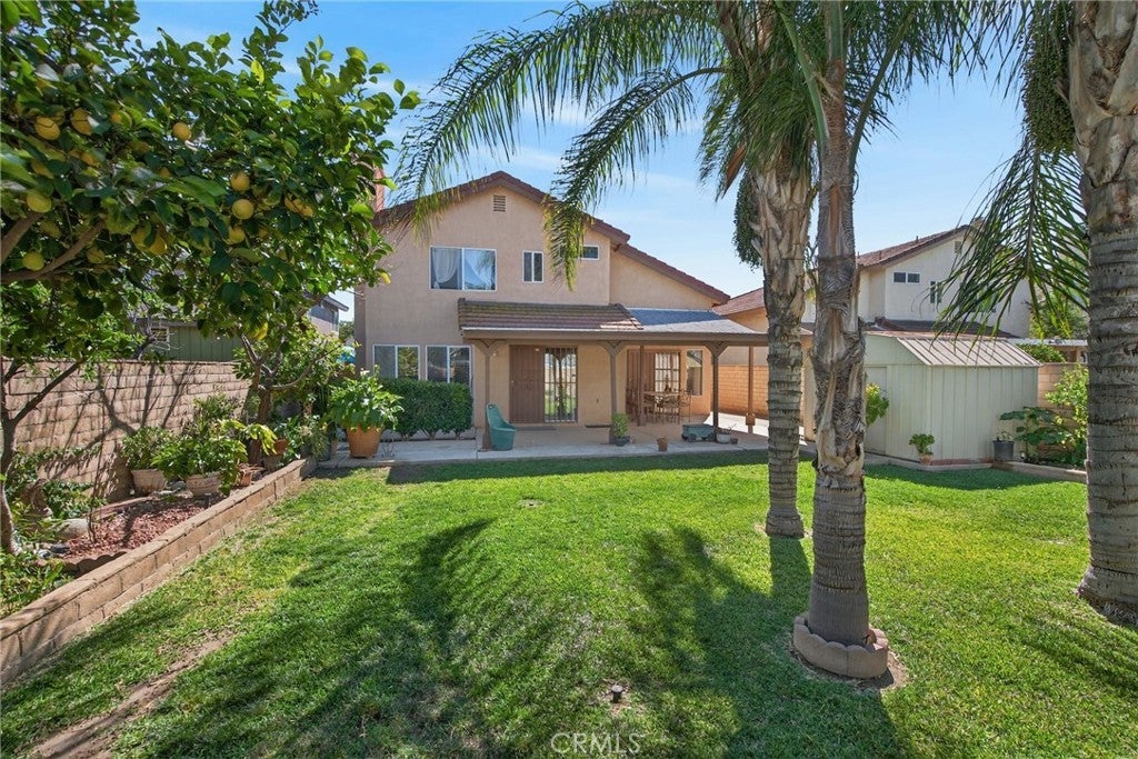 Welcome to this beautiful two-story home, offering fantastic curb appeal with its lush lawn and mature landscape. This inviting property blends comfort, space, and functionality—perfect for families, first-time buyers or anyone seeking a warm and welcoming home. Step through the front door into an open and airy layout featuring soaring vaulted ceilings, large picture windows and neutral tile flooring that flows throughout the main living areas. The formal living and dining rooms offer an impressive sense of space—ideal for gatherings. The kitchen has an abundance of cabinets, granite counters, tile backsplash, a gas range, microwave, overhead lighting for a bright workspace and a eat-in kitchen leading to the backyard patio. The functional layout makes meal prep easy and enjoyable. A convenient breakfast bar creates a seamless flow for socializing and serving. The cozy family room includes a gas fireplace and generous wall space for seating and media setup, making it the perfect spot to unwind. Multiple windows overlook the backyard, enhancing the home’s open and connected feel. A downstairs bedroom and bath is perfect for guests. Upstairs, the primary bedroom is a relaxing retreat with warm, inviting tones, vaulted ceilings, soft natural light and an en-suite bath. The three additional secondary bedrooms offer flexible space ideal for family or home office needs. Step outside to a beautifully maintained backyard complete with a large covered patio ideal for outdoor grilling and al fresco dining. The yard is a peaceful oasis enhanced with palm trees, citrus trees, raised planters, generous lawn space and a private block wall offering endless possibilities for gardening, play, or enjoying year-round sunshine. This home is located near local shopping, schools and commuter routes—offering both comfort and convenience. Don’t miss your chance to make this wonderful home your own!