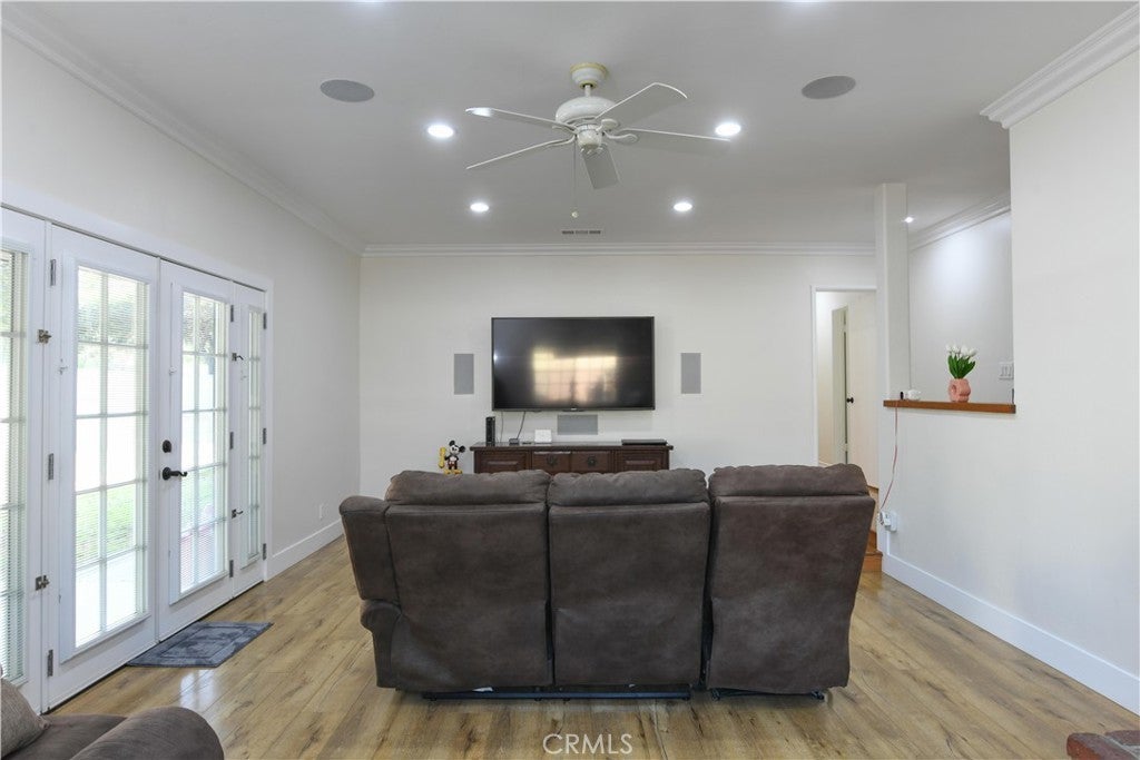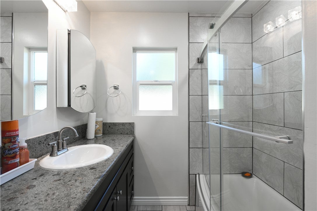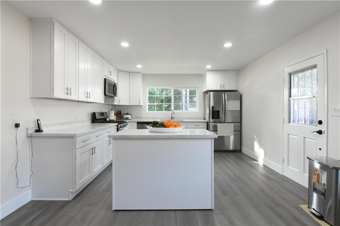 RV Parking! Enjoy brand-new interior paint and a beautifully remodeled kitchen featuring new flooring, shaker-style cabinets, updated counters, inset and overhead lighting, plus a center island and stainless-steel appliances, including gas range/oven, dishwasher, and microwave. A cozy living room offers a welcoming fireplace and an energy-efficient ceiling fan, with an adjacent dining area for easy entertaining. Both bathrooms have been tastefully upgraded with tile flooring, new enclosures, updated fixtures, and modern vanities. The primary bedroom includes wood floors, double closets, a ceiling fan, and a stylish barn door leading to the ensuite bath. Additional bedrooms are generously sized and share the refreshed full hall bath. Central heat and air conditioning and newer windows. French doors open to a covered patio and a spacious, block-walled backyard complete with fruit trees; citrus and avocado plus a horseshoe pit for outdoor fun. 2 Car garage plus the extra-wide concrete driveway and gated RV parking provide excellent convenience and flexibility.