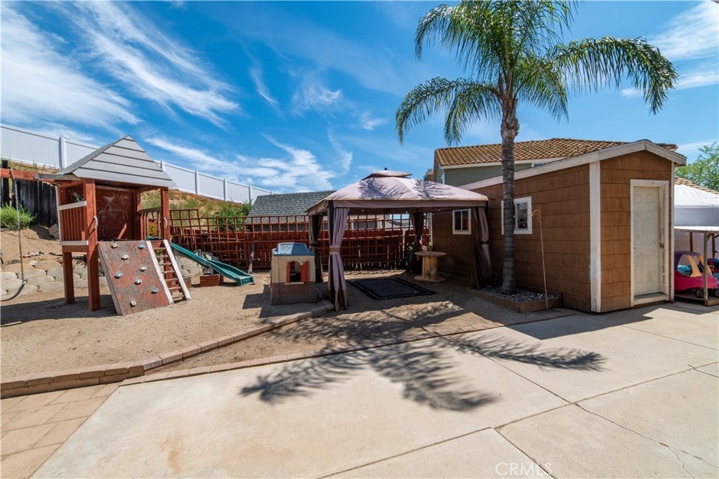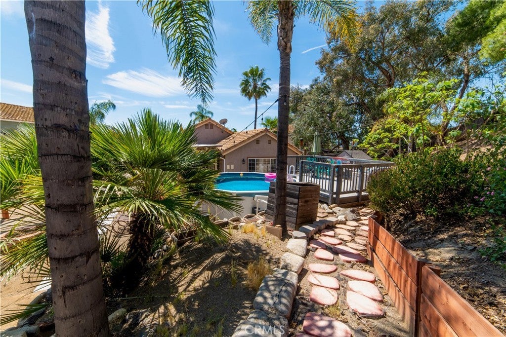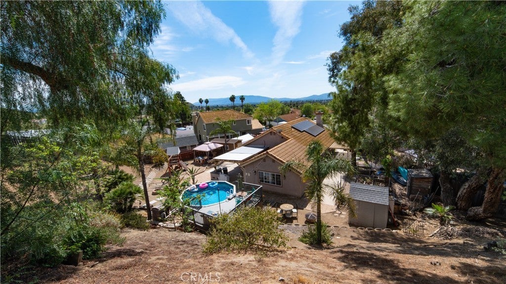 Well maintained pool home with upgrades and custom features! Sprawling view of Temecula Valley and Palomar Mountains! Great Family Home! Above ground pool with custom deck the backyard has many amenities including: a playground, a bike parking lot, built in firepit, upper mountain platform, workshop and RV/boat parking access on one side, and garden boxes and shed on the other. Vaulted ceilings and crown molding throughout the house. Theres wood flooring, built-in shelving, gas fireplace built-in mantel. red tiled kitchen, with granite counters, stone wall facia, custom cabinet black hardwood flooring, His and her closets, and built-in shelving. newly painted master bathroom with an extra large tub with shower, custom barn door bifold closet, Smart energy efficient thermostat in hallway. Theres a laundry room with hook ups that leads to a garage that is workshop ready.