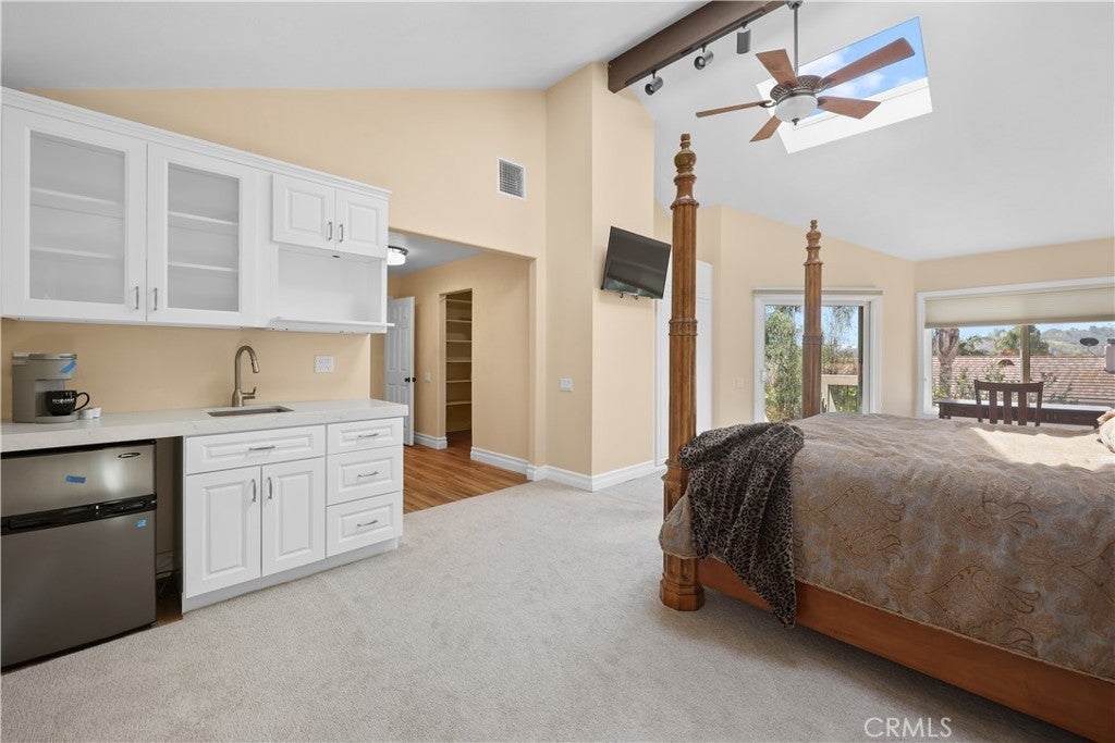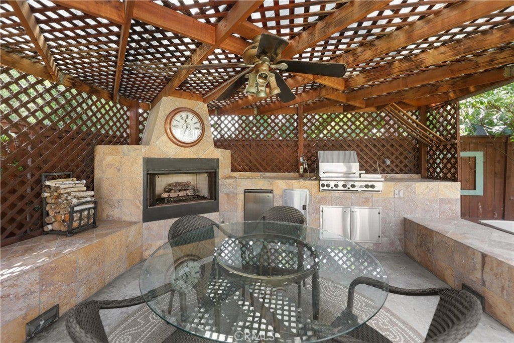Welcome to 5706 E Bryce Avenue, a stunning two-story residence located in the highly sought-after Mabury Ranch community of Orange. Offering approximately 3,200 square feet of beautifully upgraded living space, this exceptional home features four spacious en-suite bedrooms, with the flexibility to add a fifth bedroom. Designed for both comfort and sophistication, the home welcomes you with soaring ceilings, abundant natural light, and a grand staircase that elegantly separates the formal living and dining areas. The thoughtfully designed layout creates a bright and inviting atmosphere throughout. At the heart of the home is a fully remodeled chef’s kitchen, featuring rich wood cabinetry, a Viking gas range, stainless steel appliances, and premium quartzite heat-resistant countertops. The kitchen flows seamlessly into a spacious family room, making it perfect for everyday living and effortless entertaining. The main level includes a private and expansive primary suite, ideal for multi-generational living, a junior dwelling unit, guest quarters, or a home office. This versatile space includes fully renovated bathrooms, kitchenette, laundry hookups, and direct access to the backyard through sliding glass doors. A dedicated indoor laundry room and a powder room complete the first floor. Upstairs, you’ll find three additional en-suite bedrooms, each with ample closet space and beautifully updated bathrooms. Two of these suites include their own kitchenette and washer/dryer hookups, offering incredible flexibility and privacy. The luxurious upstairs primary suite provides a peaceful and refined retreat, with access to backyard thorough the upstairs balcony and staircase which leads to the backyard. Additional highlights include a three-car attached garage, EV charging capability and connection, generous storage throughout, and owned solar for energy efficiency. Step outside into a truly spectacular backyard oasis designed for entertaining and relaxation. This gardener’s haven features lush landscaping, a Bermuda lawn, mature fruit trees, and multiple areas for gathering. Enjoy outdoor living at its finest with a built-in Wolf grill, fireplace with fan, dining area, and spacious lounge spaces—perfect for hosting or unwinding under the stars. Ideally located near parks, hiking trails, and top-rated schools, this home offers the perfect blend of elegance, functionality, and lifestyle in one of Orange’s most desirable neighborhoods.