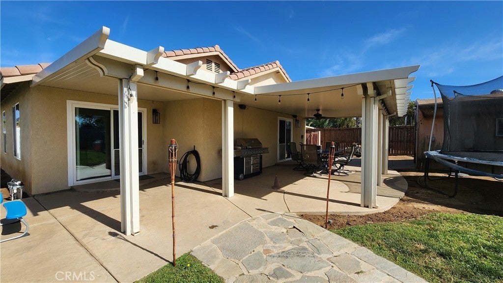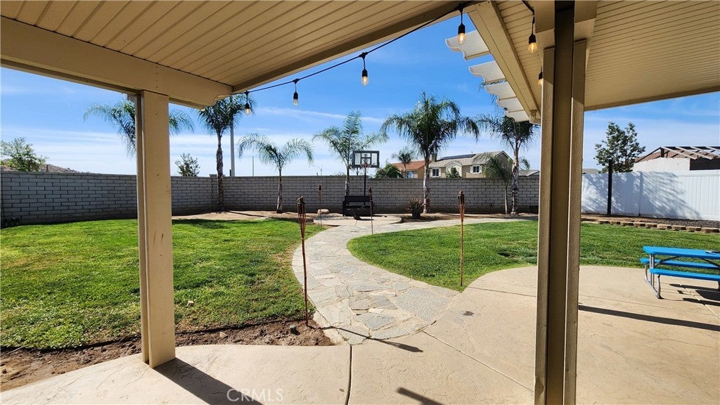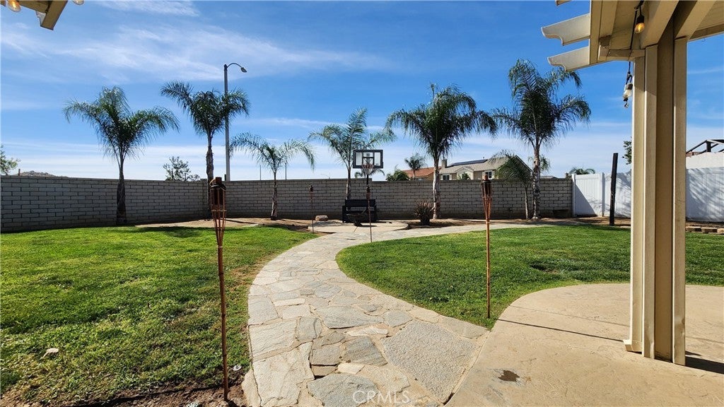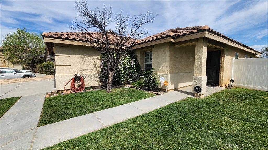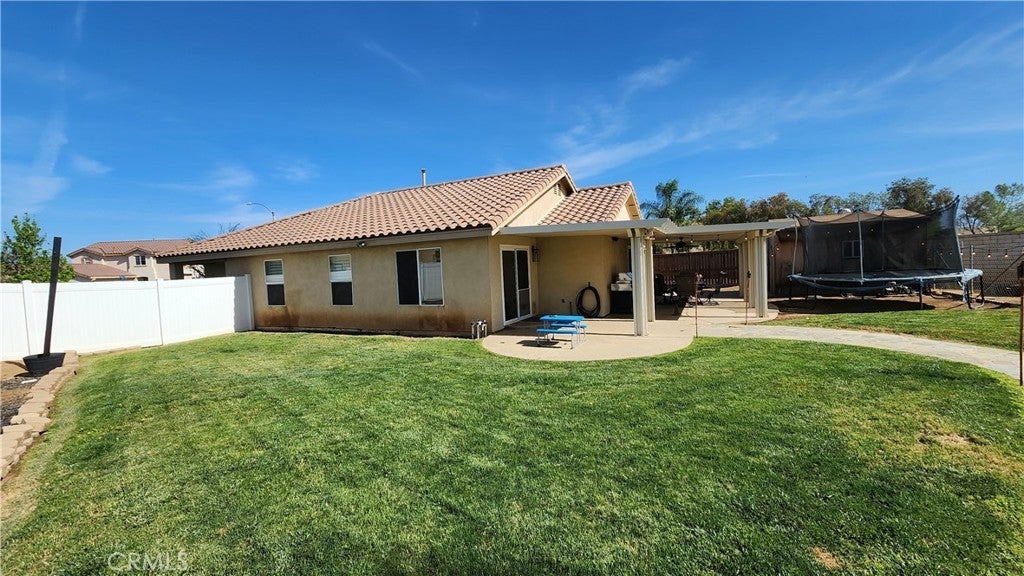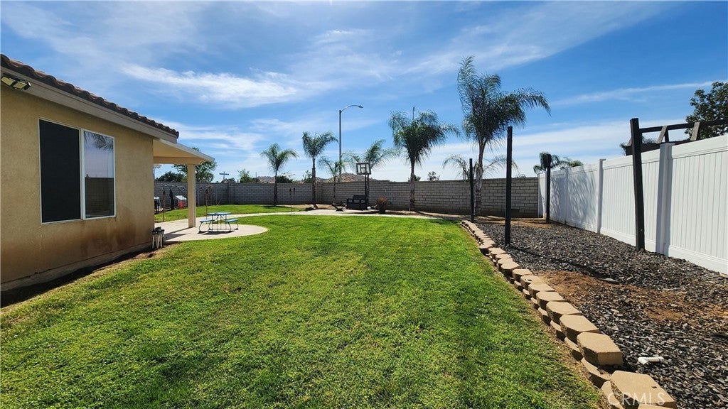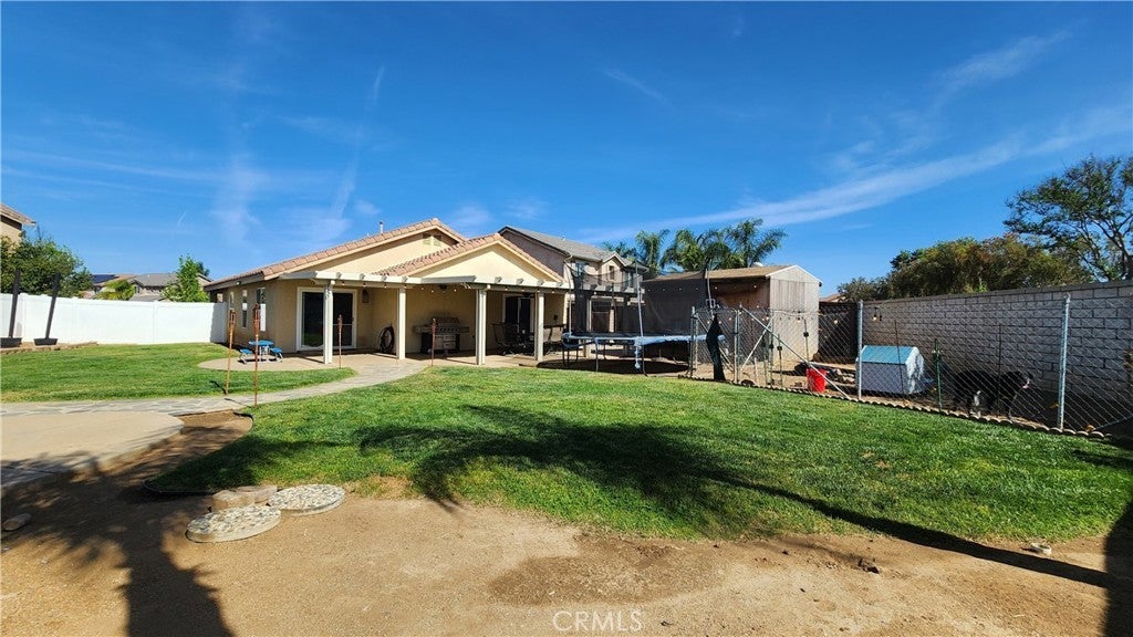 Come and take a look at this beautiful single story home featuring 4 Bedrooms and 2 Full Baths. It has one of the largest lots in the neighborhood with approximately 10,018 sq.ft., with most of the space in the back yard. The big yard has potential for a possible ADU or home addition in the future. As you enter the home, you are greeted into the living room, followed by the kitchen and dining area towards the back. This home has spacious bedrooms; Featuring a Primary Suite with double doors exiting to the back yard. The primary private bath has dual sinks. The kitchen has lots of cabinet space, a pantry, built in dishwasher and microwave. Indoor laundry room with storage cabinets. Several modern ceiling fans. Central air conditioning and heat. The two car attached garage has an automatic door opener. This home has no neighbors to the rear giving you more privacy. Covered Alumawood patio for your afternoon and weekend relaxation. Storage shed for those extra items. A good portion of the fence is block wall. Tile Roof. Several parks and walking & bike trails are within walking distance; including a dog park. The schools are very close, elementary, middle school and high school all within a short distance. Lake Perris recreation area is about 5 minutes away. Shopping centers close by as well. Excellent Location !!! Seize the opportunity and lets make this your next home.