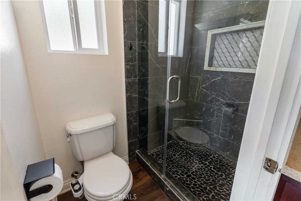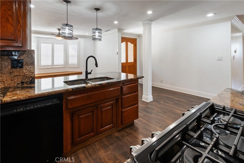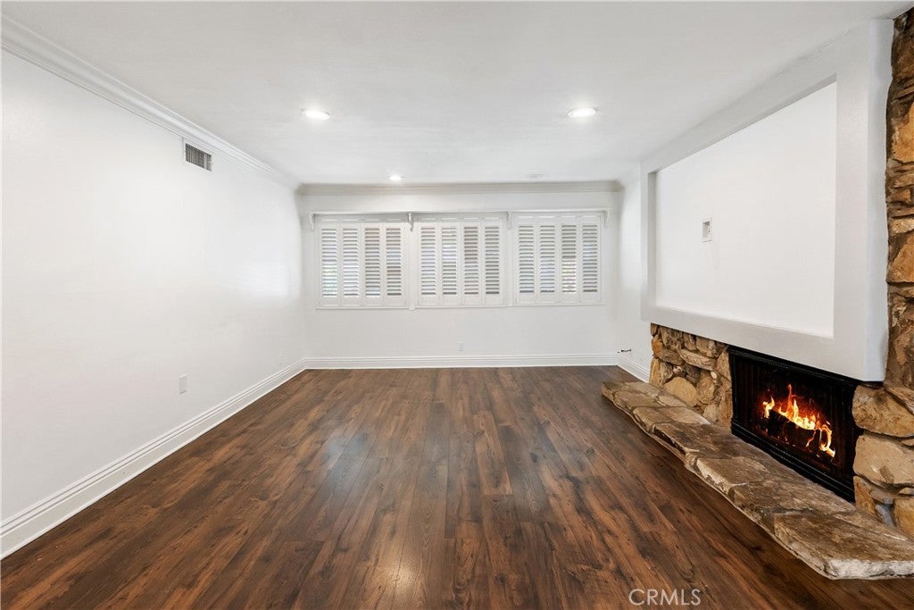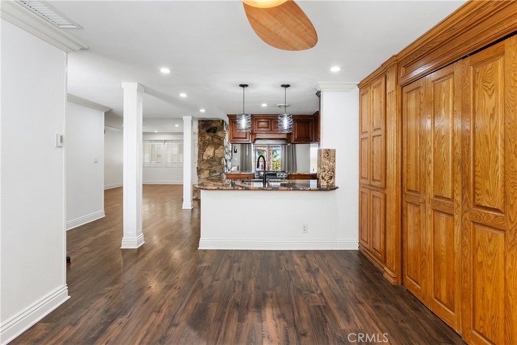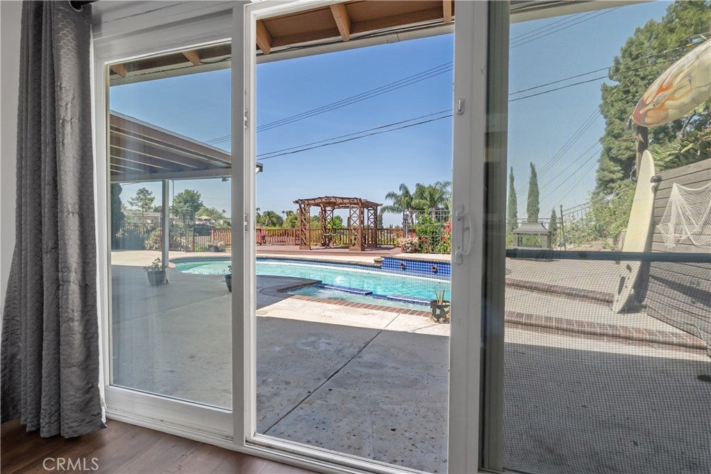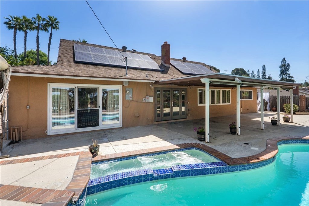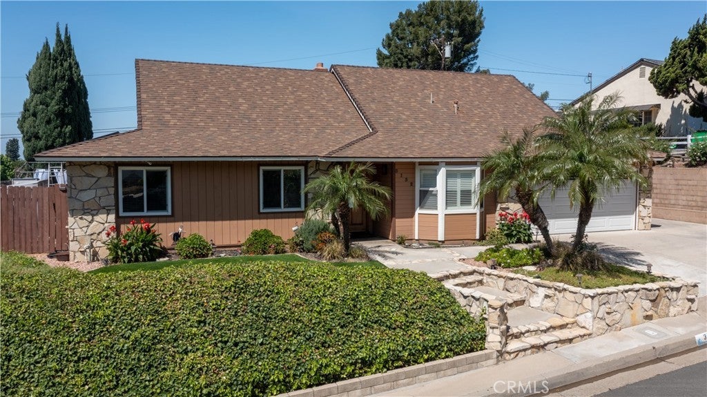 A rare opportunity to own a turnkey, design-forward home in a highly sought-after community! This stunning single-story 4 bed, 2 bath home has been completely remodeled with exquisite detail. The open-concept layout seamlessly blends luxury and functionality. Exceptional curb appeal sets the tone with a striking flagstone façade, complementary custom built-in planters, and artificial turf. Inside, warm walnut-toned laminate flooring, recessed lighting, custom trim, and elevated finishes flow throughout. The living room is anchored by a natural gas fireplace and is pre-wired for media—perfect for both relaxing and entertaining. The dining area features a built-in bar with seating and dual French doors with sidelights that overlook the resort-style backyard, creating an ideal indoor-outdoor connection. The fully upgraded kitchen is a true showpiece, complete with custom cabinetry, granite countertops in a desert canyon sunset-inspired palette, breakfast bar, breakfast nook, sleek stainless steel appliances including a built-in microwave, freestanding range, wine fridge, and designer pendant lighting. The floor plan is ideal, with common areas at the heart of the home and sleeping quarters on each wing. Three generously sized bedrooms offer closet built-ins and dual-pane windows that fill each space with natural light. A shared bath features a custom vanity with copper basin sinks, oil-rubbed bronze waterfall faucets, smart mirrors, and a tub/shower combo with complementary hardware and glass doors. The primary suite is a tranquil retreat with sliding door access to the backyard. The ensuite includes a black marbled tile shower with custom niches and glass doors, a separate vanity area with a raised bowl sink, two-tone cabinetry, and a walk-in closet. The resort-style backyard offers a sparkling pool and spa, covered patio, expansive cantilevered deck, basketball court, curated landscaping, and ambient lighting—perfect for entertaining or unwinding under the California sun and star-filled skies. The lower level features producing fruit trees, including citrus varieties, and a versatile greenbelt space. Additional highlights include an attached garage with direct access, built-in cabinetry, workbench, overhead storage, and convenient RV parking. Ideally located near world-renowned attractions such as Angel Stadium, Honda Center, Disneyland; plus shopping, dining, and freeway access, this home offers the best of Southern California living.