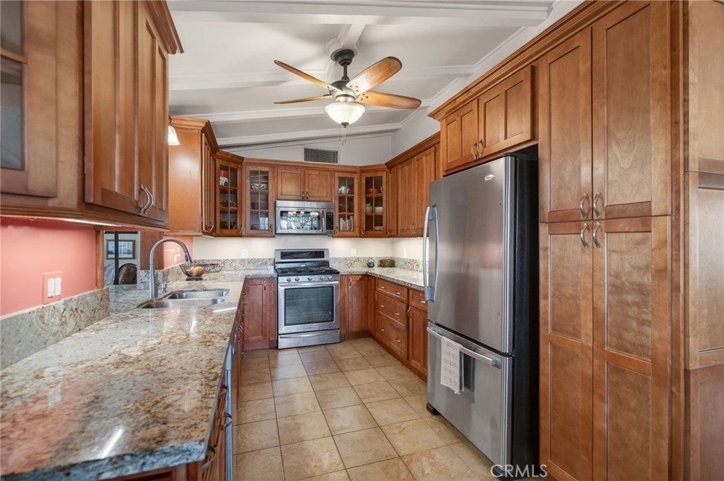 • Interior FeaturesBeamed Ceilings, Breakfast Bar, Ceiling Fan(s), Separate/Formal Dining Room, Granite Counters, Recessed Lighting, Storage, All Bedrooms Down, Bedroom on Main Level, Galley Kitchen, Main Level Primary, Primary Suite, Workshop