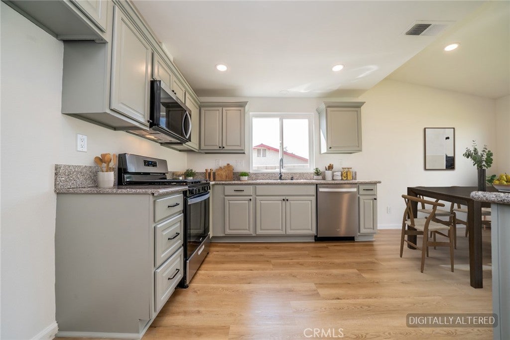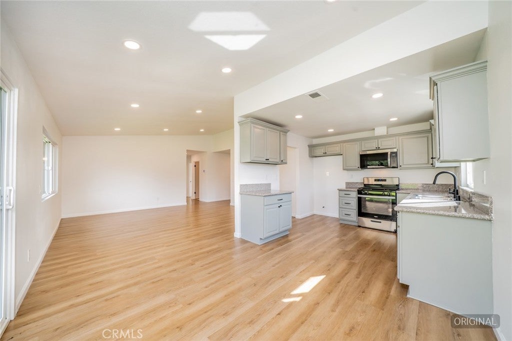 Welcome to this beautifully renovated 3-bedroom, 2-bathroom single-family home, ideally situated on a spacious corner lot in North West San Bernardino, just minutes from the Rialto border and located within the Rialto School District. Perched in an elevated position on Terrace Rd., this property offers stunning front yard views of the canyon below, surrounding mountains, and twinkling city lights. Step inside to discover a thoughtfully updated interior featuring new laminate flooring throughout the main living areas, plush new carpet in the bedrooms, and stylish tile flooring in the bathrooms. The home has been refreshed with new interior and exterior paint, modern light fixtures, all new windows and sliders as well as recessed lighting that creates a bright and inviting atmosphere. The kitchen and living spaces are complemented by brand-new stainless-steel appliances, updated plumbing fixtures, and a functional layout designed for comfortable everyday living. Both bathrooms have been upgraded, including a new double-sink vanities with updated countertops and refreshed finishes. Major system upgrades provide peace of mind, including a new HVAC system, new water heater, dual-pane windows, a new patio doors, and a new roof layer. Additional improvements include new interior and exterior doors, closet doors, and a new garage door. Outside, the large corner lot offers added privacy and versatility, with RV parking, refreshed landscaping, irrigation, lush green lawn in front and back and a gated large side yard—perfect for outdoor enjoyment or future possibilities. Conveniently located near shopping, dining, and commuter routes, this move-in-ready home combines modern upgrades, scenic views, and a prime location. Don’t miss this exceptional opportunity!