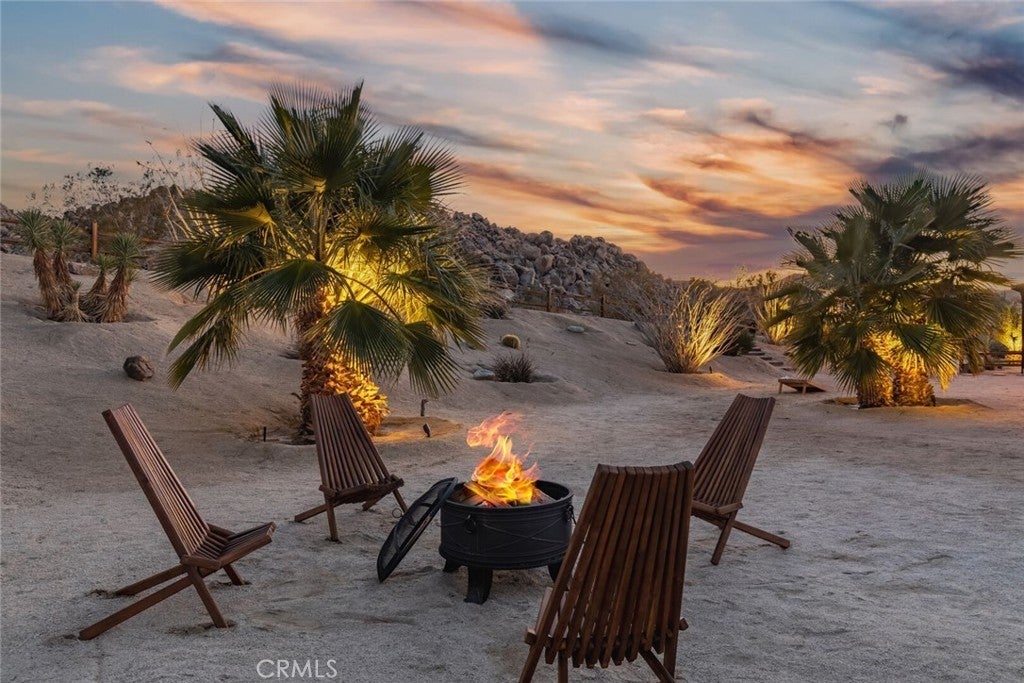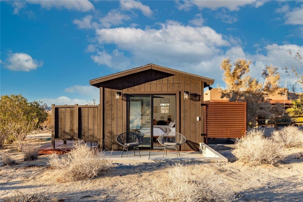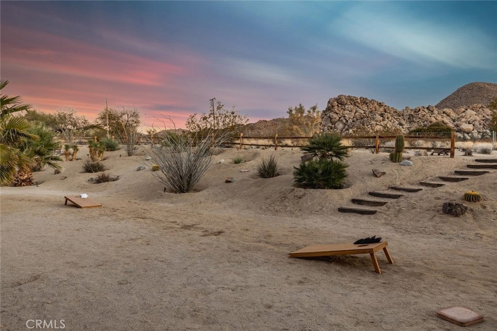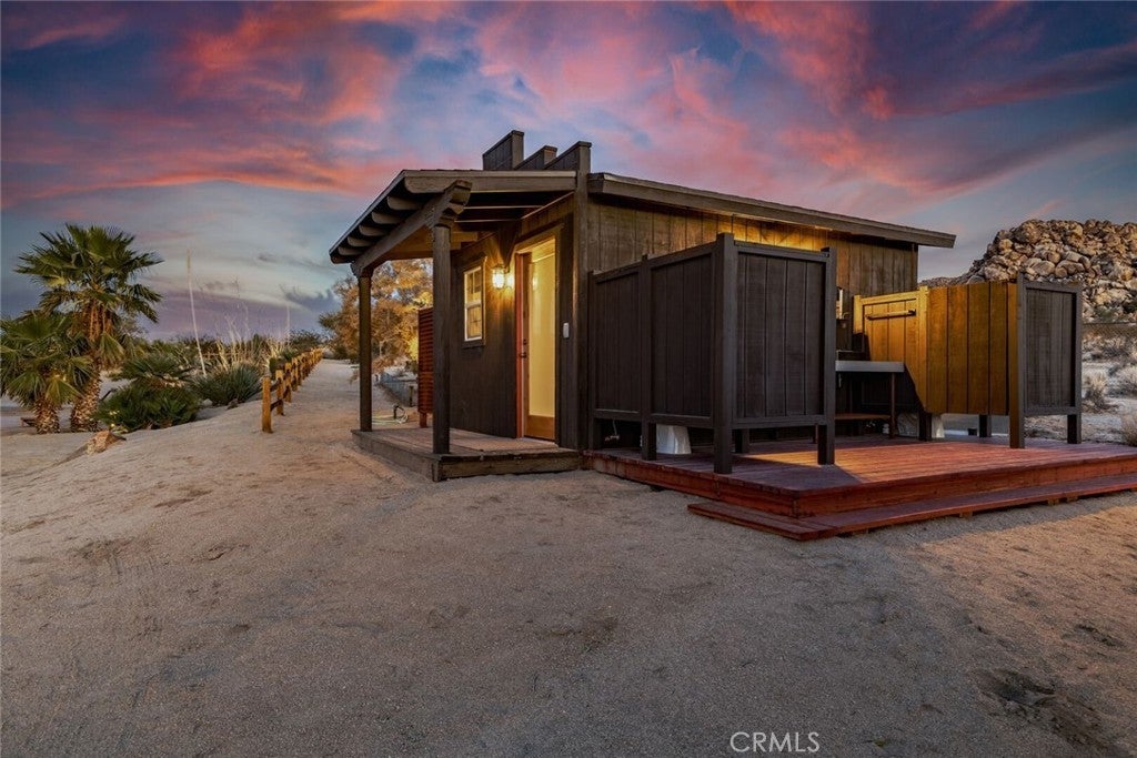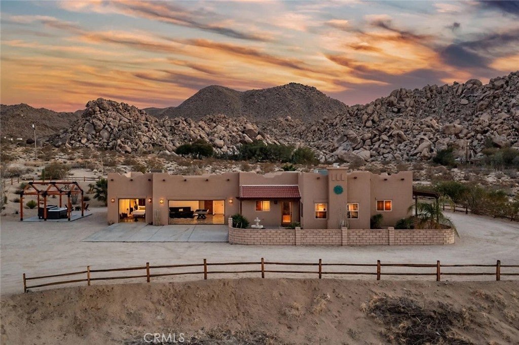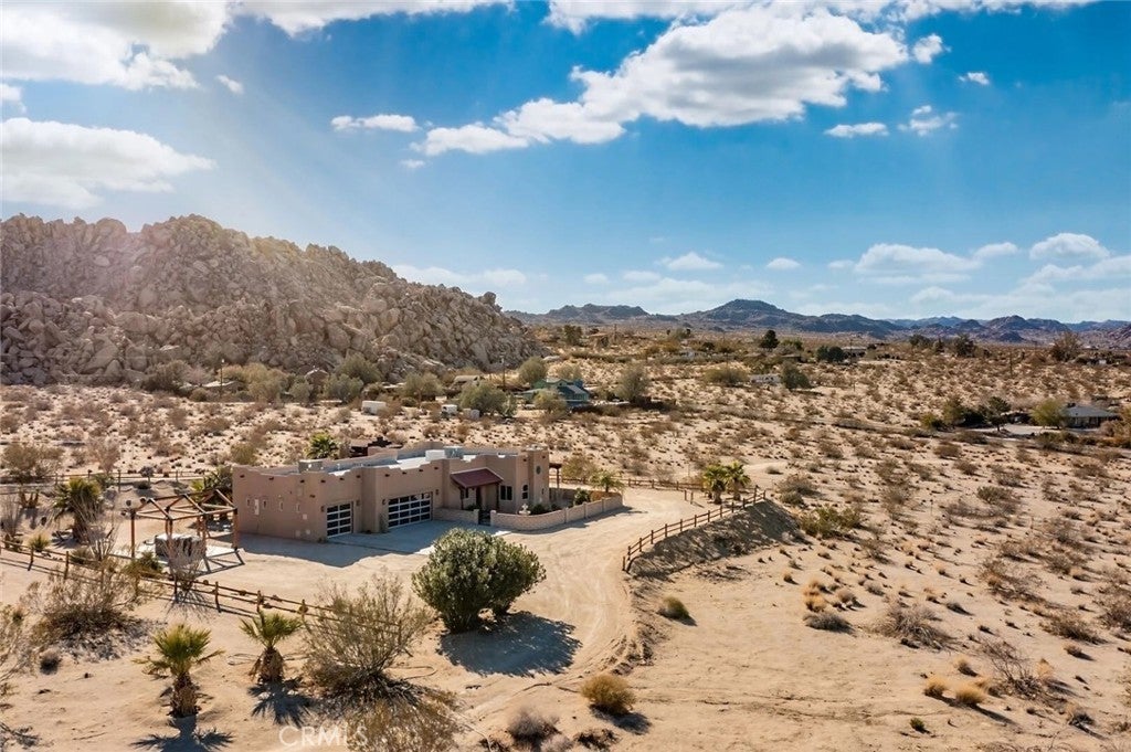 CASA MILLA: Tucked up near Joshua Tree National Park, this splendid property offers wilderness hikes from the backdoor and views of nearby boulder mountains from the back porch. Santa Fe style estate features panoramic views of the Park to the south, sweeping views of the ancient dry lakebed below to the north, and breathtaking sunsets over the mountains of Big Bear to the west. Spread out over 3 bedrooms, including a primary suite offers an ensuite bath, open living areas, in addition to a workspace, and private outdoor access. Active furnished, turnkey Airbnb. Management in place. Exterior includes a spa, firepit, BBQ, outdoor shower and two outdoor bathrooms with a double vanity, set against sprawling desert landscaped grounds. Ideal for large families, entourage, or guests, the home also features a large game room (pool table, TV and oversized games), as well as ample seating for indoor/outdoor dining. For those looking for a workcation, you'll find 3 bedrooms perfectly outfitted with desks/work spaces. Located in the premier South Joshua Tree area and only minutes to downtown Joshua Tree. Access to Interstate-10 leading to LA and Palm Springs International Airport.