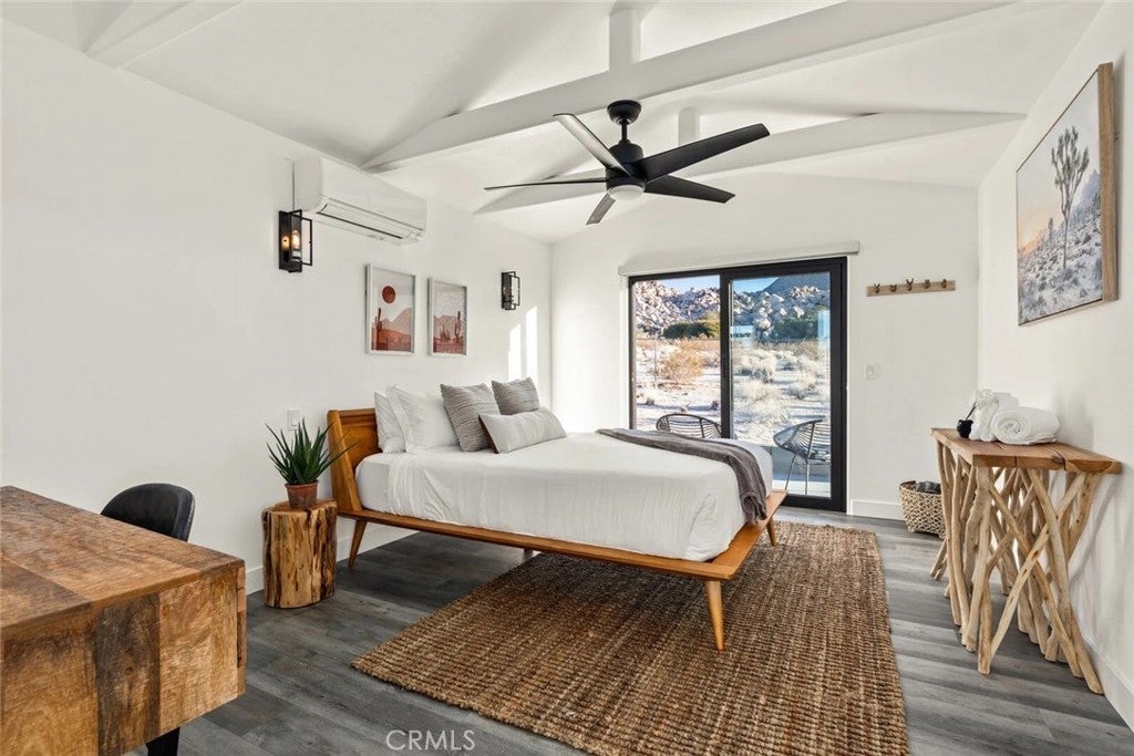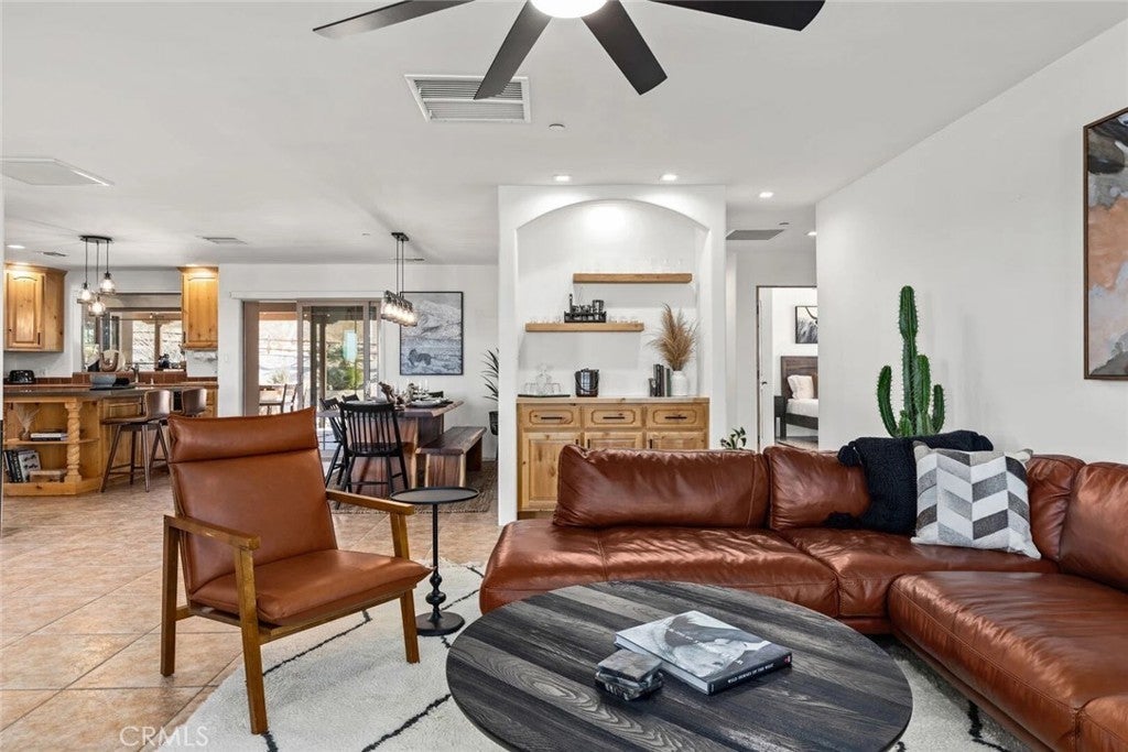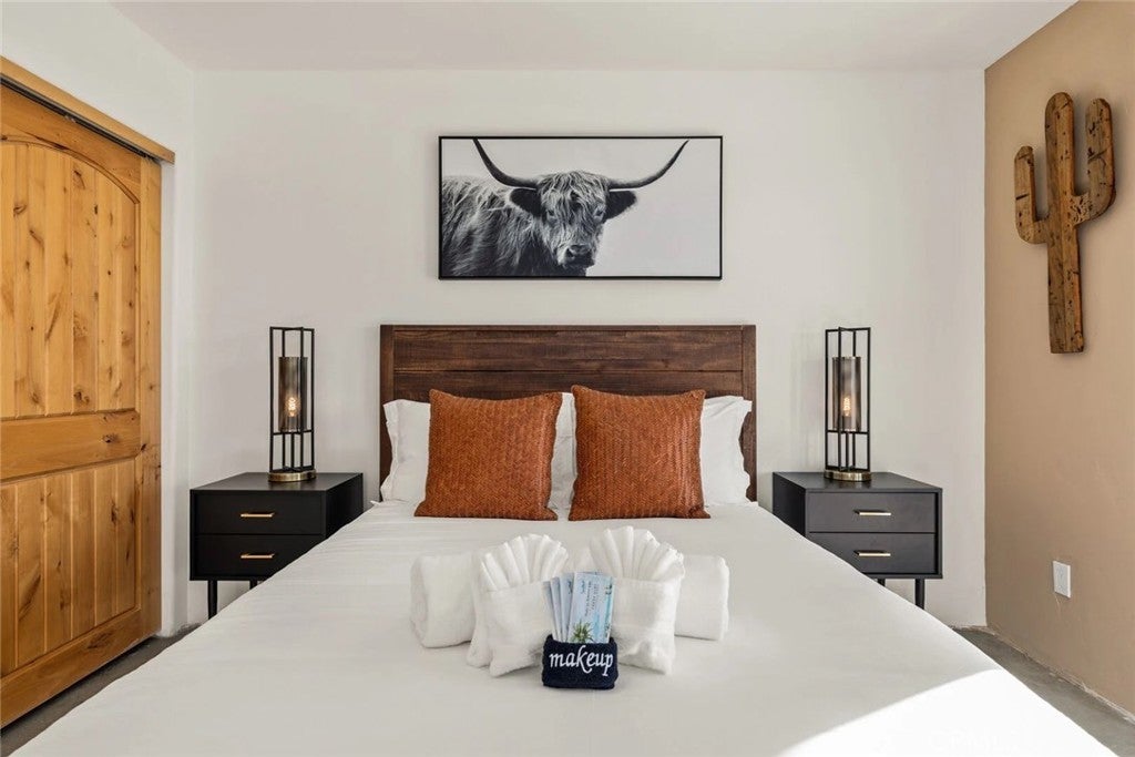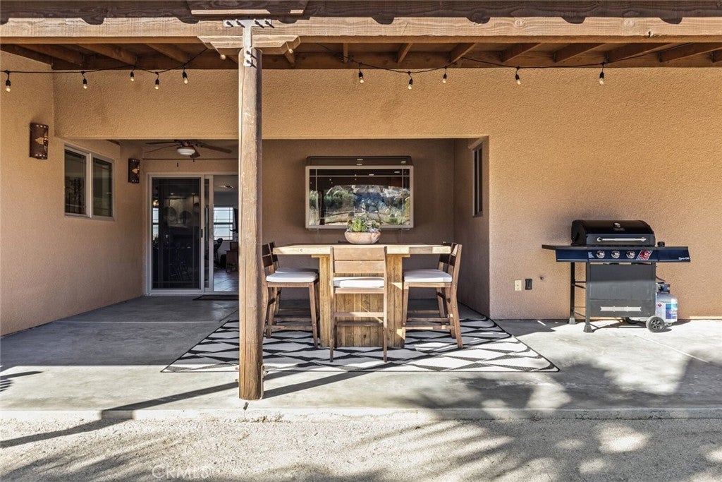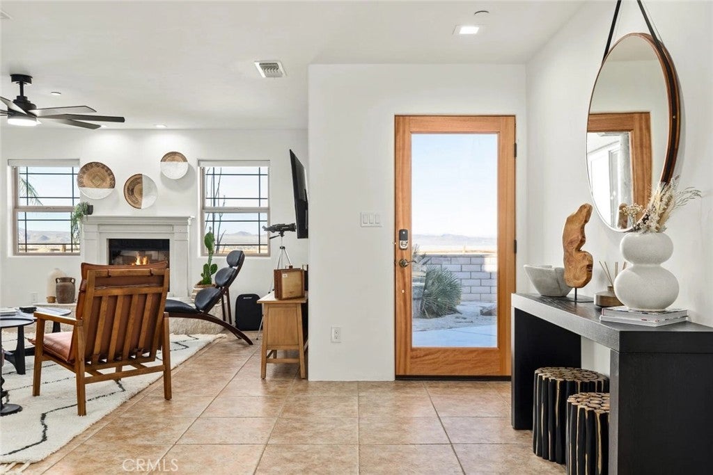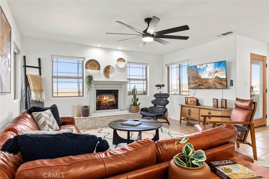 CASA MILLA: Tucked up near Joshua Tree National Park, this splendid property offers wilderness hikes from the backdoor and views of nearby boulder mountains from the back porch. Santa Fe style estate features panoramic views of the Park to the south, sweeping views of the ancient dry lakebed below to the north, and breathtaking sunsets over the mountains of Big Bear to the west. Spread out over 3 bedrooms, including a primary suite offers an ensuite bath, open living areas, in addition to a workspace, and private outdoor access. Active furnished, turnkey Airbnb. Management in place. Exterior includes a spa, firepit, BBQ, outdoor shower and two outdoor bathrooms with a double vanity, set against sprawling desert landscaped grounds. Ideal for large families, entourage, or guests, the home also features a large game room (pool table, TV and oversized games), as well as ample seating for indoor/outdoor dining. For those looking for a workcation, you'll find 3 bedrooms perfectly outfitted with desks/work spaces. Located in the premier South Joshua Tree area and only minutes to downtown Joshua Tree. Access to Interstate-10 leading to LA and Palm Springs International Airport.