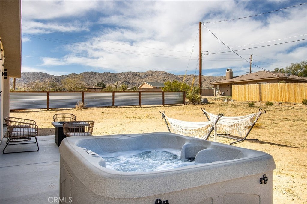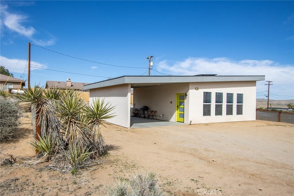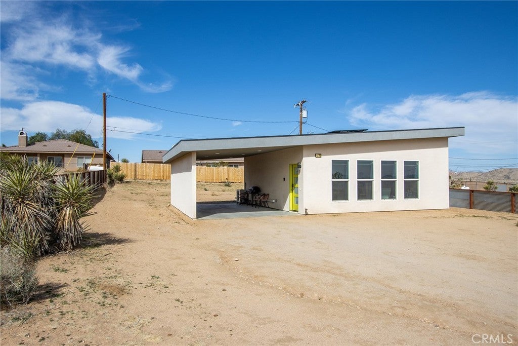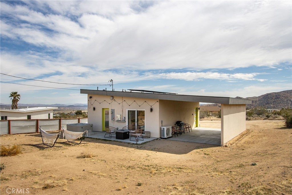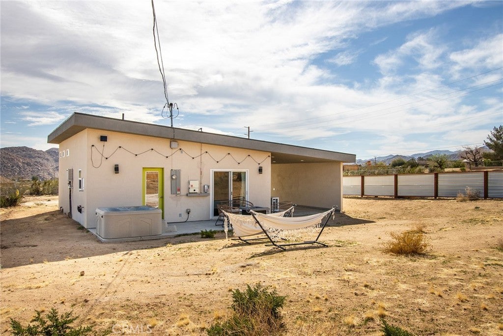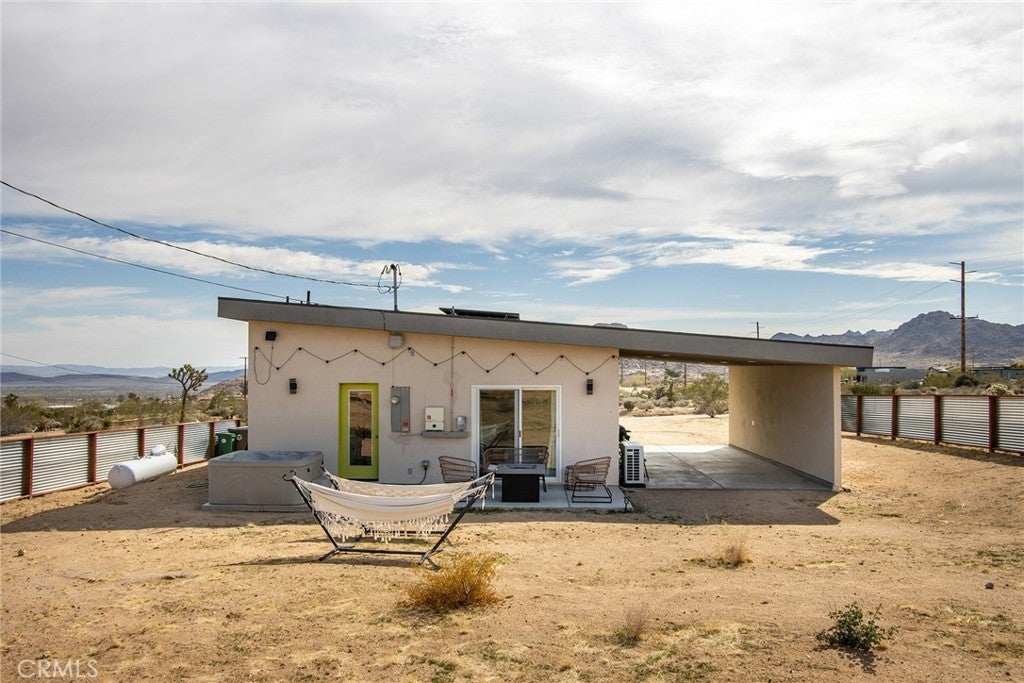 SEE THE VIDEO ABOVE! REDUCED TO SELL! A MUST SEE !! Welcome to this!*PERMITTED ESTABLISHED TURN KEY AIRBNB*BUILT IN 2022! Watch the sun rise and set from Joshua Tree National Park, sitting on your property. Modern Design home with an open-concept living space! Its modern amenities make this property ideal for those looking for additional income, a second home, or a full-time residence. It is a rare gem in JOSHUA TREE for the price! The property features an open floor plan, high-end appliances, ample natural light, and convenient entertainment spaces. The property is situated on a large, fenced lot with a stunning desert landscape and amenities, offering a serene, peaceful, and secluded environment. Also, R.V., ACCESS, PARKING, AND FENCING. This unique, modern home, as cute as a button, offers one bedroom and one bathroom, featuring high ceilings, a neutral color scheme, and abundant views from all windows. Indoor laundry! The kitchen is a chef's dream, equipped with tall white cabinets, granite countertops, and stainless steel appliances. And an area with a private spa fire pit, and a hammock where you can relax, breathe, and stargaze! Huge carport and Solar!. Enjoy a private oasis right in your beautiful backyard. Upon entering this bright and inviting space, an open floor plan will greet you, and the living room is a cozy retreat. These large view windows bathe the room in natural light. BEAUTIFUL modern kitchen. The home has ductless air conditioning and ceiling fans. This backyard is a true vacation retreat, designed for ultimate relaxation and entertainment. Ideally, just minutes from Joshua Tree National Park and Pioneertown for those seeking a peaceful getaway or a wise investment. Located just about 35 minutes from Palm Springs, this home enjoys a cooler, more comfortable climate due to its higher elevation while providing convenient access to the luxury amenities, events, and shopping in Palm Springs. It's the perfect balance of desert living and city convenience, making it attractive to buyers from major cities! It's positioned perfectly for those seeking a peaceful getaway or a wise investment, just minutes from Joshua Tree National Park and Pioneertown. For adventure seekers, Black Rock Canyon and Joshua Tree National Park offer hiking, rock climbing, and a breathtaking stargazing experience. Imagine the awe-inspiring beauty of Big Bear Mountain's breathtaking views and the stunning landscapes of Joshua Tree National Park!