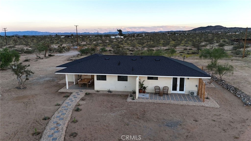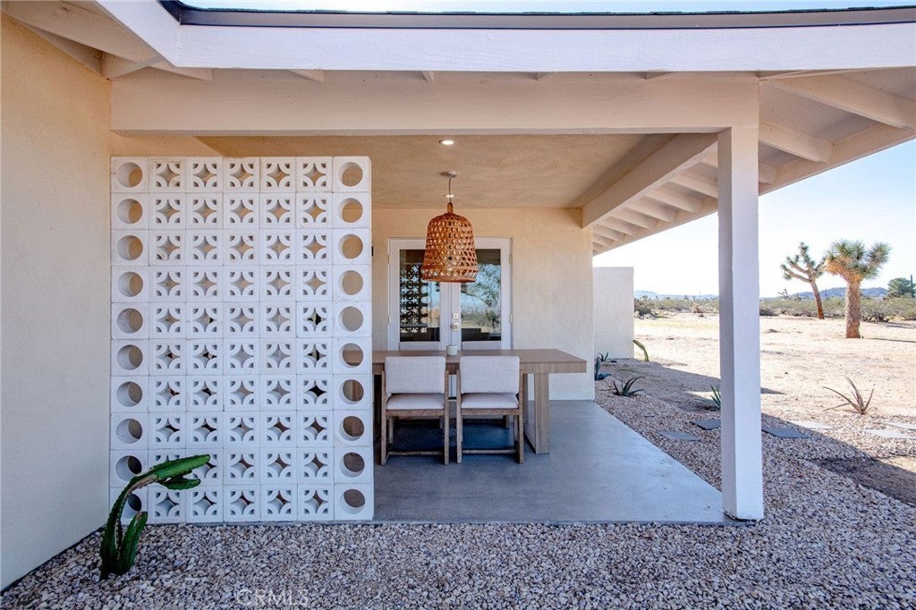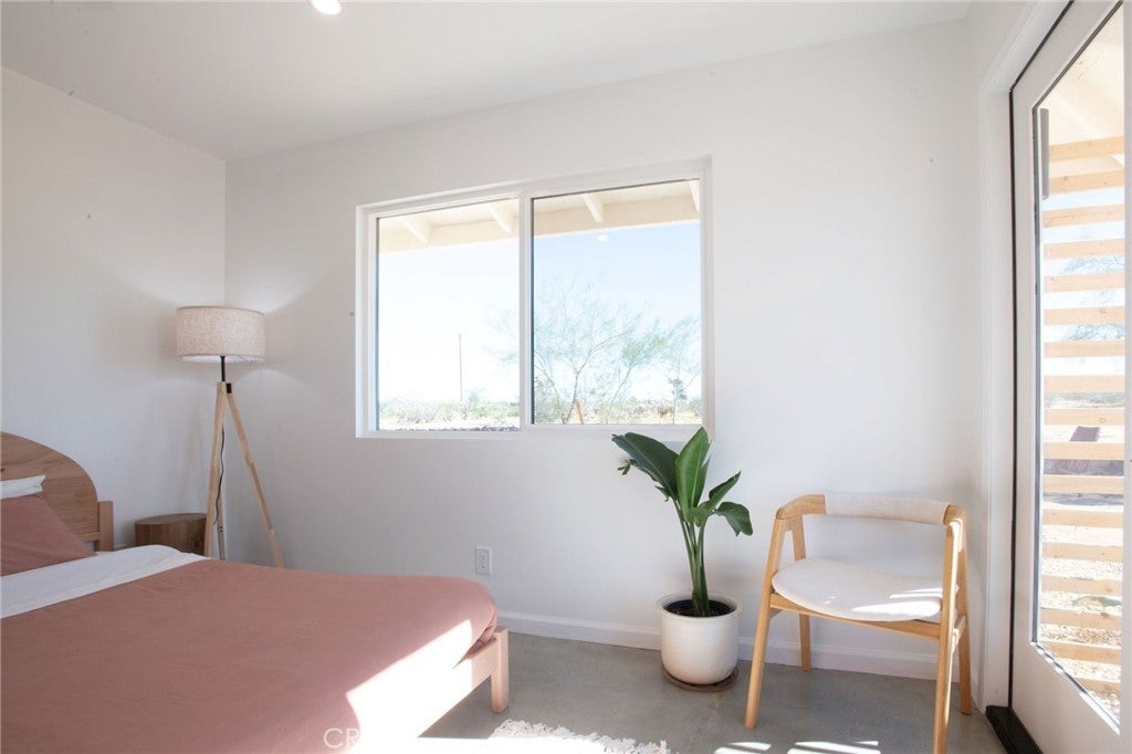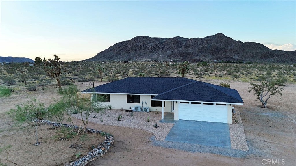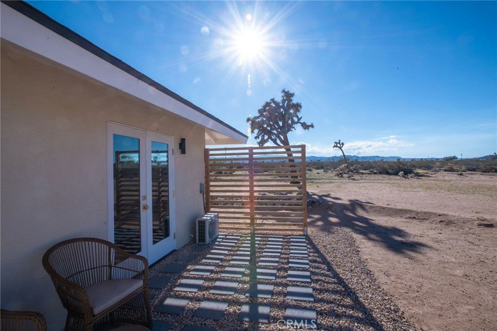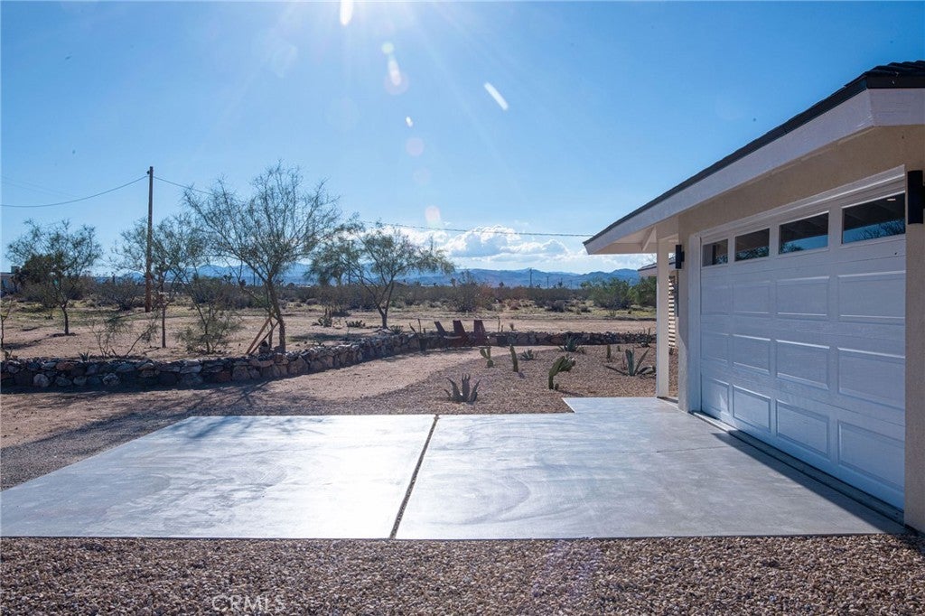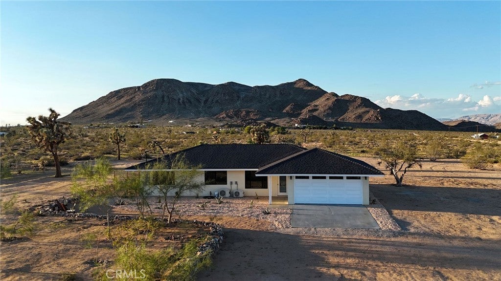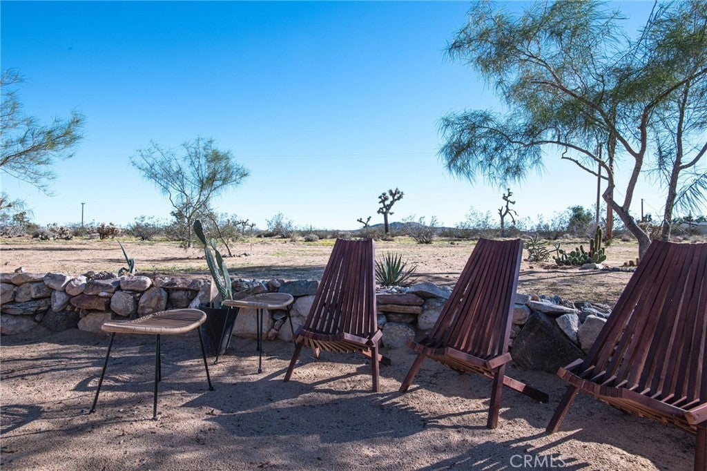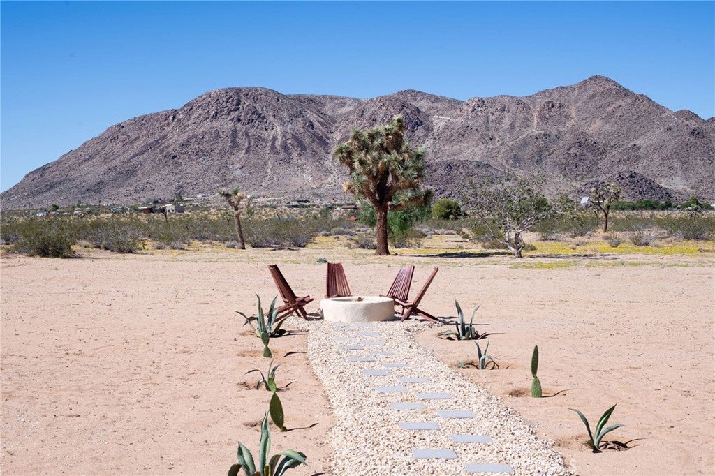 Welcome to 59676 Mitch Rd, where Bohemian Flair meets Desert Elegance. This gorgeous turn-key property has been completely remodeled with every feature intentionally chosen to bring you the perfect airbnb, desert home or weekend retreat. This house showcases 3 bedrooms, 2 bathrooms and 5 ACRES OF LAND with stunning panoramic desert & mountain views. Inside you'll find sleek concrete floors, tasteful decor & furnishings, rounded archways, recessed lighting and large windows that let in an abundance of natural light. The warm and welcoming living room flows effortlessly into the awe-inspiring kitchen and dining area complete with designer-style tile backsplash, bright quartz countertops, beautiful modern cabinetry, high-end FORNO appliances and bar seating. Each bedroom is well appointed with mini-splits for year-round comfortability, closets with custom built-in shelving and 2 of the 3 bedrooms adorn french doors that lead to their own private outdoor patios. Both bathrooms boast spa-like showers with sophisticated tile, glass panels and lovely new vanities with clean, modern finishes. The finished garage has been transformed into the ultimate hangout space equipped with a bar, wine fridge, sink, additional cabinetry, a mini-split and a cozy elevated lounge area (there is even a stacked washer/dryer for added functionality). It doesn't stop there; the serene outdoor living space includes a lovely covered patio for outdoor dining, an outdoor shower with a rainfall shower-head, ample space to entertain or relax around a firepit on a starlit summer night. Not to mention, there is more than enough room to build/expand and/or store all your desert toys! This exquisite property is located close to numerous desert attractions like Lander's famous Goat Mountain hiking trails, Giant Rock, La Copine, The Integratron, and only 15 mins from downtown Joshua Tree but still far enough away to fully immerse yourself in all the peace & tranquility this desert home has to offer. Come take a look & let the desert's allure do the rest. Your new desert home or weekend retreat awaits.