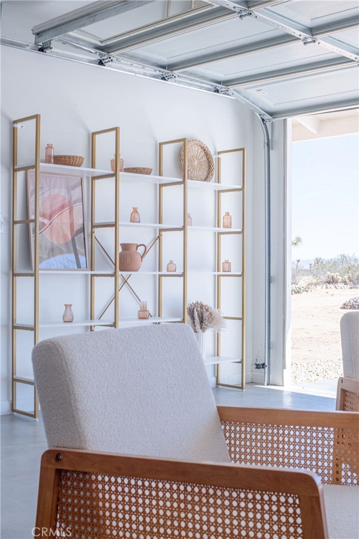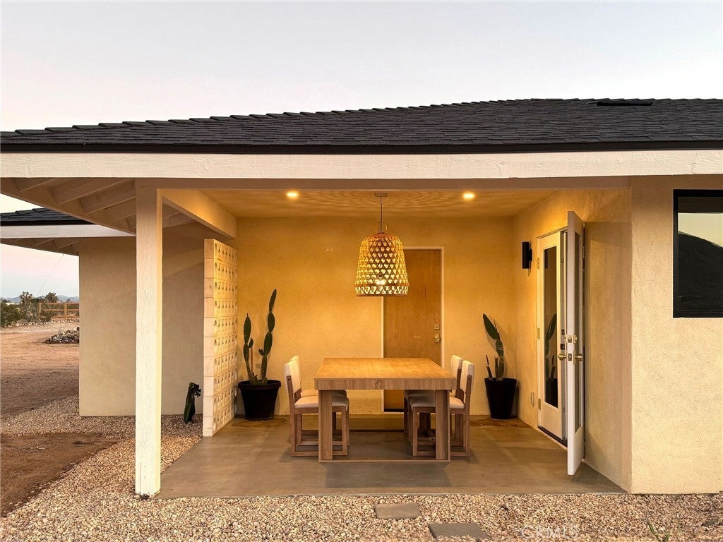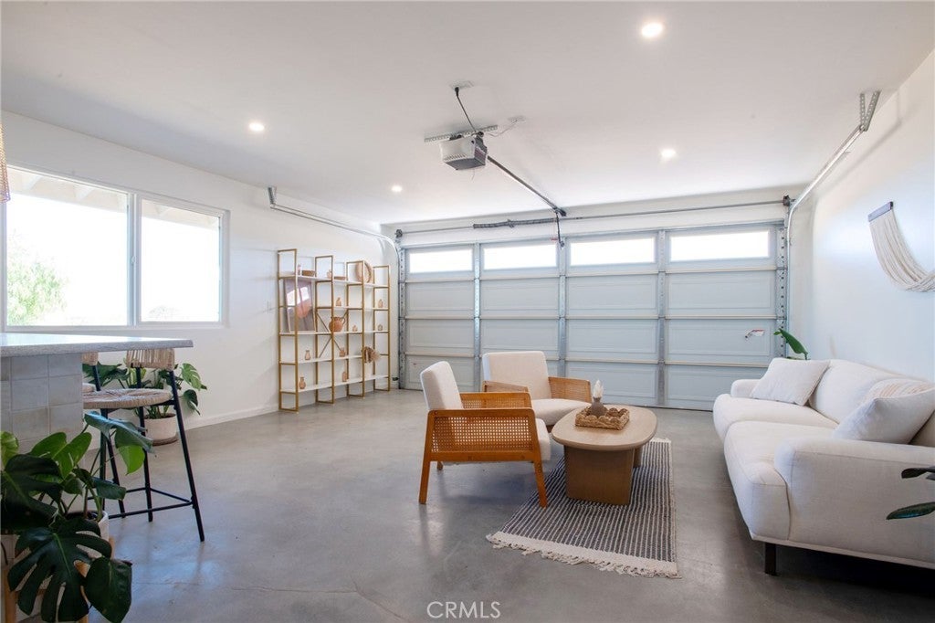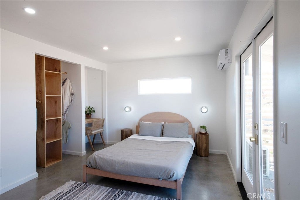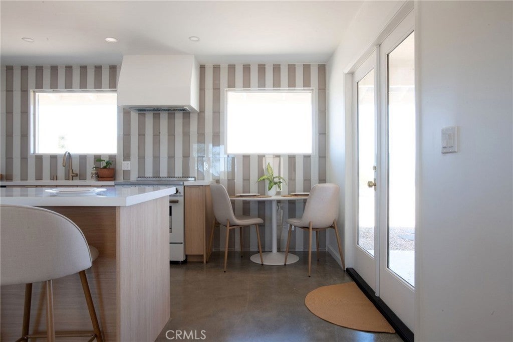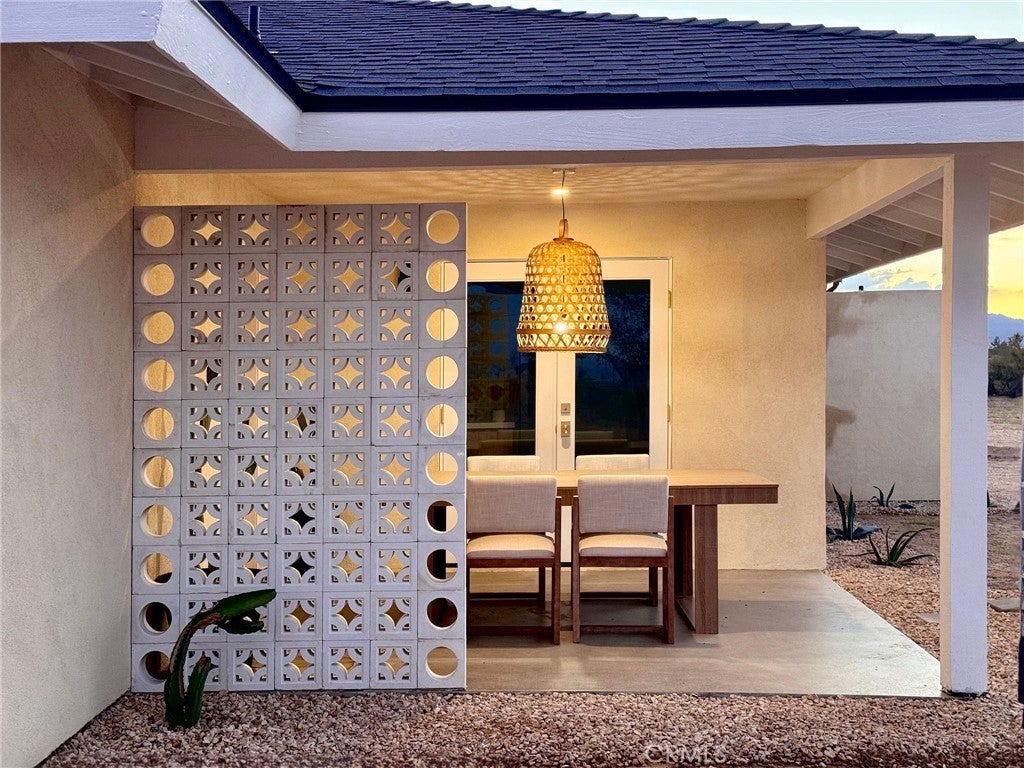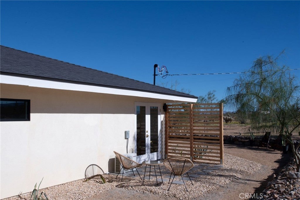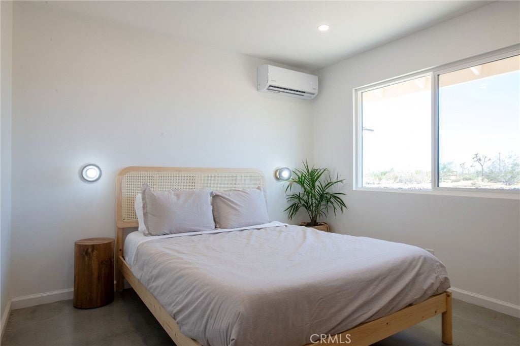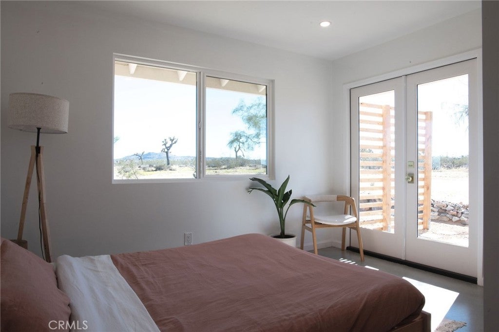 Welcome to 59676 Mitch Rd, where Bohemian Flair meets Desert Elegance. This gorgeous turn-key property has been completely remodeled with every feature intentionally chosen to bring you the perfect airbnb, desert home or weekend retreat. This house showcases 3 bedrooms, 2 bathrooms and 5 ACRES OF LAND with stunning panoramic desert & mountain views. Inside you'll find sleek concrete floors, tasteful decor & furnishings, rounded archways, recessed lighting and large windows that let in an abundance of natural light. The warm and welcoming living room flows effortlessly into the awe-inspiring kitchen and dining area complete with designer-style tile backsplash, bright quartz countertops, beautiful modern cabinetry, high-end FORNO appliances and bar seating. Each bedroom is well appointed with mini-splits for year-round comfortability, closets with custom built-in shelving and 2 of the 3 bedrooms adorn french doors that lead to their own private outdoor patios. Both bathrooms boast spa-like showers with sophisticated tile, glass panels and lovely new vanities with clean, modern finishes. The finished garage has been transformed into the ultimate hangout space equipped with a bar, wine fridge, sink, additional cabinetry, a mini-split and a cozy elevated lounge area (there is even a stacked washer/dryer for added functionality). It doesn't stop there; the serene outdoor living space includes a lovely covered patio for outdoor dining, an outdoor shower with a rainfall shower-head, ample space to entertain or relax around a firepit on a starlit summer night. Not to mention, there is more than enough room to build/expand and/or store all your desert toys! This exquisite property is located close to numerous desert attractions like Lander's famous Goat Mountain hiking trails, Giant Rock, La Copine, The Integratron, and only 15 mins from downtown Joshua Tree but still far enough away to fully immerse yourself in all the peace & tranquility this desert home has to offer. Come take a look & let the desert's allure do the rest. Your new desert home or weekend retreat awaits.