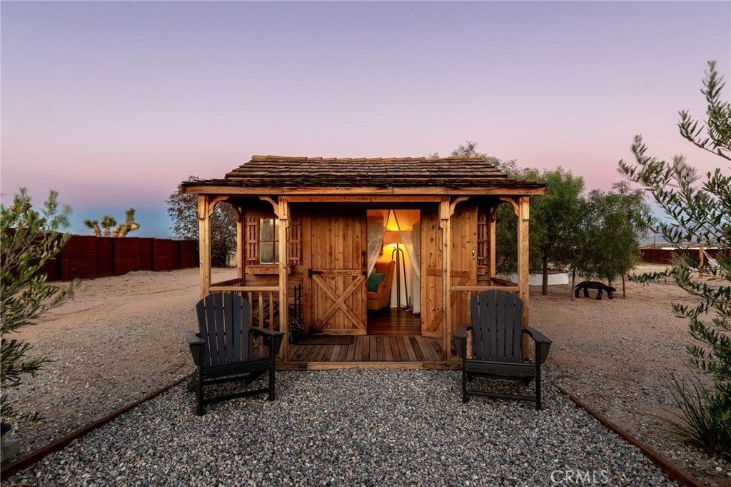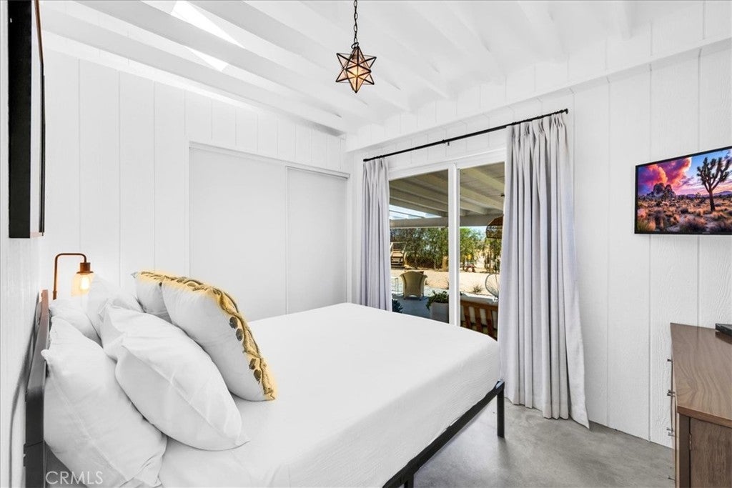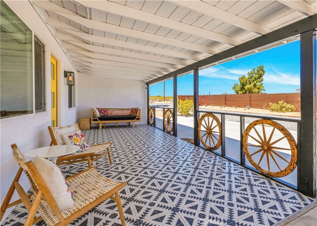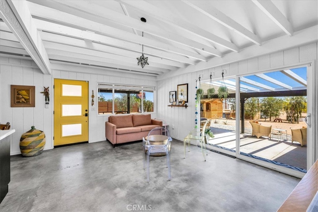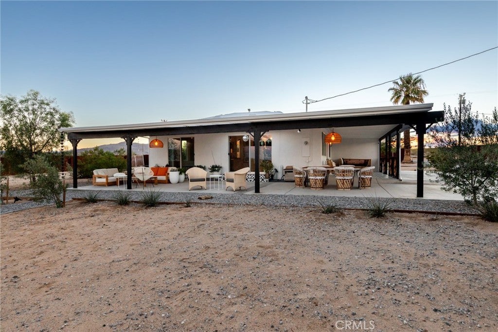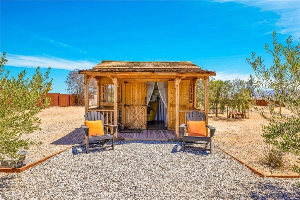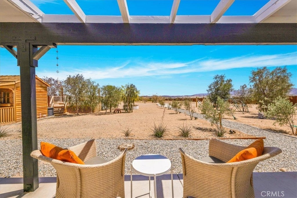 This FULLY FURNISHED 3-bedroom, 2-bath rustic-modern compound rests on 3.51 acres in scenic Joshua Tree. Set on the mesa and fully fenced for privacy, the property offers sweeping views of the surrounding hills and mountains along with a tranquil desert atmosphere. Thoughtfully renovated, the home features polished concrete floors, white wood-paneled walls, skylights, and sliding glass doors in the bedrooms that fill the interiors with natural light. The open-concept kitchen, ideal for entertaining, includes a large island, sleek black cabinetry and fixtures, granite countertops, and a tile backsplash. The adjoining living area with large slider overlooking the backyard is enhanced by vaulted ceilings and exposed beams. Both bathrooms have been stylishly updated with tiled walk-in showers and contemporary lighting. Comfort and efficiency are ensured with Mitsubishi mini splits, upgraded electrical, a new water heater, and full gutters. Outside, a generous covered patio invites relaxation and gatherings, accented with rattan light fixtures and black-and-white Aztec tile at the entry and steps. A detached cedar shed with a covered porch, dedicated power, vinyl flooring, extra fridge, and lighting offers versatile use as an art studio, office, or yoga space. The property also includes an RV electrical hookup, ample parking, and a Tuff Shed for added storage. The L-shaped lot features paved road frontage and a side gate off Shifting Sands Trail—perfect for a potential second dwelling with private access. Outdoor highlights include two water meters, a pool with custom wood decking, a hammock circle, and mature, drought-tolerant landscaping with olive, acacia, pepper, and palo verde trees, as well as agave and cacti. Freshly graded trails at the rear provide a great way to explore the land by foot or even on horseback. Located just 15 minutes from Joshua Tree National Park, under 10 minutes to downtown, and less than 5 minutes from the Noah Purifoy Outdoor Art Museum, this one-of-a-kind desert retreat offers a rare blend of style, space, and location. Schedule your showing today!