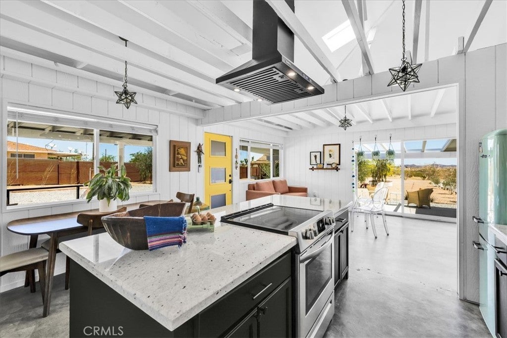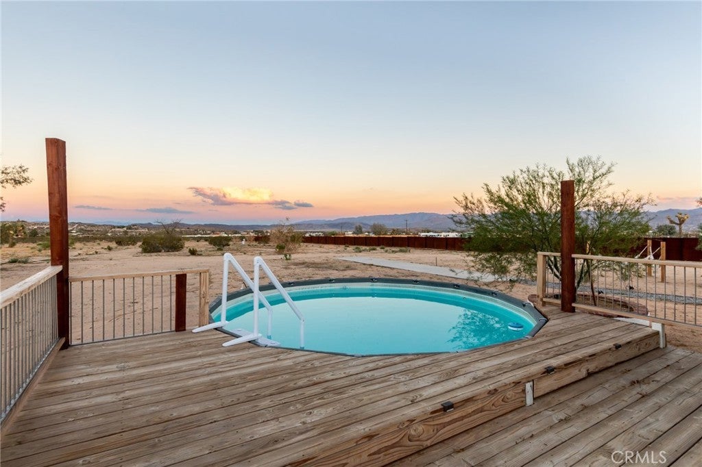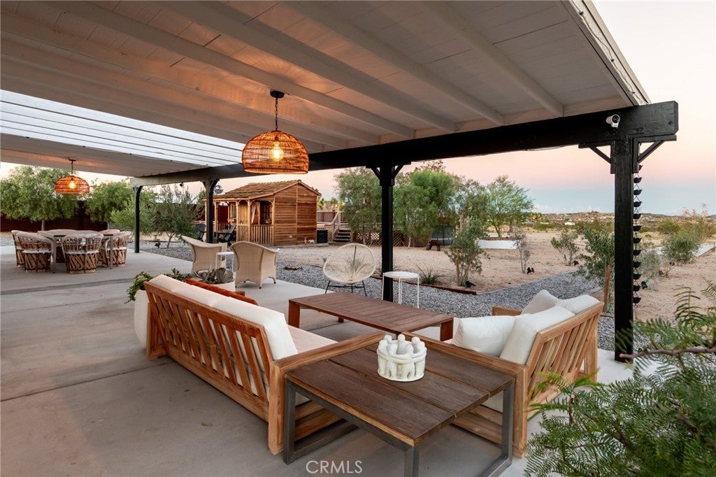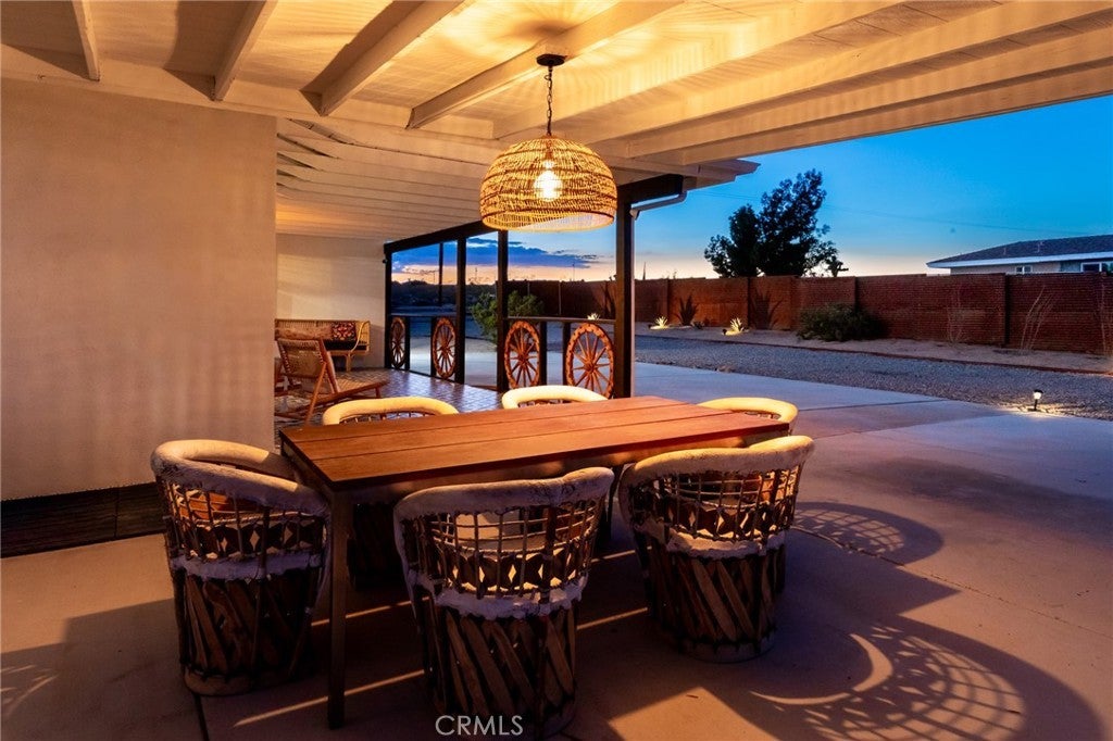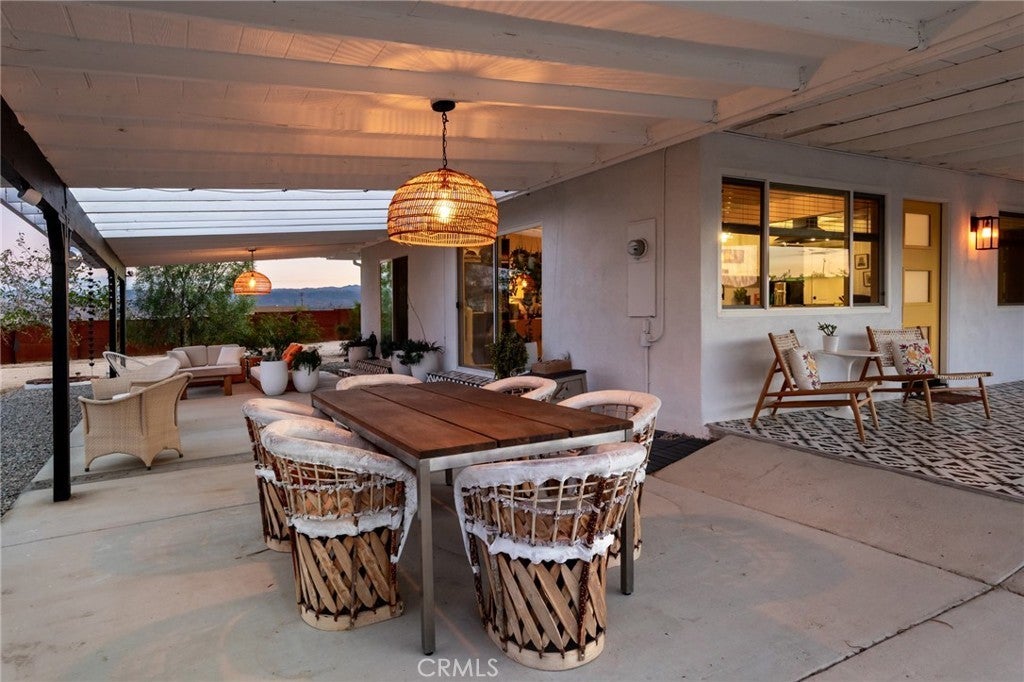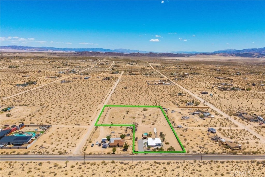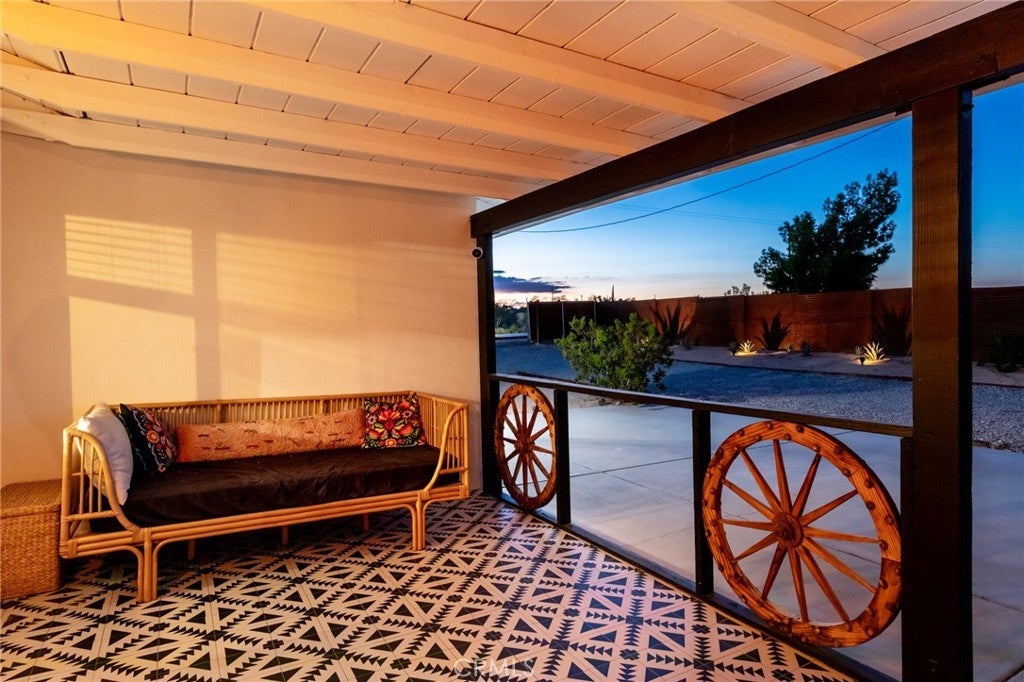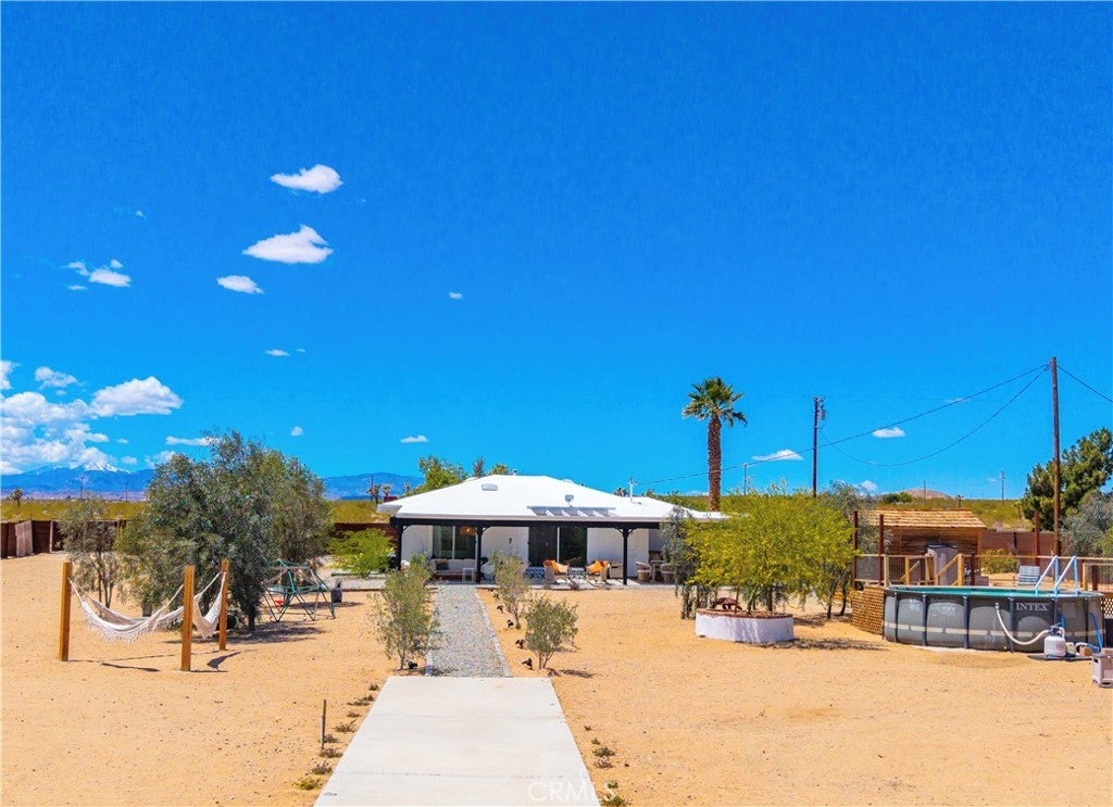 This FULLY FURNISHED 3-bedroom, 2-bath rustic-modern compound rests on 3.51 acres in scenic Joshua Tree. Set on the mesa and fully fenced for privacy, the property offers sweeping views of the surrounding hills and mountains along with a tranquil desert atmosphere. Thoughtfully renovated, the home features polished concrete floors, white wood-paneled walls, skylights, and sliding glass doors in the bedrooms that fill the interiors with natural light. The open-concept kitchen, ideal for entertaining, includes a large island, sleek black cabinetry and fixtures, granite countertops, and a tile backsplash. The adjoining living area with large slider overlooking the backyard is enhanced by vaulted ceilings and exposed beams. Both bathrooms have been stylishly updated with tiled walk-in showers and contemporary lighting. Comfort and efficiency are ensured with Mitsubishi mini splits, upgraded electrical, a new water heater, and full gutters. Outside, a generous covered patio invites relaxation and gatherings, accented with rattan light fixtures and black-and-white Aztec tile at the entry and steps. A detached cedar shed with a covered porch, dedicated power, vinyl flooring, extra fridge, and lighting offers versatile use as an art studio, office, or yoga space. The property also includes an RV electrical hookup, ample parking, and a Tuff Shed for added storage. The L-shaped lot features paved road frontage and a side gate off Shifting Sands Trail—perfect for a potential second dwelling with private access. Outdoor highlights include two water meters, a pool with custom wood decking, a hammock circle, and mature, drought-tolerant landscaping with olive, acacia, pepper, and palo verde trees, as well as agave and cacti. Freshly graded trails at the rear provide a great way to explore the land by foot or even on horseback. Located just 15 minutes from Joshua Tree National Park, under 10 minutes to downtown, and less than 5 minutes from the Noah Purifoy Outdoor Art Museum, this one-of-a-kind desert retreat offers a rare blend of style, space, and location. Schedule your showing today!