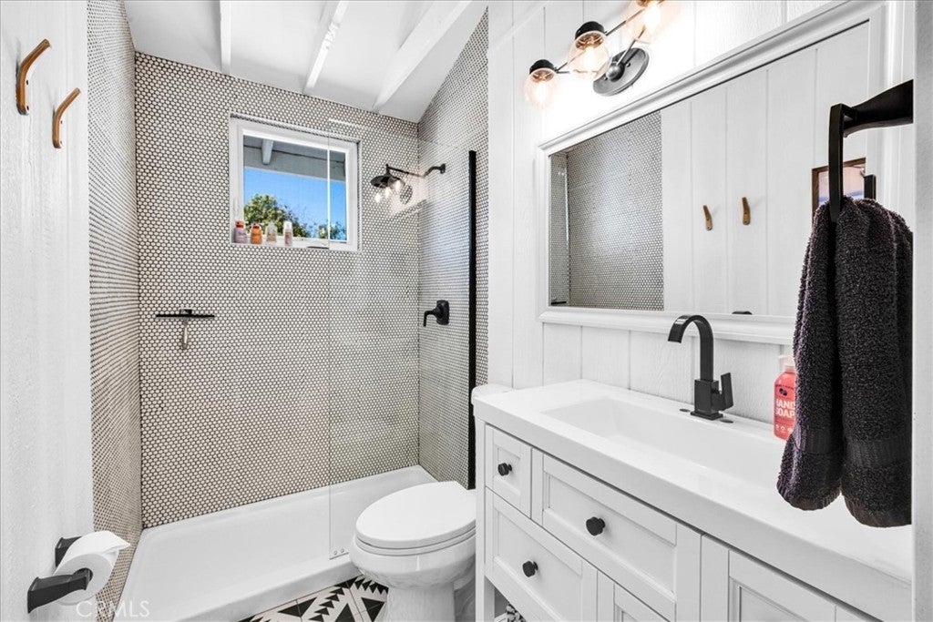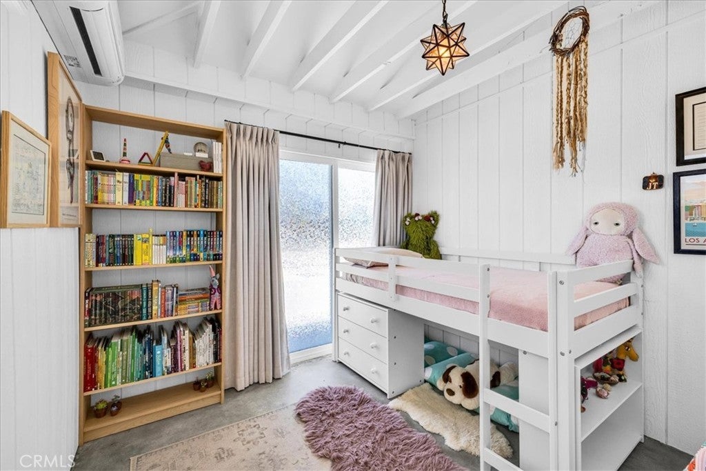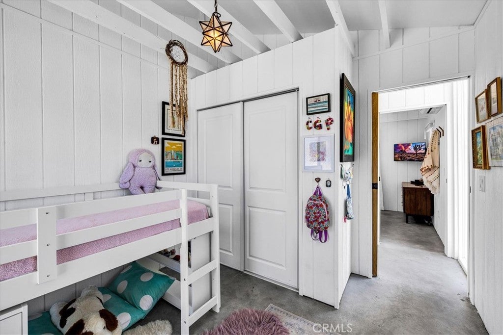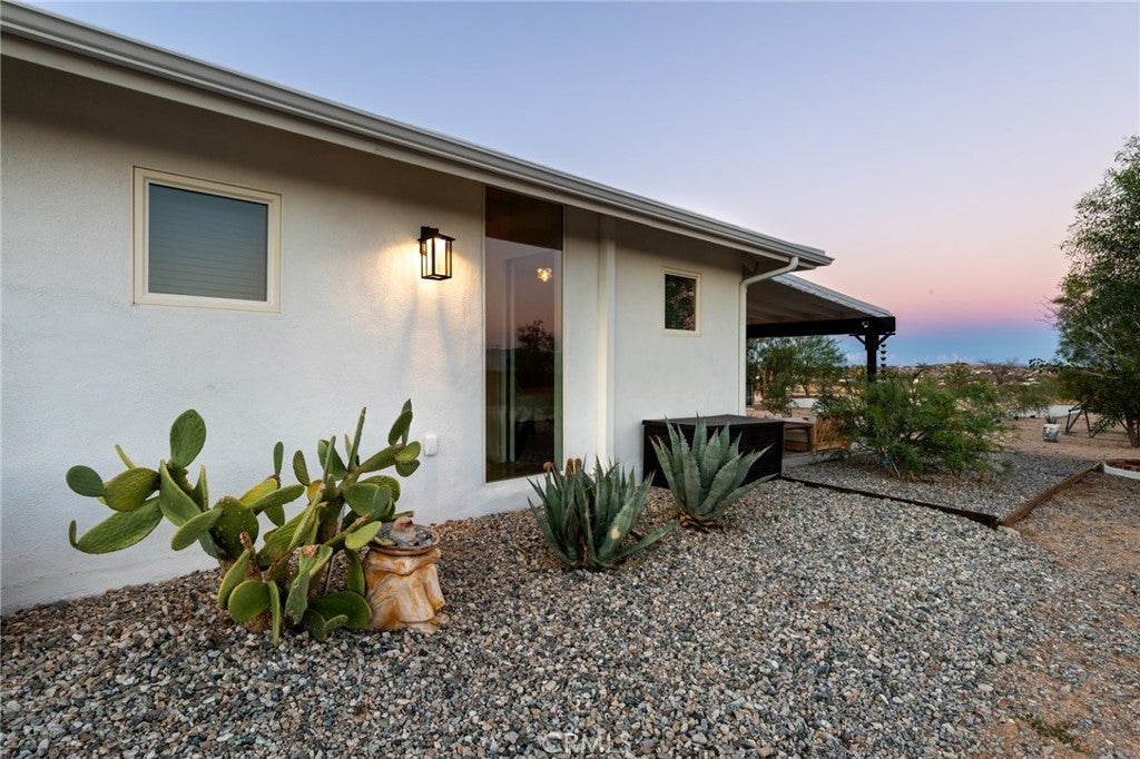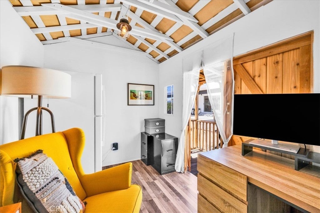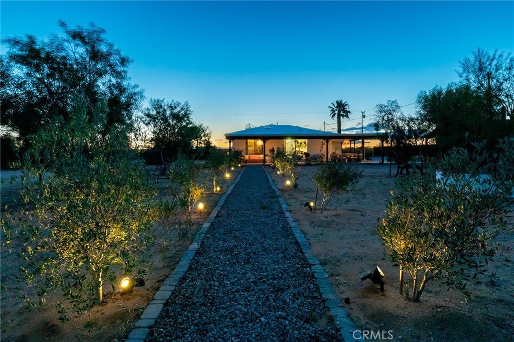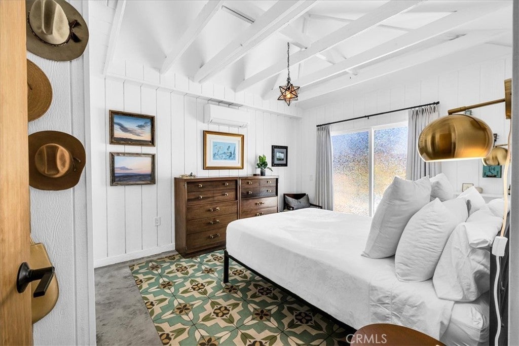 This FULLY FURNISHED 3-bedroom, 2-bath rustic-modern compound rests on 3.51 acres in scenic Joshua Tree. Set on the mesa and fully fenced for privacy, the property offers sweeping views of the surrounding hills and mountains along with a tranquil desert atmosphere. Thoughtfully renovated, the home features polished concrete floors, white wood-paneled walls, skylights, and sliding glass doors in the bedrooms that fill the interiors with natural light. The open-concept kitchen, ideal for entertaining, includes a large island, sleek black cabinetry and fixtures, granite countertops, and a tile backsplash. The adjoining living area with large slider overlooking the backyard is enhanced by vaulted ceilings and exposed beams. Both bathrooms have been stylishly updated with tiled walk-in showers and contemporary lighting. Comfort and efficiency are ensured with Mitsubishi mini splits, upgraded electrical, a new water heater, and full gutters. Outside, a generous covered patio invites relaxation and gatherings, accented with rattan light fixtures and black-and-white Aztec tile at the entry and steps. A detached cedar shed with a covered porch, dedicated power, vinyl flooring, extra fridge, and lighting offers versatile use as an art studio, office, or yoga space. The property also includes an RV electrical hookup, ample parking, and a Tuff Shed for added storage. The L-shaped lot features paved road frontage and a side gate off Shifting Sands Trail—perfect for a potential second dwelling with private access. Outdoor highlights include two water meters, a pool with custom wood decking, a hammock circle, and mature, drought-tolerant landscaping with olive, acacia, pepper, and palo verde trees, as well as agave and cacti. Freshly graded trails at the rear provide a great way to explore the land by foot or even on horseback. Located just 15 minutes from Joshua Tree National Park, under 10 minutes to downtown, and less than 5 minutes from the Noah Purifoy Outdoor Art Museum, this one-of-a-kind desert retreat offers a rare blend of style, space, and location. Schedule your showing today!