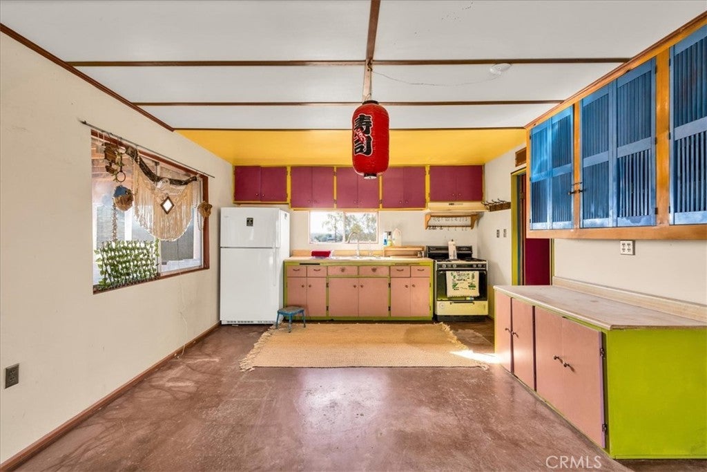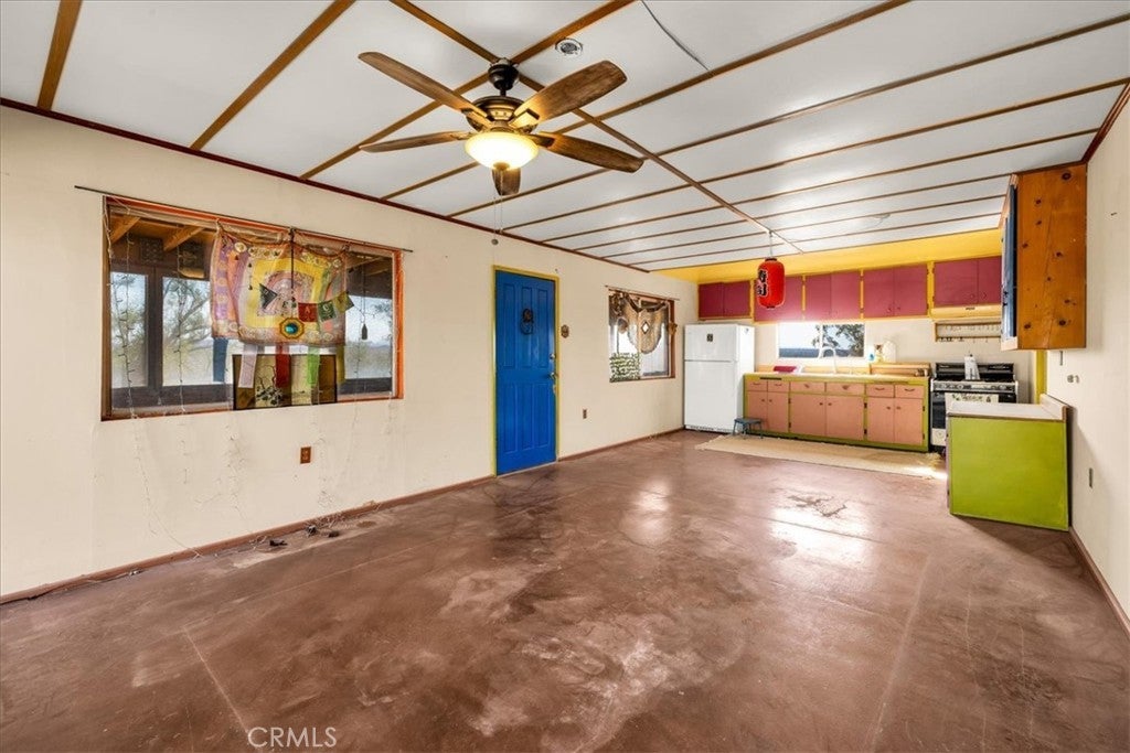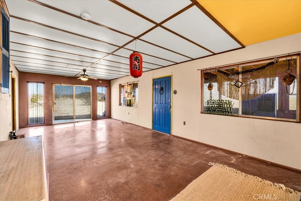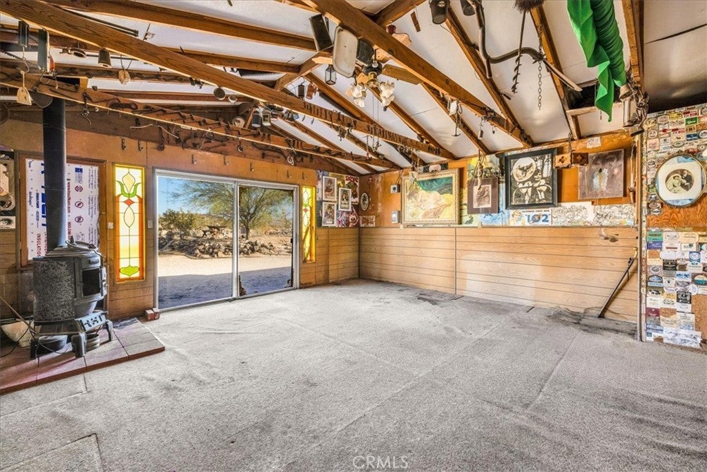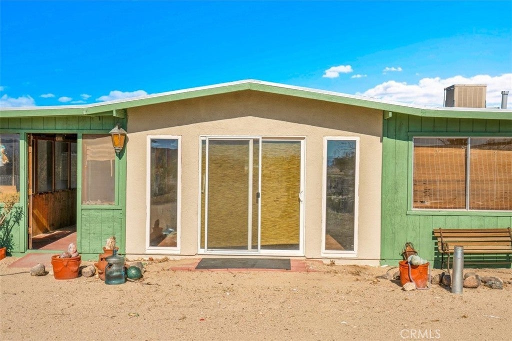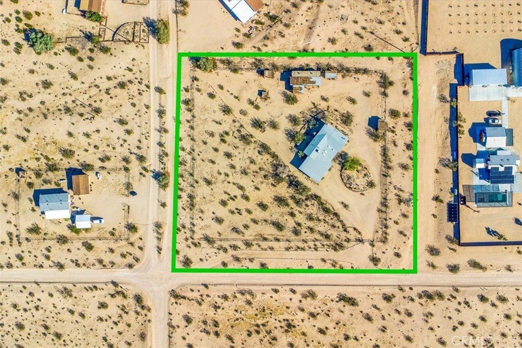 NEW ROOF, NEW EXTERIOR PAINT! Acreage & views! Come see this darling property, perched atop the Sunfair bluff overlooking the moonlight mesa area of north Joshua Tree! See both San Jacinto and San Gorgonio peaks from this location--many mile views! Its rustic and original condition offer a unique style filled with Joshua Tree character--not just another stucco box! On a fenced 2.5 acre lot, this large and roomy 2-bedroom 1-bath home features a living room with fireplace, open kitchen / dining area, a studio (converted garage) with wood stove, a storage container, carport structure, sheds and more! 15 minutes from downtown Joshua Tree and not much farther to the west entrance of Joshua Tree National Park. Come see today!