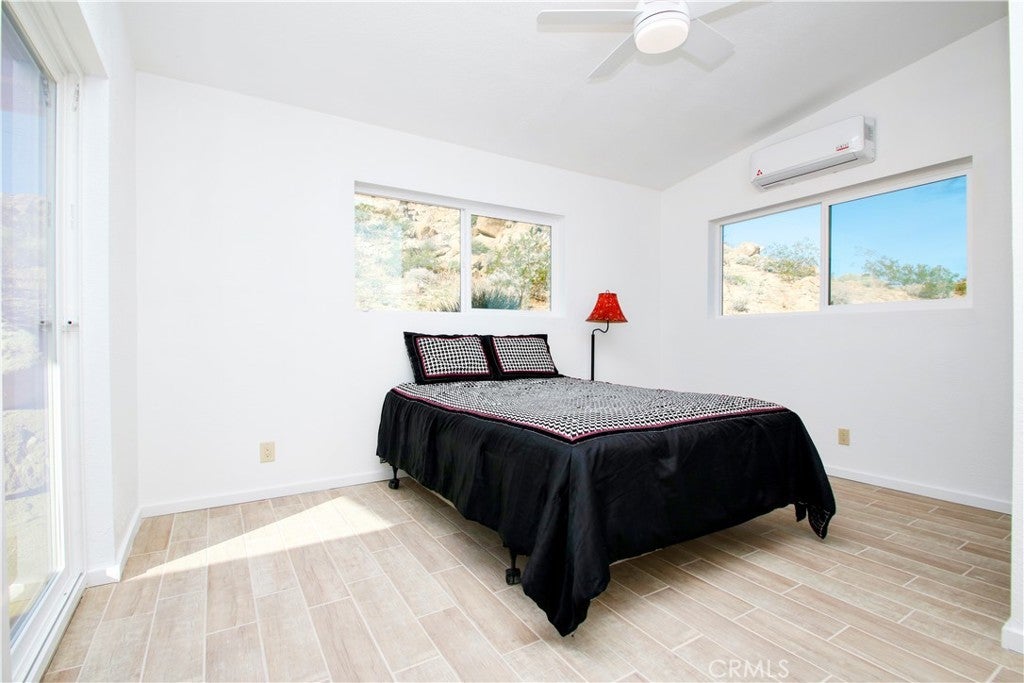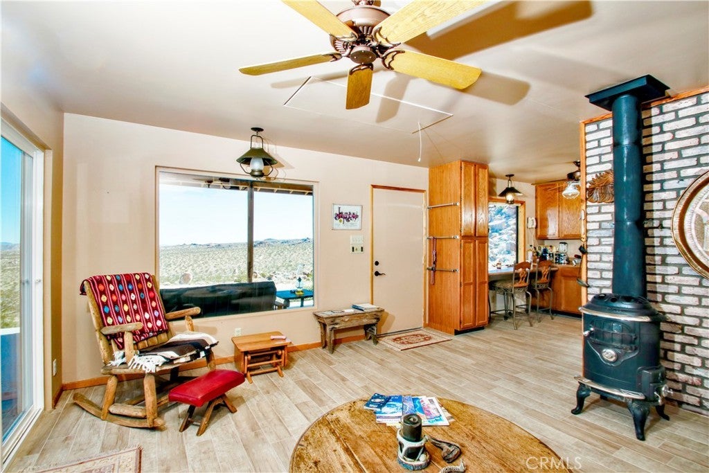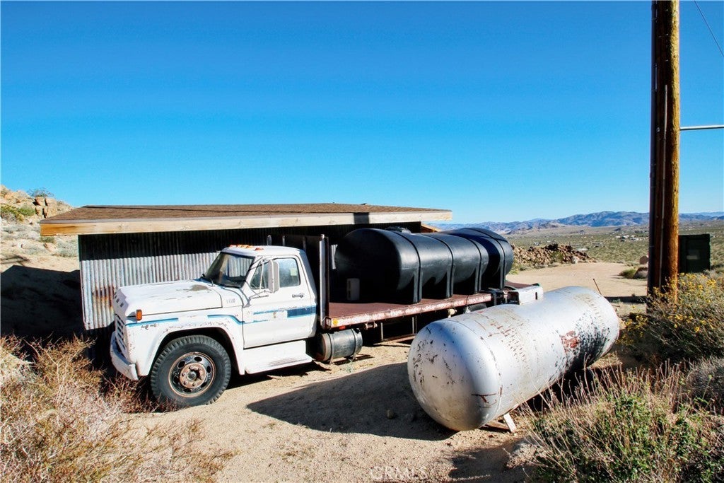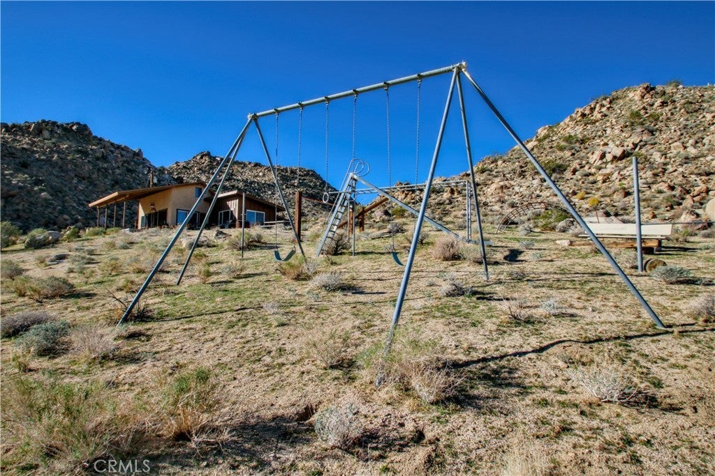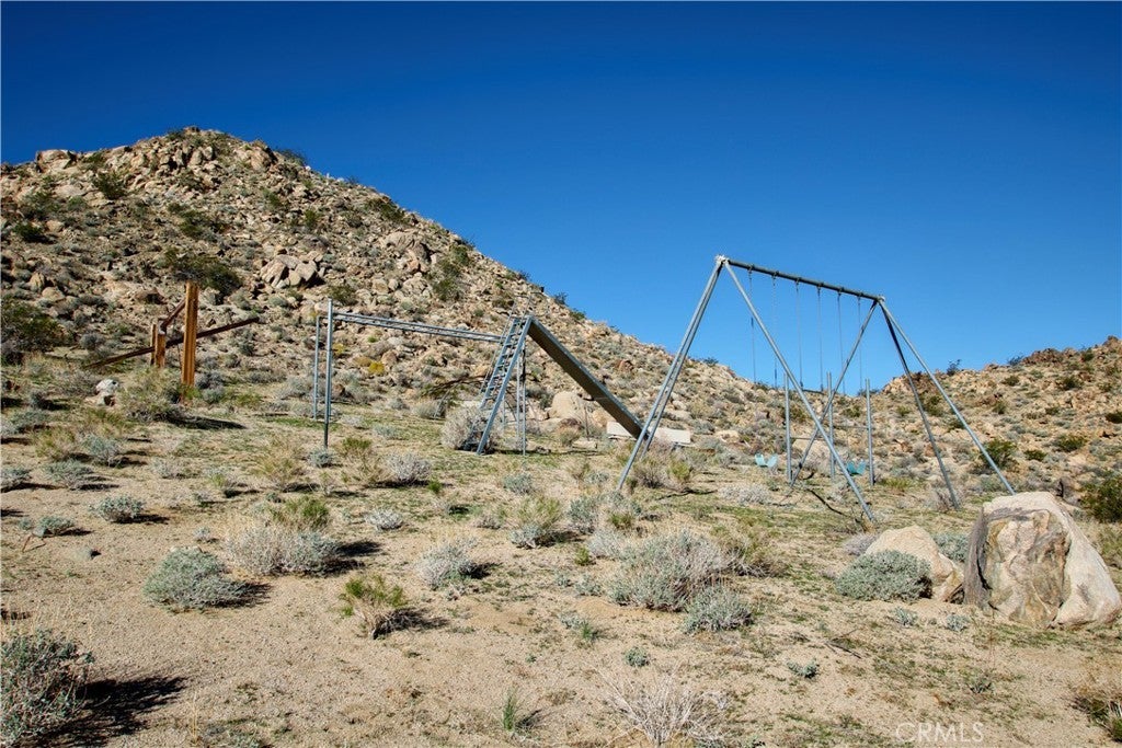 This Hidden Canyon Retreat is truly one-of-a-kind and offers the best in privacy and seclusion! The security gated entrance opens on a private, meandering road to this 2-bedroom, 1 bath house nestled in its own private canyon with beautiful views of rock formations and natural vegetation. The property is surrounded entirely by Bureau of Land Management (BLM) land, so the 5-acre parcel feels a hundred acres. A private mountain with hiking trail stops at a bench at the top overlooking the entire valley. The house with quaint kitchen and spacious living area was recently partially redone re-configuring the original single bedroom and adding a second bedroom with large windows and a laundry room. Mini splits have been added to both bedrooms and the living room for AC and heat along with the original wood stove in the living room. Don't miss the insulated, easy access attic that could be used as an additional sleeping area, playroom or studio. A newer detached double garage with carport is set with plumbing and electrical. Everyone will love the expansive playground with swings, slide, monkey bars and climbing structure too! This get-a-way is located just minutes from the Johnson Valley OHV recreation area, and the annual King of the Hammers. All day dirt bike and quad riding from your front yard adds to the fun. Located 30 mins from Yucca Valley and beyond to Joshua Tree, Palm Springs, and other desert locations. Seller may carry! Call for more information.