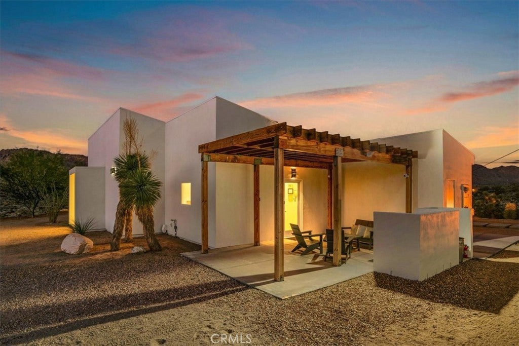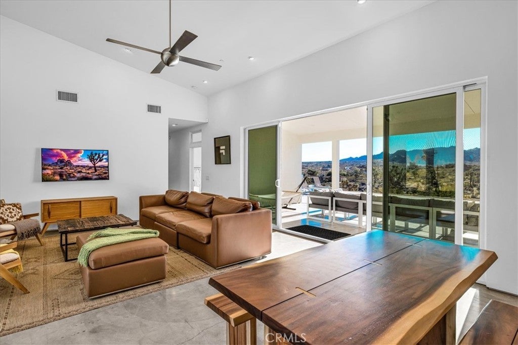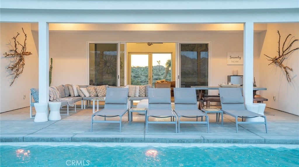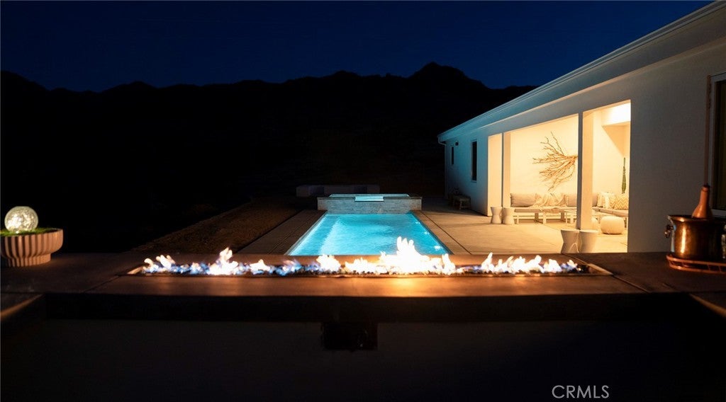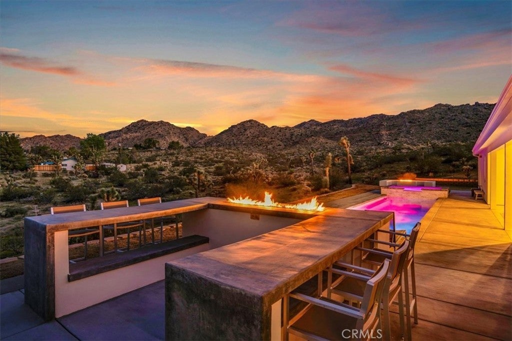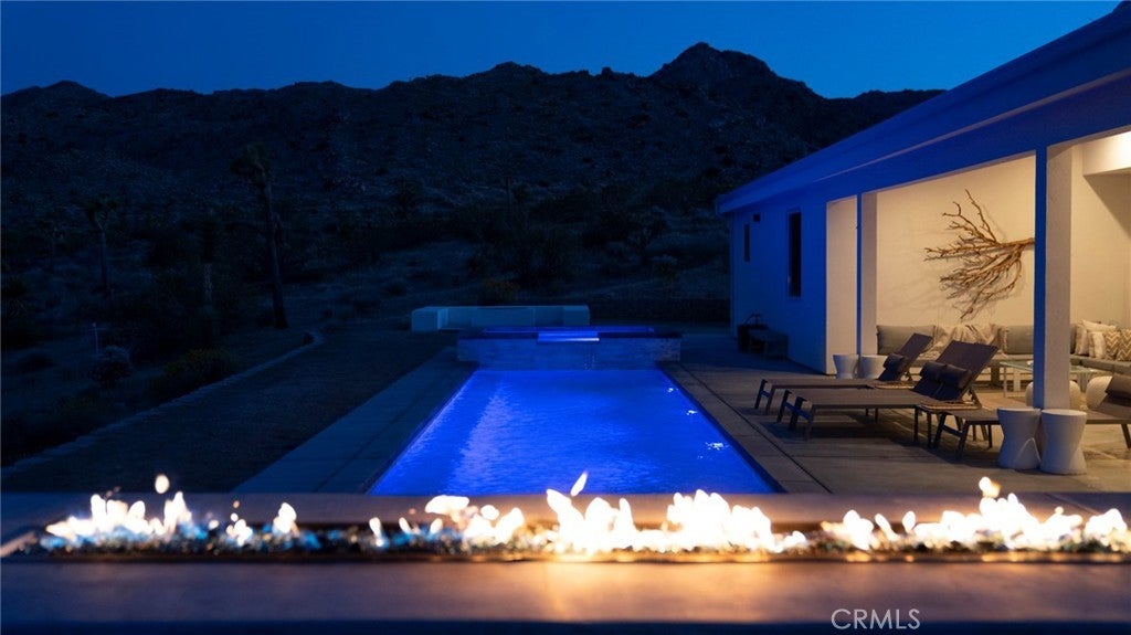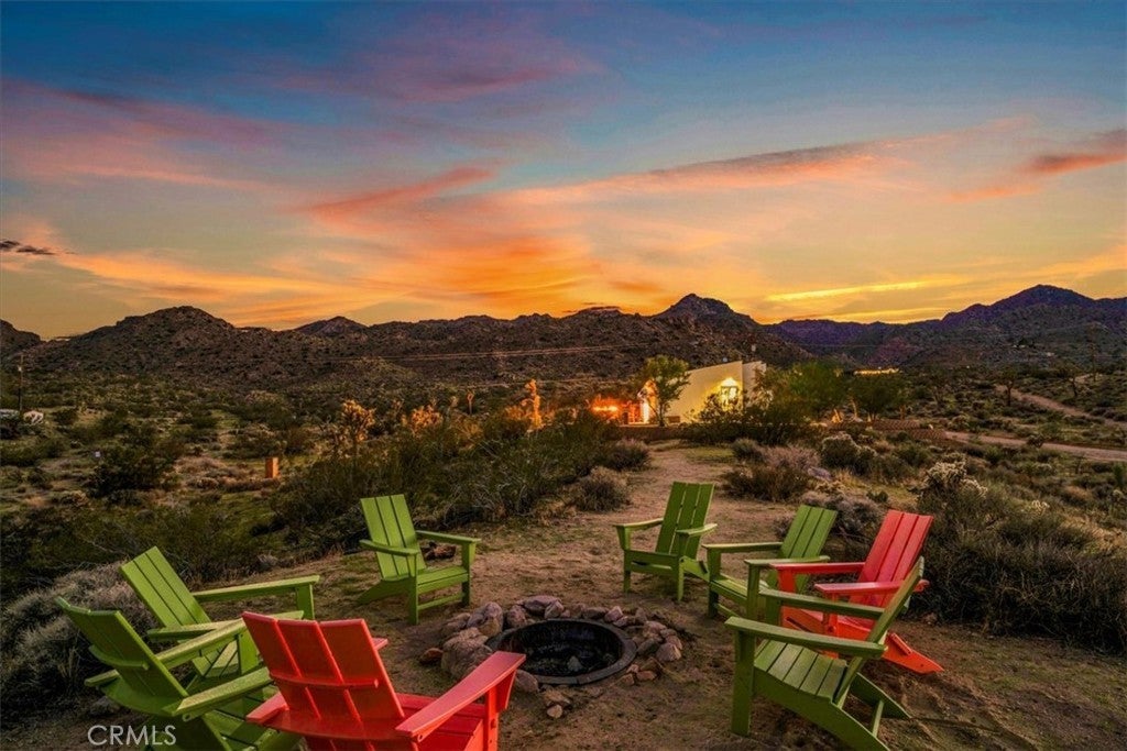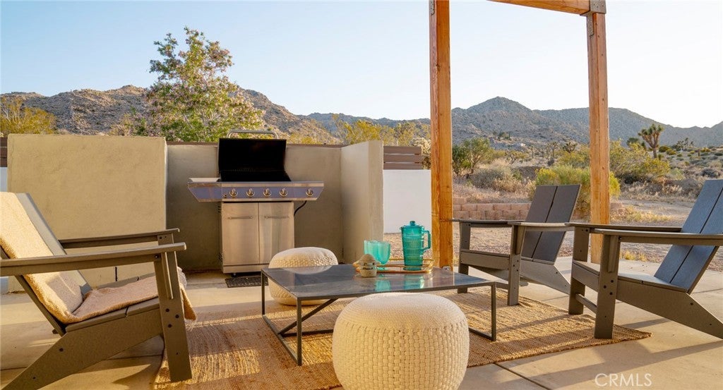 SHORT TERM VACATION RENTAL OPPORTUNITY! Set against the stunning backdrop of Joshua Tree National Park, this fully furnished 3-bedroom, 2-bath home is a rare offering in highly sought-after Monument Manor. Built in 2017 and thoughtfully designed with the modern desert dweller in mind, the home offers 1,806 square feet of contemporary living space nestled among rolling hills and lush, natural landscaping. From the moment you arrive, you’ll be struck by the property's serene seclusion and panoramic views, which frame the dramatic desert terrain in every direction. The landscaping is a work of art, featuring native species such as mesquite trees, yuccas, Joshua trees, ocotillos, acacia, and palo verde—all enhancing the sense of harmony with the natural surroundings. Inside, the home showcases sleek concrete floors, soaring ceilings, and 8-foot exterior doors that invite light and air throughout the open-concept floor plan. The expansive living and dining areas flow effortlessly into a custom-designed kitchen equipped with high-end Bosch appliances, an induction cooktop, a water filtration system, and custom cabinetry tailored for those who love to cook and entertain. Every detail has been considered for both luxury and functionality. The bedrooms are generously sized, while the bathrooms feature tasteful, high-end finishes and thoughtful design touches. Climate control is handled by a Nest-managed central HVAC system, and the home is powered by paid solar, making it fully electric and energy-efficient. Stepping outside, the property transforms into your own private resort. A custom in-ground pool and spa create the perfect setting to cool off or unwind under the stars. The outdoor bar, built-in firepit, and multiple patios and lounge areas provide ideal spaces for hosting gatherings, enjoying peaceful sunsets, or simply soaking in the tranquil atmosphere. While the property offers an exceptional sense of privacy and escape, it also functions as a permitted short-term rental, delivering strong investment potential. With its combination of luxury, thoughtful design, and unparalleled location, this is more than a home—it’s a lifestyle. Whether you're searching for a high-end vacation rental, a personal retreat, or a forever home, this extraordinary Monument Manor property offers it all.