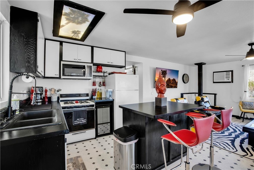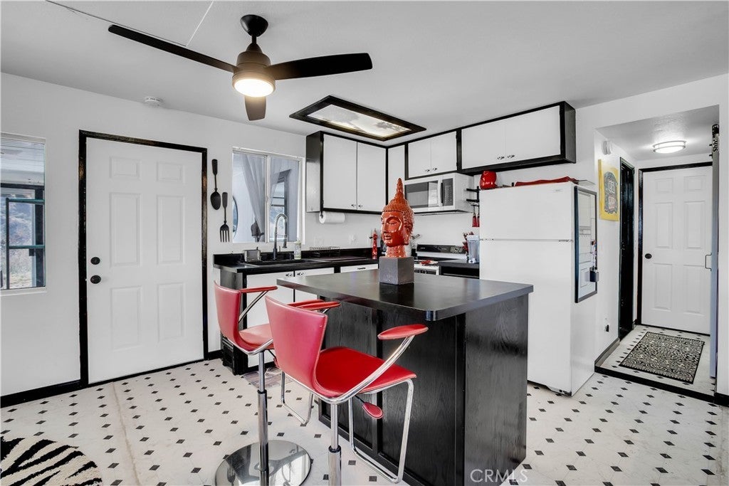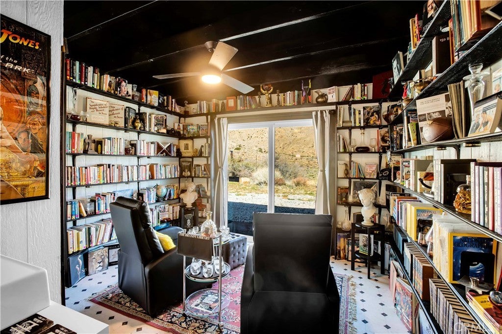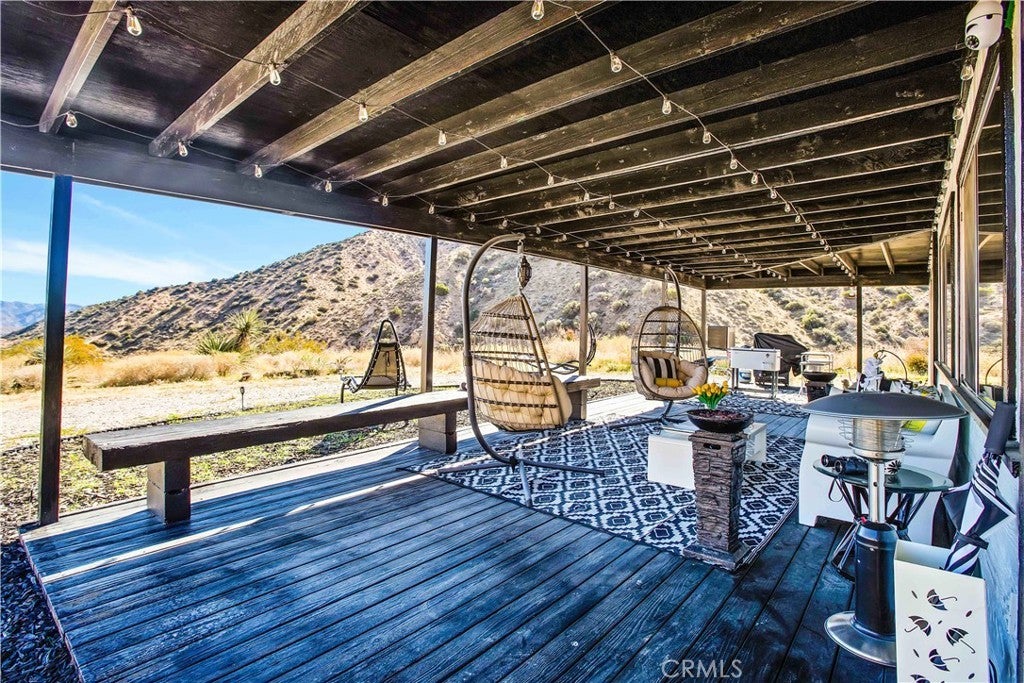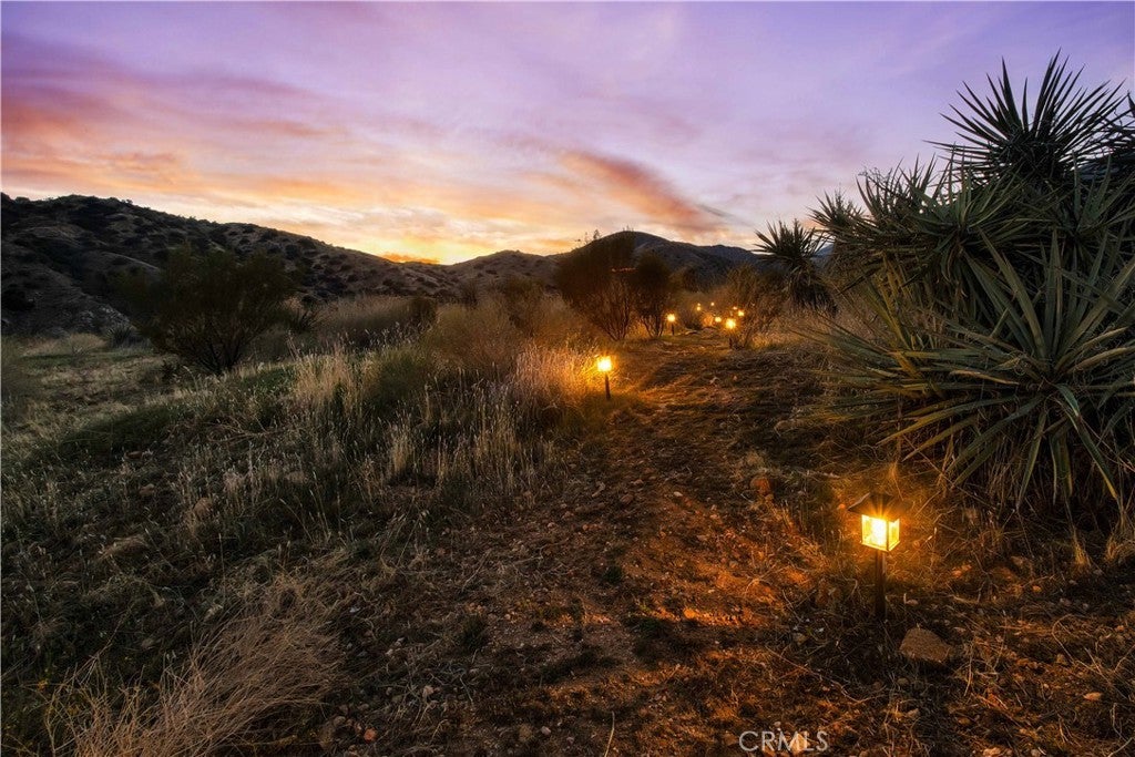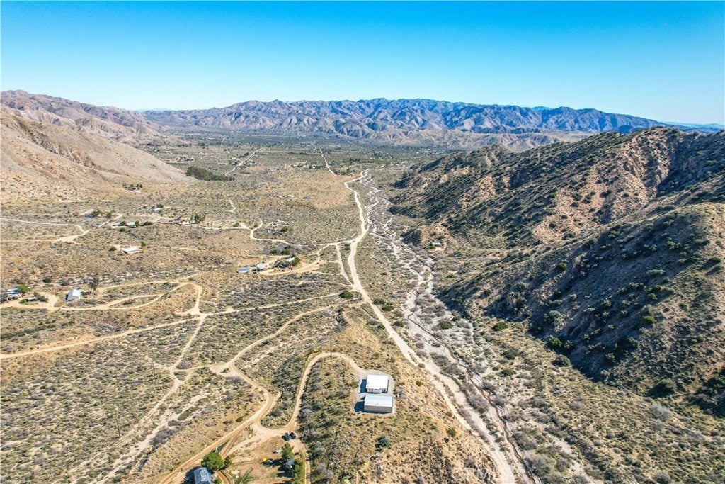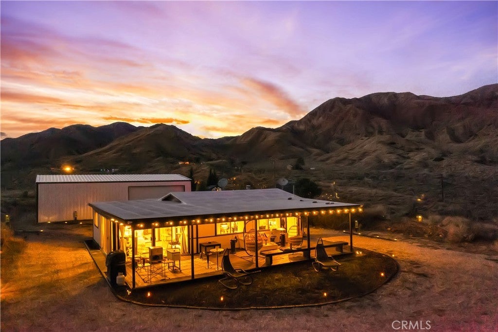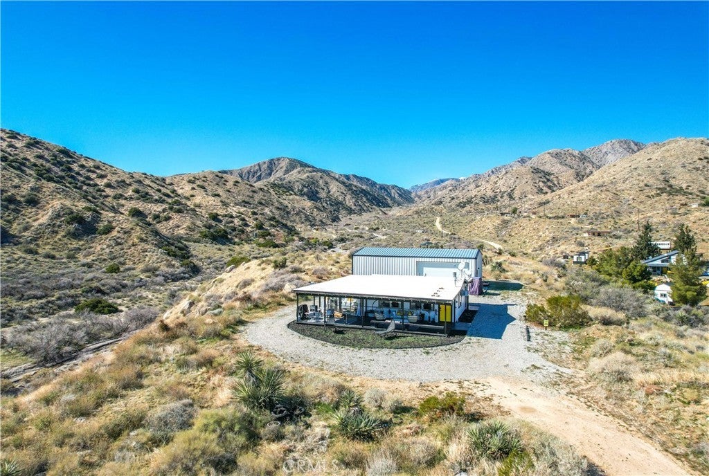 Discover a unique mid-century Western-style retreat on 5 private acres in scenic Morongo Valley, just 2 miles into Big Morongo Canyon. Perched atop a hill at the end of a solar-lit drive, this renovated home offers modern upgrades throughout. Expansive windows and sliders frame sweeping mountain views, while an open floor plan flows into a bright sunroom, library/office, bedroom, and a full bath. A 600 sq. ft. covered veranda provides stunning vistas by day and city lights by night. The wine frig is ready for you to keep a solid supply, so you are ready with a glass of wine for the sunset. The 1,500 sq. ft. warehouse/workshop is ideal for RVs, art studio, dirt toys, storage, or multiple vehicles. Enjoy solar-lit trails, a gazebo, fire pit, and tranquil streamside views. Just minutes from Joshua Tree and Palm Springs, and approx. 2 hours from L.A. Private showings only—please do not go to property without an agent.