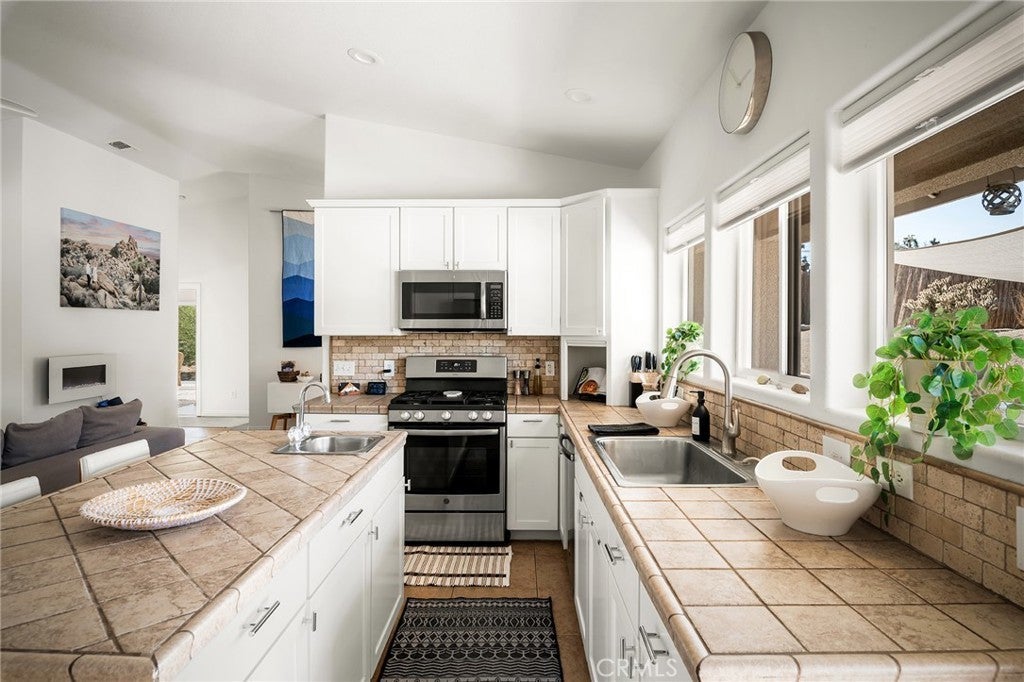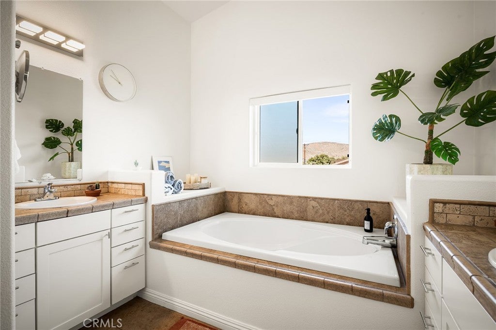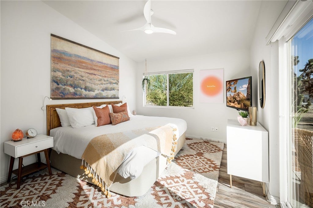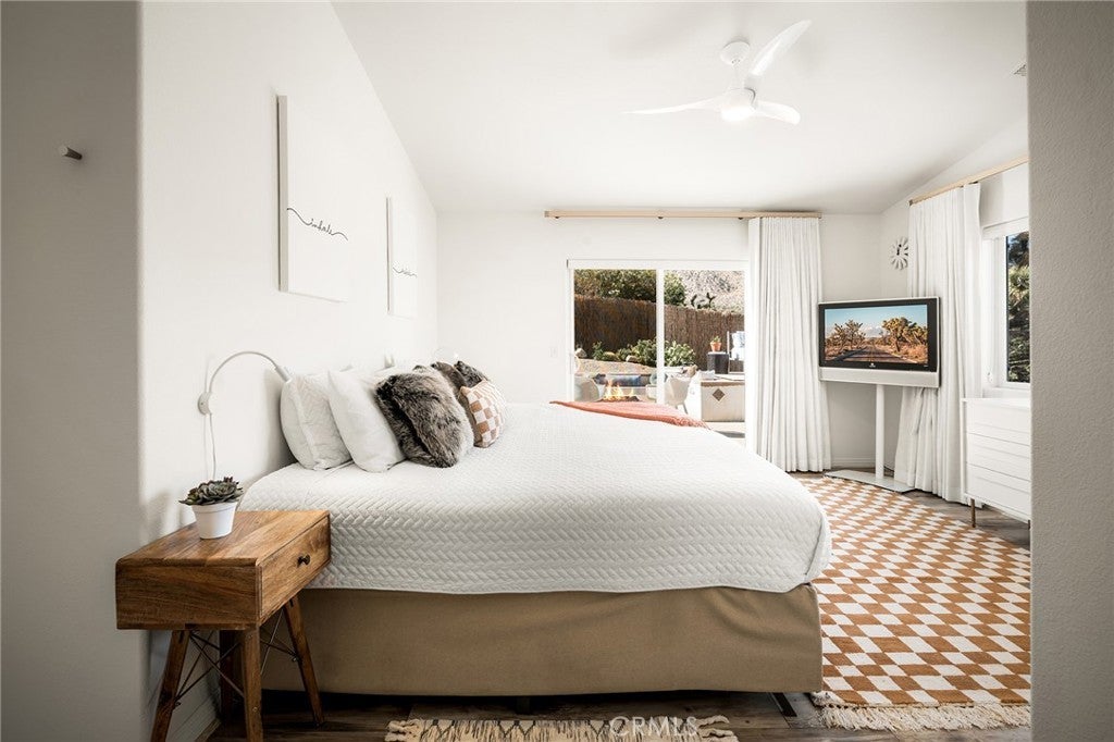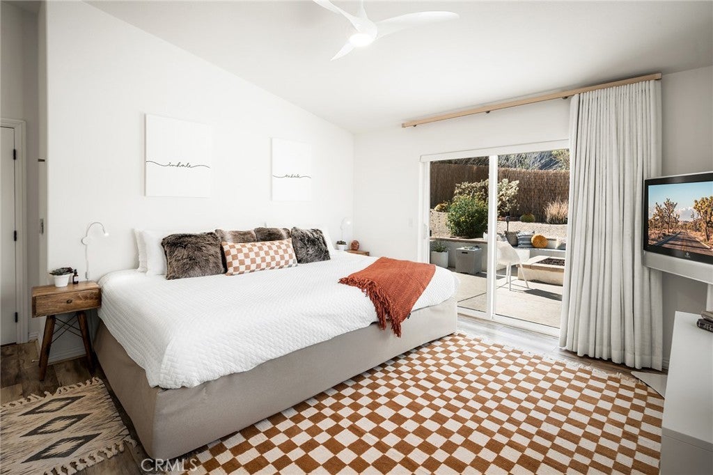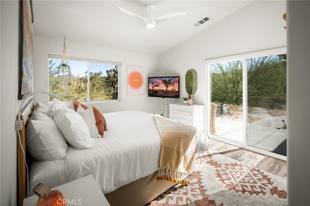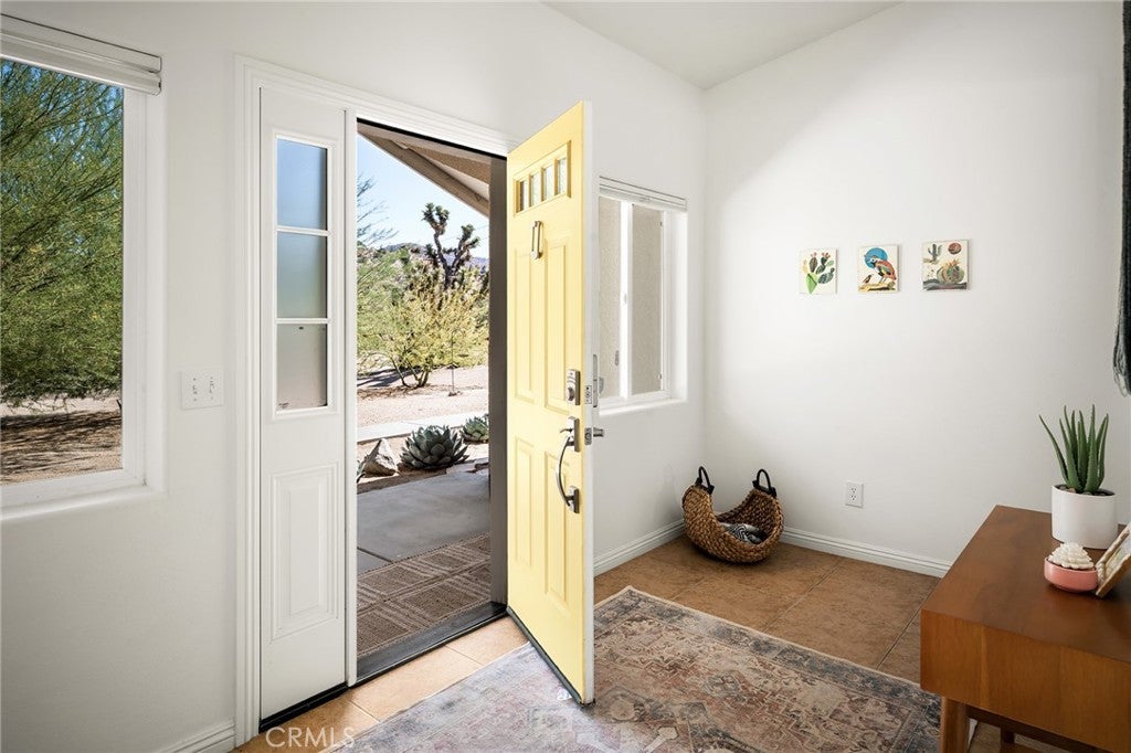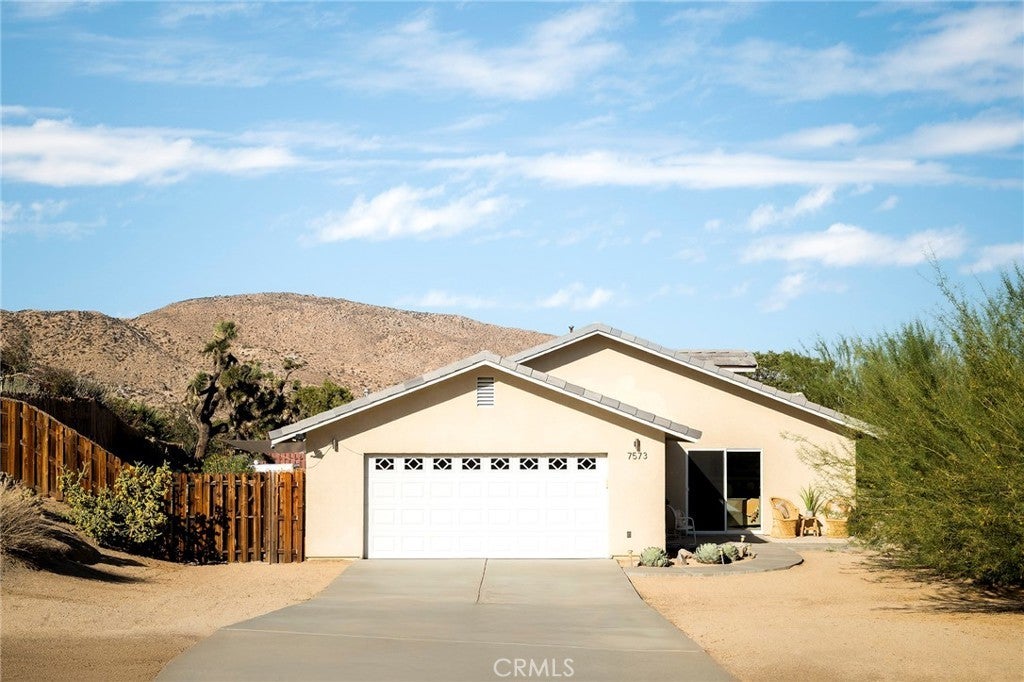 Set against sweeping mountain views in one of the area’s greenest and most established neighborhoods, this beautifully maintained 3-bedroom, 2-bath home with bonus room sits on a prime half-acre corner lot in desirable Country Club Estates. A mature, tree-lined front yard with lush desert landscaping creates exceptional curb appeal and a welcoming arrival. No HOA. Newly paved streets, connected to public sewer and natural gas, school bus stop, and a short walk to the area’s only golf course and popular café, The Roost. Conveniently and centrally located just a short drive to Joshua Tree, Pioneertown, and Palm Springs. The open-concept layout features high ceilings and abundant natural light, with mountain views visible from most rooms. Modern fixtures, ceiling fans throughout, custom blinds and curtains, and stylish flooring create a comfortable and inviting interior. The large primary suite offers a spacious bathroom with dual vanities, extra large soaking tub, walk-in shower, and a generous walk-in closet. TVs are included in all bedrooms. The fully fenced backyard is designed for entertaining and relaxation, featuring a custom patio with built-in gas fireplace and seating, raised lookout deck with outdoor queen bed, 4-person hot tub, oversized cowboy tub, shaded dining area, BBQ, and beautifully landscaped desert grounds. Additional features include a fully equipped kitchen with modern appliances, electric fireplace, laundry room with newer washer/dryer, attached two-car garage, and rare concrete roof. Offered fully furnished except for select staging items; buyers to request exclusions list. Property is move-in ready and perfectly suited as a full-time residence or an effortless desert getaway.