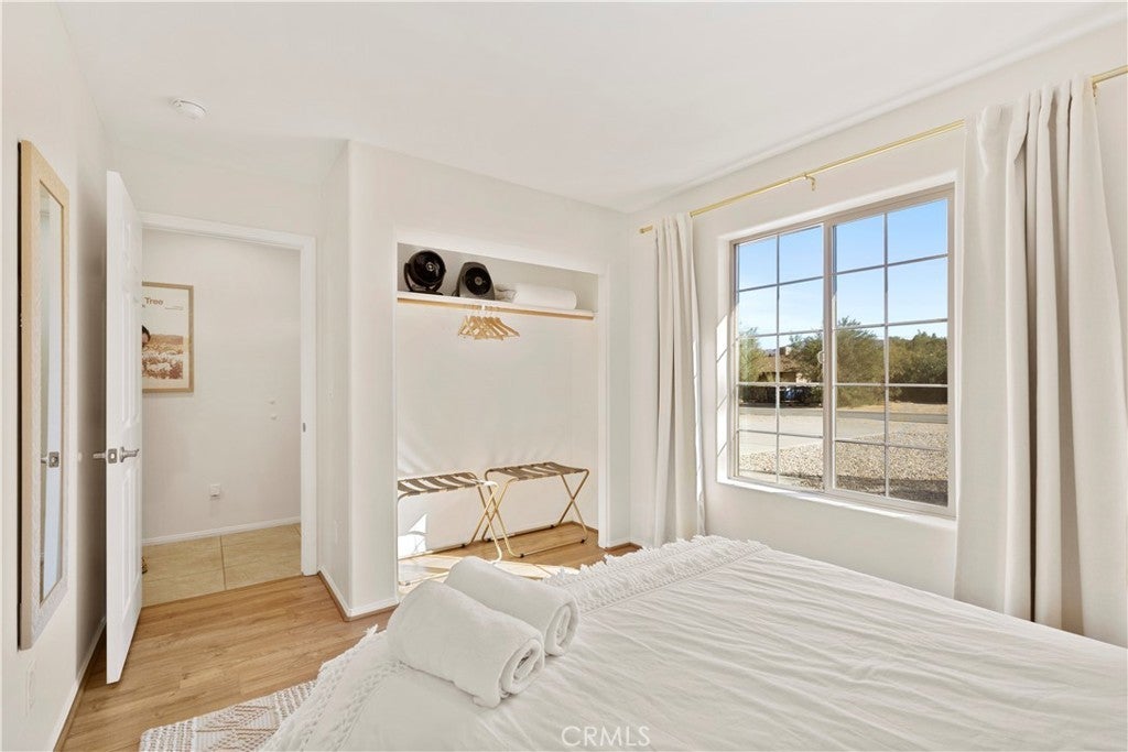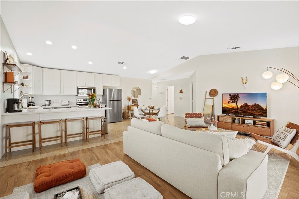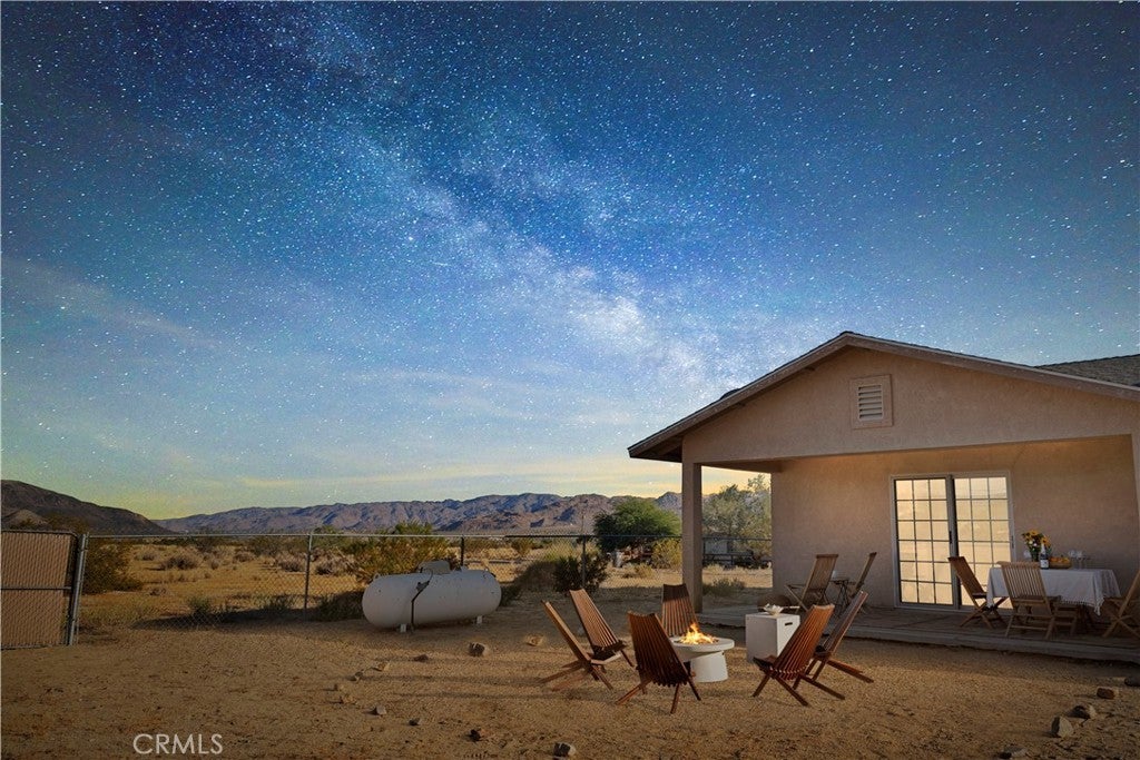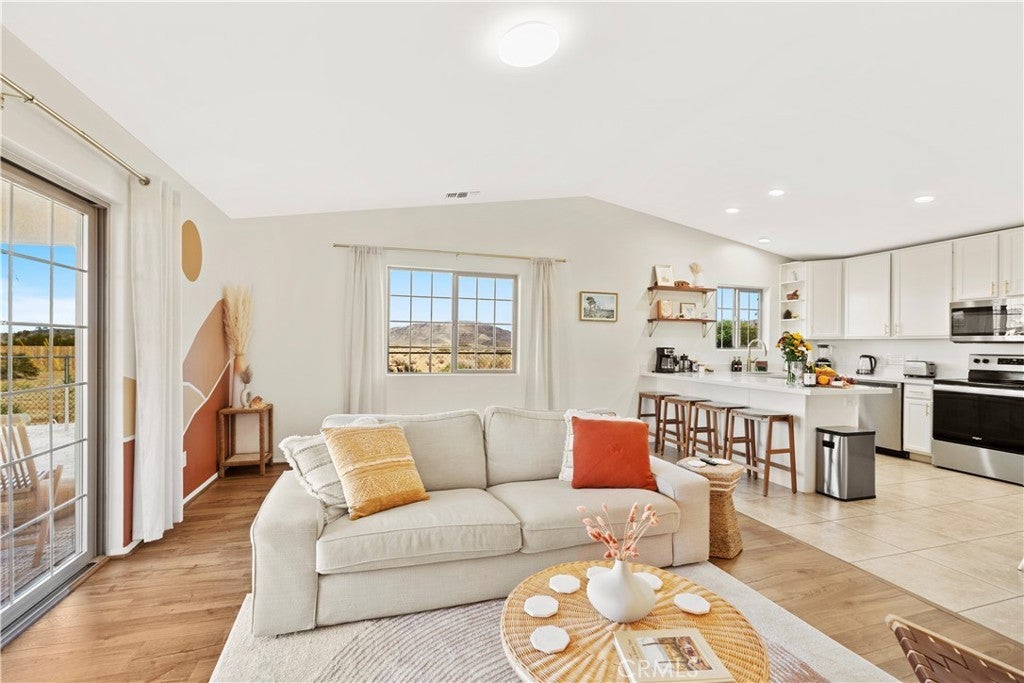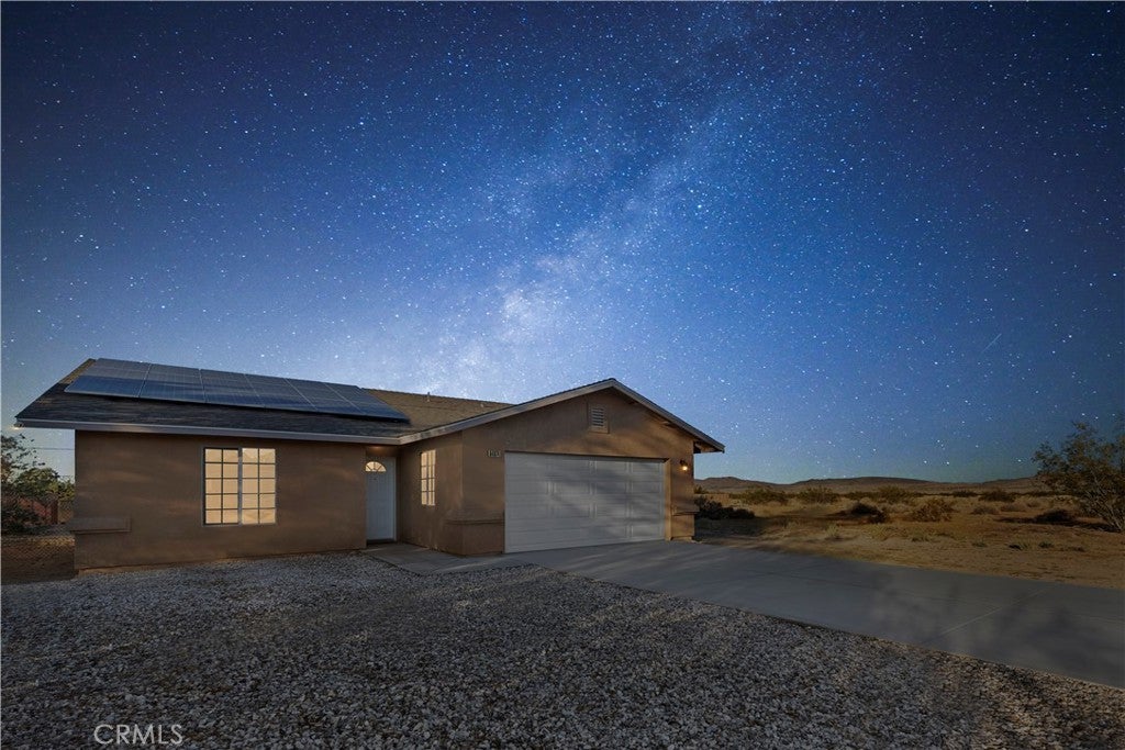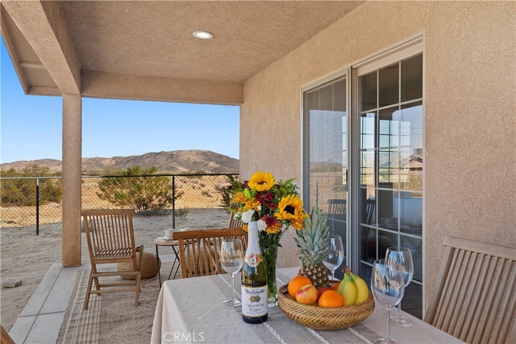 Welcome to this thoughtfully updated three-bedroom, two-bath Joshua Tree retreat, where modern comfort meets the timeless beauty of the high desert. Located just 15 minutes from the entrance to Joshua Tree National Park, this inviting home also places you near celebrated local landmarks including the Transmission Sculpture and the Simi Dabah Sculpture Garden. Whether you’re seeking a full-time residence, a stylish weekend getaway, or a ready-to-go investment property, this home offers the flexibility to fit your vision. Inside, an open, airy floor plan with vaulted ceilings creates a sense of space and ease, ideal for entertaining, working remotely, or simply unwinding. The home features modern finishes throughout, including quartz countertops, stainless steel appliances, updated bathroom vanities, and refreshed cabinetry with contemporary hardware, all complemented by durable hardwood laminate flooring. Comfort and efficiency are front and center with Tesla solar, central HVAC, and an evaporative cooler, while smart home features add convenience and peace of mind whether you’re on site or away. Set at the end of a paved cul-de-sac, the property enjoys a quiet, tucked-away setting within a small neighborhood that feels both private and connected. The fenced yard opens to expansive east-facing views of Copper Mountain, wide-open desert terrain, and nearby walking, biking and horse trails. Evenings here are made for gathering around a campfire, watching the moon rise over the mountains, and taking in brilliant night skies filled with stars. This is a rare opportunity to own a turn-key desert home that captures the spirit of Joshua Tree while offering modern livability—schedule your private showing and experience it for yourself.