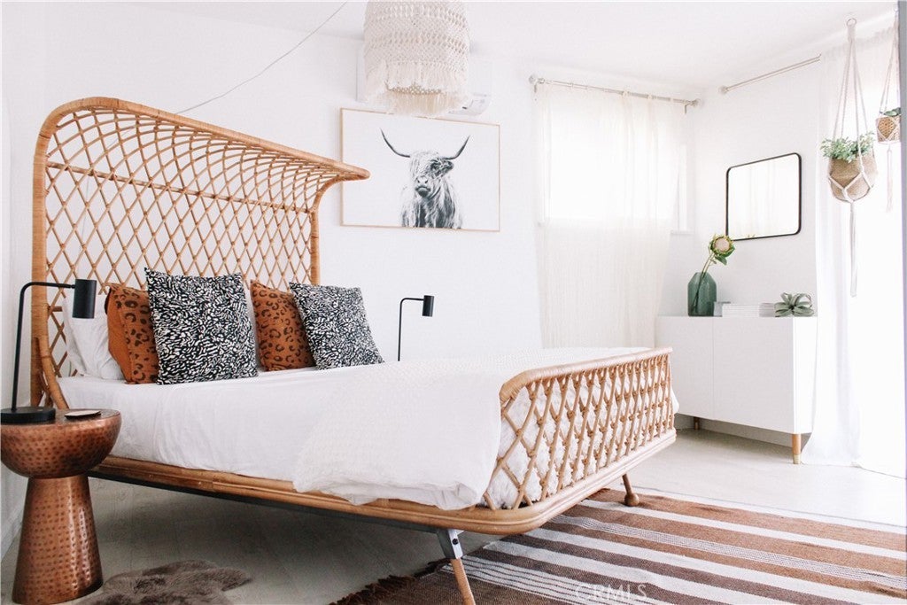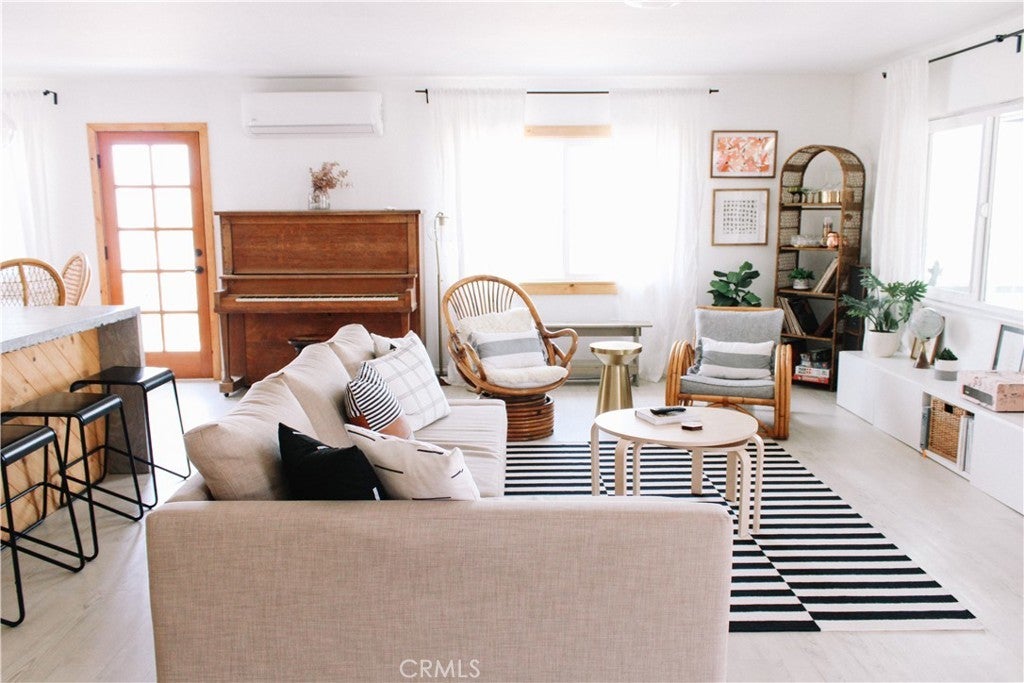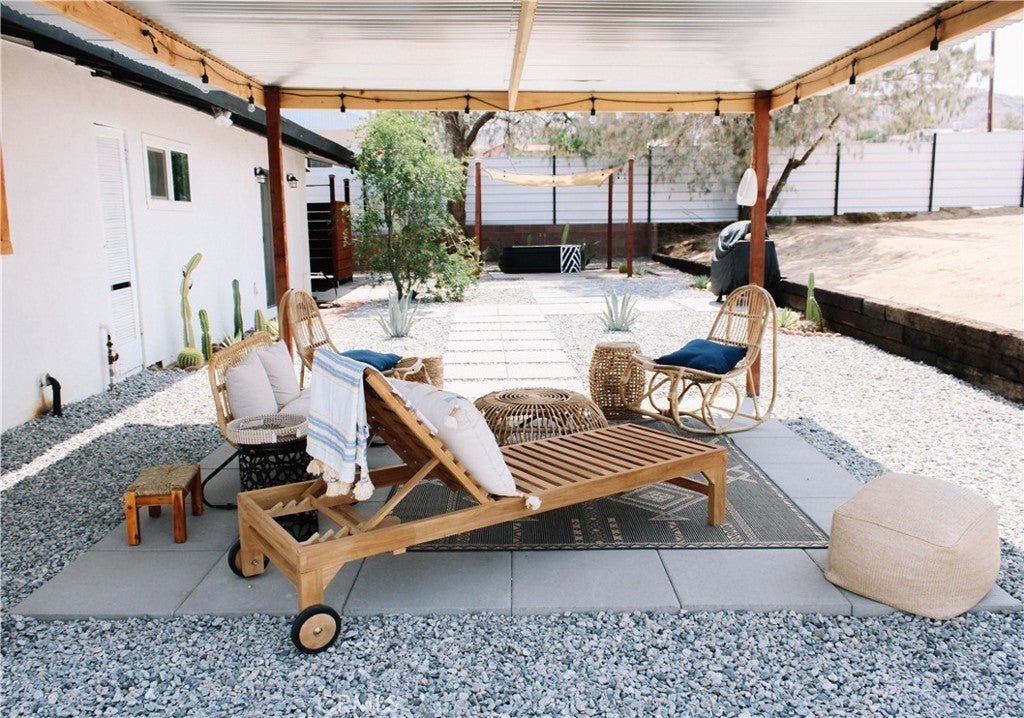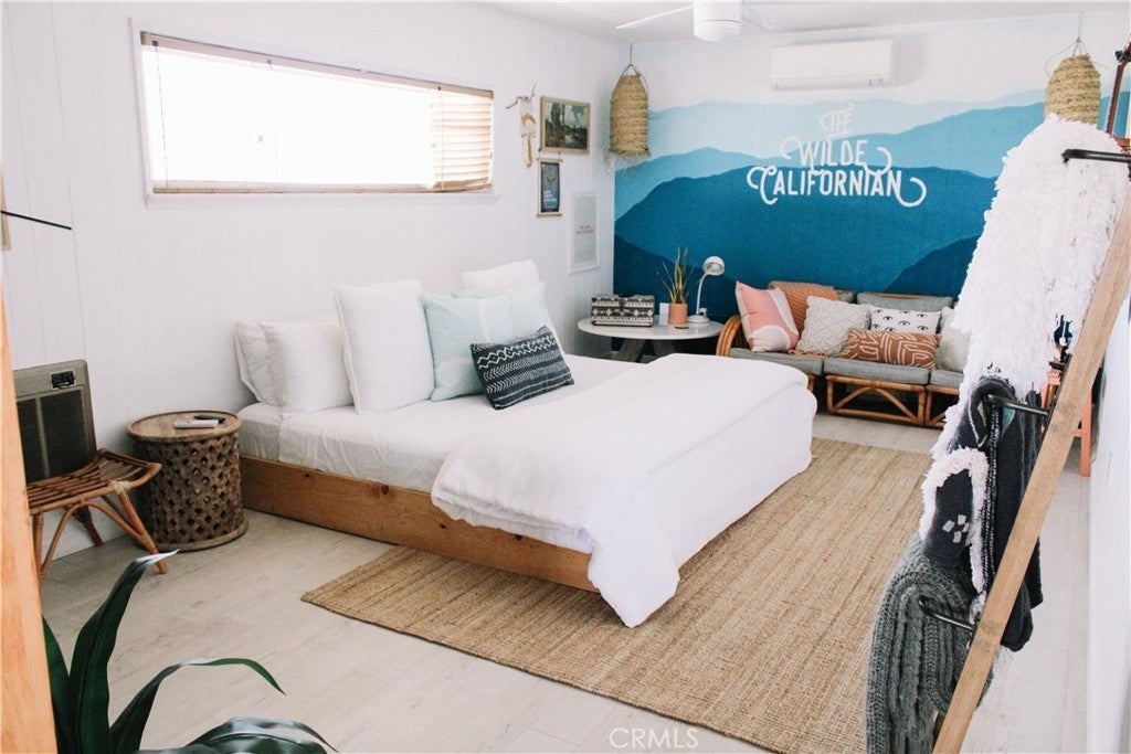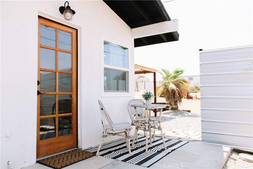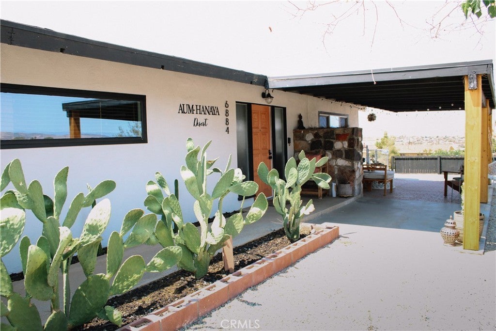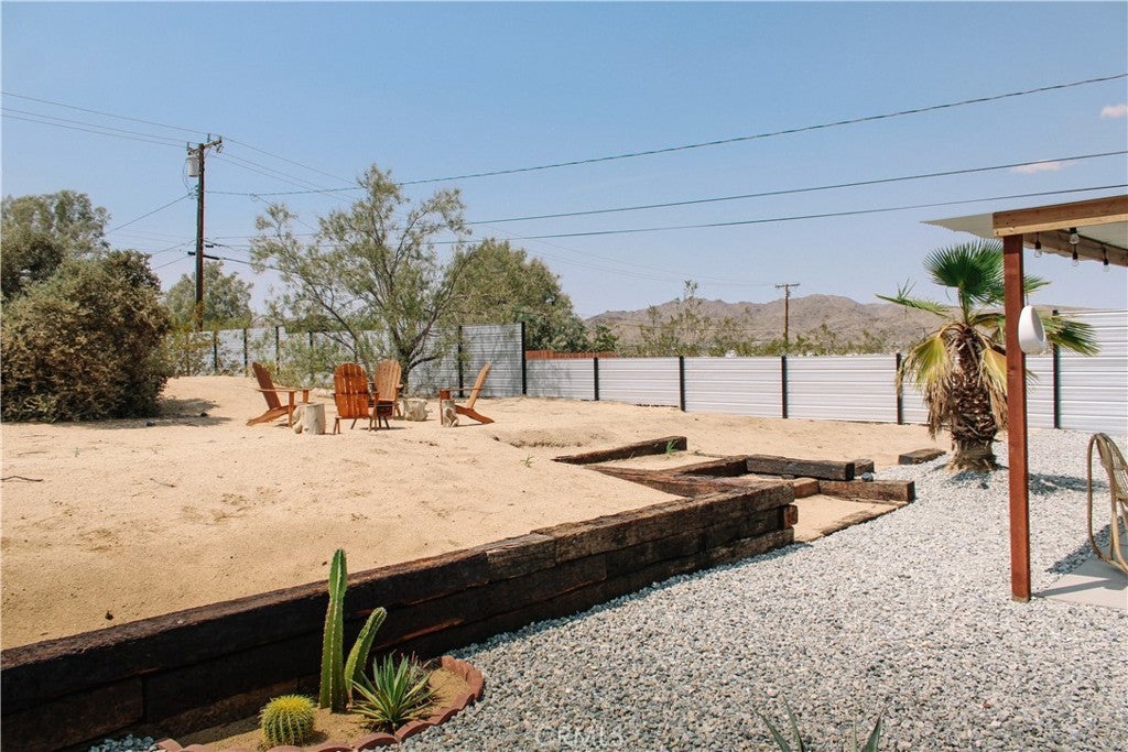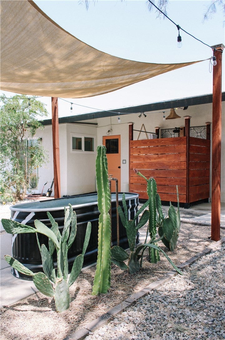 NEW ROOF installed Jan 2026!! Insurance companies love to see that! Be taken away by the curated, one-of-a-kind "Aum-Hanaya Desert". With its meaning of "willingness and courage to experience the unfamiliar in grace", this house will truly take you to another desert dimension. 2 bed, 1 bath. Closer to the Joshua Tree National Park than the Visitor Center, this location is par none. Walking/biking distance to the Downtown Village area with local restaurants, bars, and shopping. Situated on the famous Park Blvd, the street leading into the National Park but based far back off the road with mature landscaping. The inside is completely remodeled with no expense spared.  A beloved, successful vacation rental, the home is beautifully appointed with a new kitchen, custom concrete waterfall island, designer finishes including light fixtures, fireclay tile, large farm sink, a spa-like bathroom with Delta fixtures, and many carefully curated furnishings. Additional improvements include all new windows, efficient ductless mini-split (AC/heat), and fresh paint. Watch the sunrise over the boulders out front, the sunset over the backyard, and the city lights twinkling to the North. The sliding glass doors lead out to the fully fenced-in private backyard with an outdoor shower, gazebo, and heated/cooled cowboy tub. Boasting an outdoor living space with an abundance of potential, already primed for stargazing and lounging.