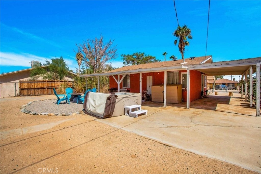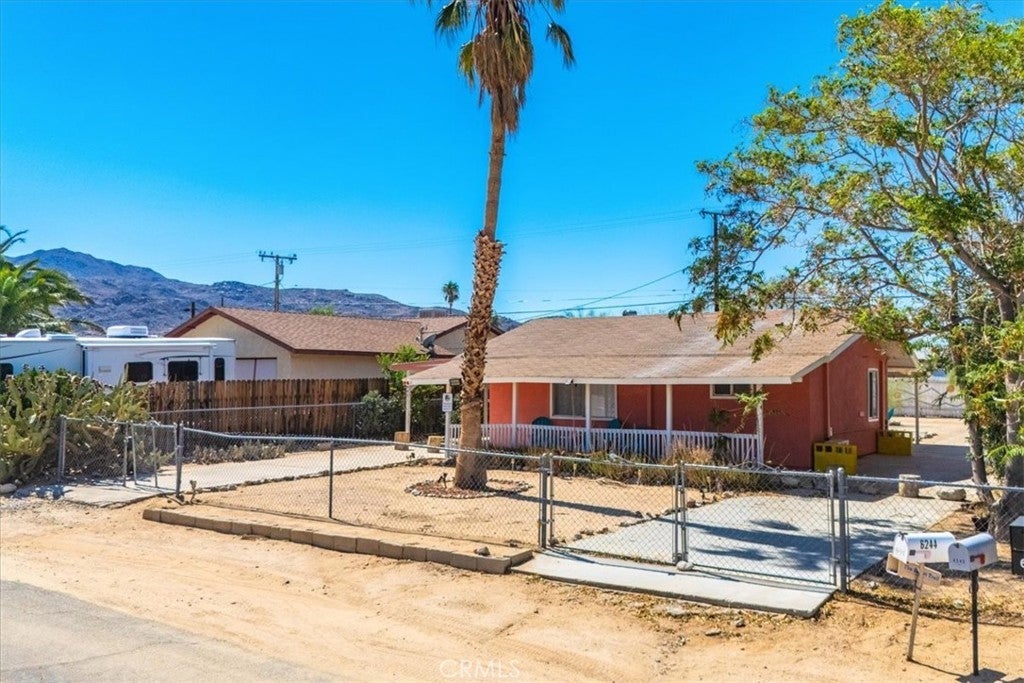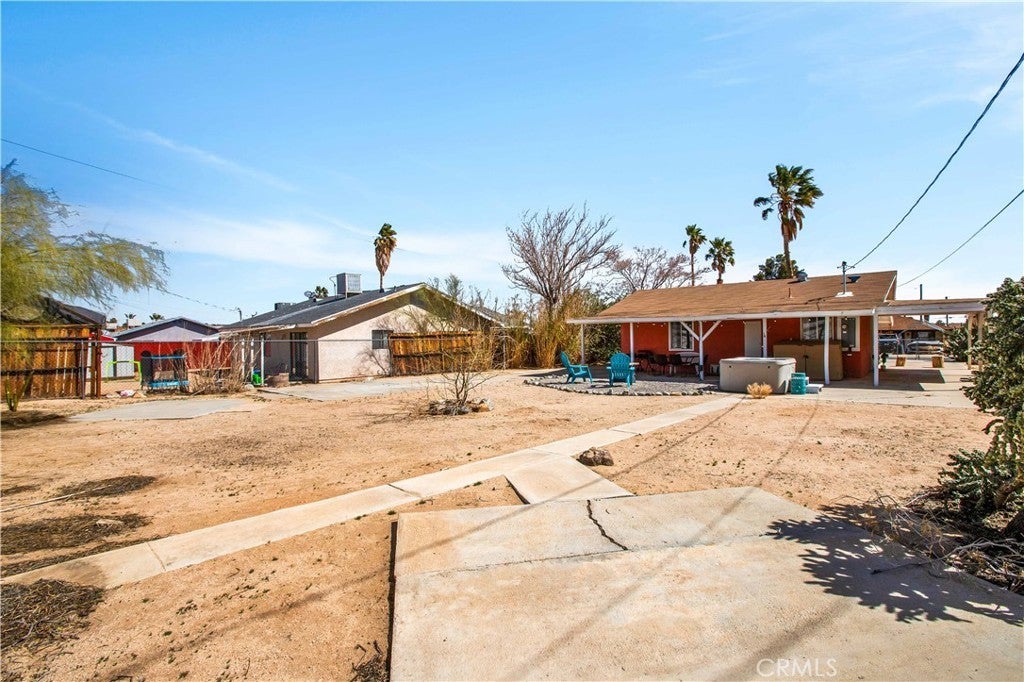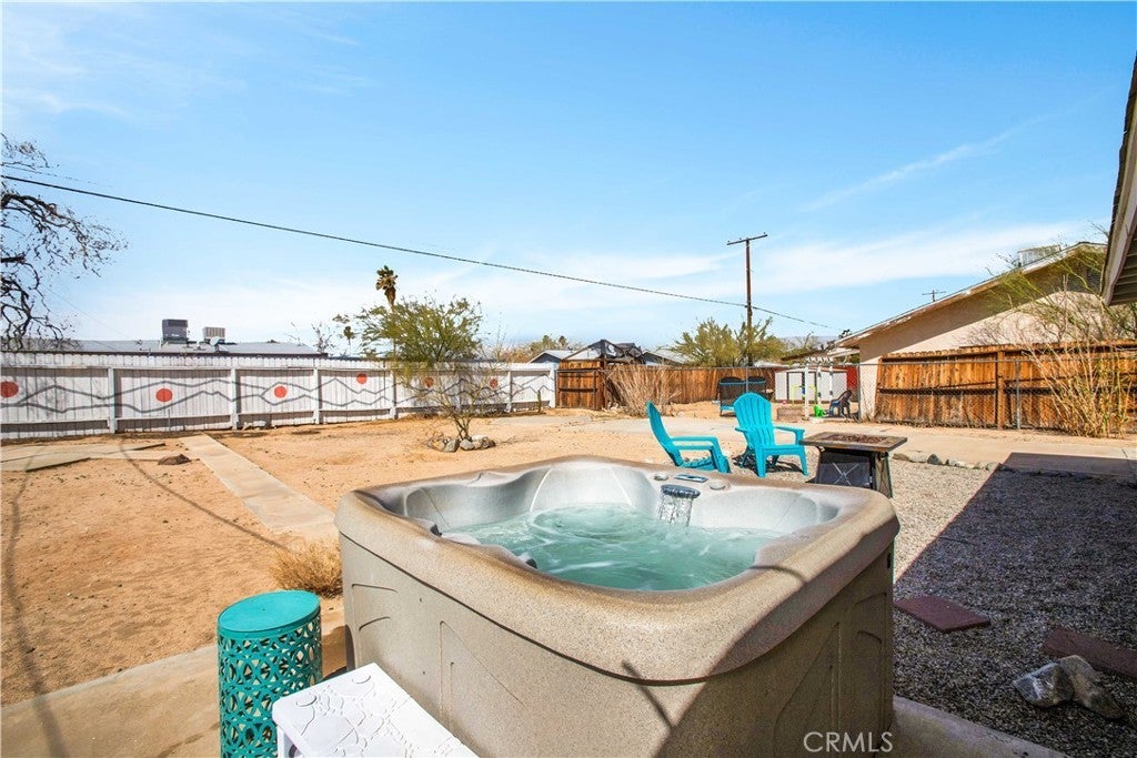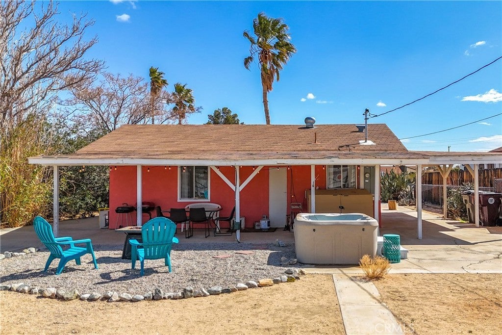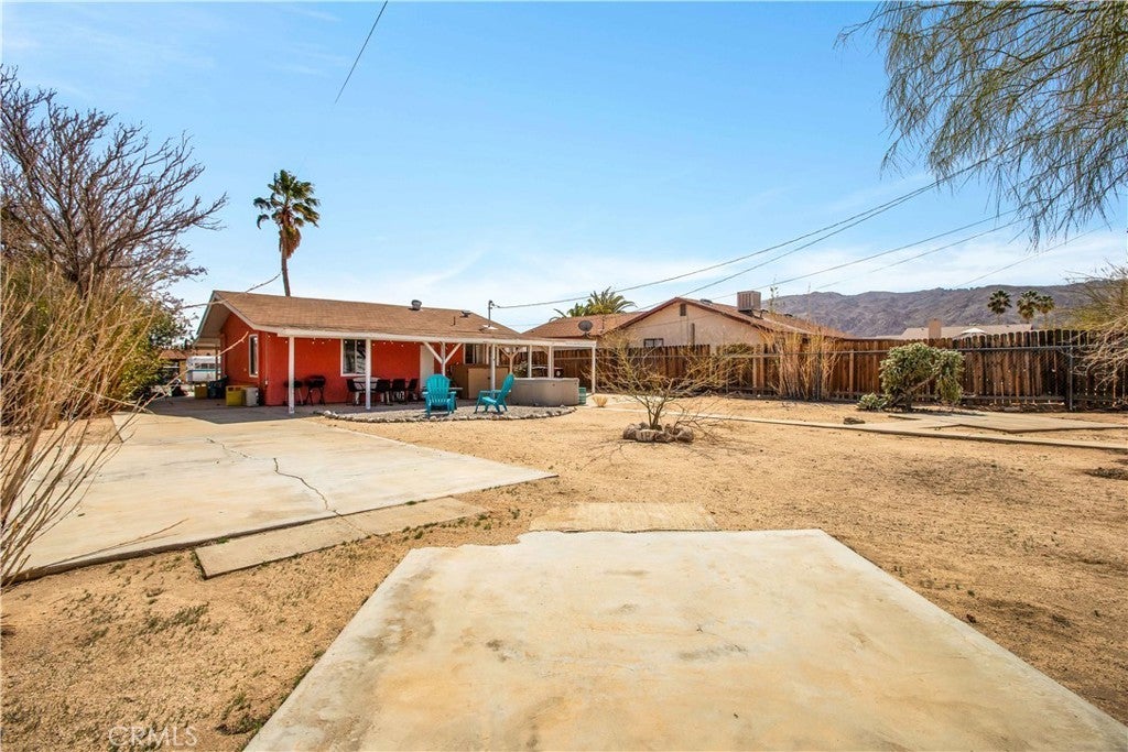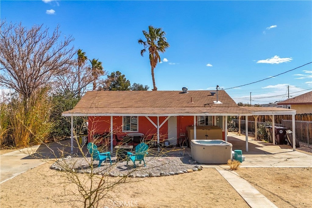This home is turn-key and full of charm. This fully furnished 1-bedroom, 1-bath home is ready for you to move right in or start generating income. Offered fully furnished including a hot tub and all kitchen appliances, this home makes desert living effortless. Inside, the layout feels surprisingly spacious, featuring durable tile flooring throughout and a bathroom with a shower/tub combo plus a convenient linen closet. Home offers an energy-efficient mini-split heating and cooling system. Providing zoned climate control, allowing individual rooms to be independently heated or cooled for enhanced comfort and reduced energy costs. This ductless system offers quiet operation, improved efficiency. As you step outside and enjoy the beautiful wraparound covered patio, perfect for morning coffee or evening relaxation. The spacious backyard offers stunning mountain views, partial wood fencing for privacy along with chain-link fencing, and a covered shed housing the washer and dryer. A fire pit creates the perfect setting to stay warm while stargazing under the desert sky. Great for entertaining or relaxing solo. Ideally located the chocolate drop area, this home offers convenient access to the best of local amenities and desert living. Just minutes from downtown 29 Palms, enjoy nearby popular dining spots, coffee shops, breweries, and local favorites. Everyday conveniences such as grocery stores, banks, pharmacies, and gas stations are all close by along 29 Palms Highway. Outdoor enthusiasts will love the easy access to the north entrance of Joshua Tree National Park, as well as nearby parks, trails, and community recreation areas. The property is also near local schools, the public library, Theatre 29, and seasonal community events making it a great location for both full-time living, weekend escapes, or an investment property.