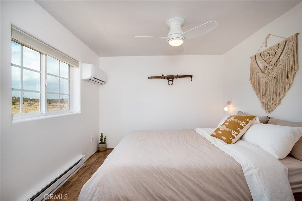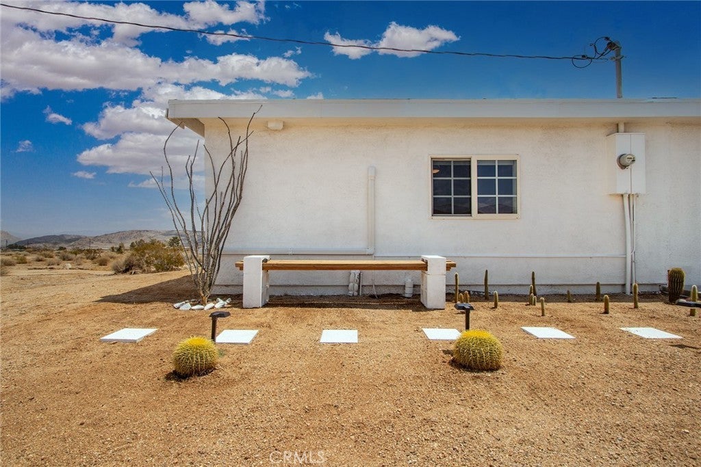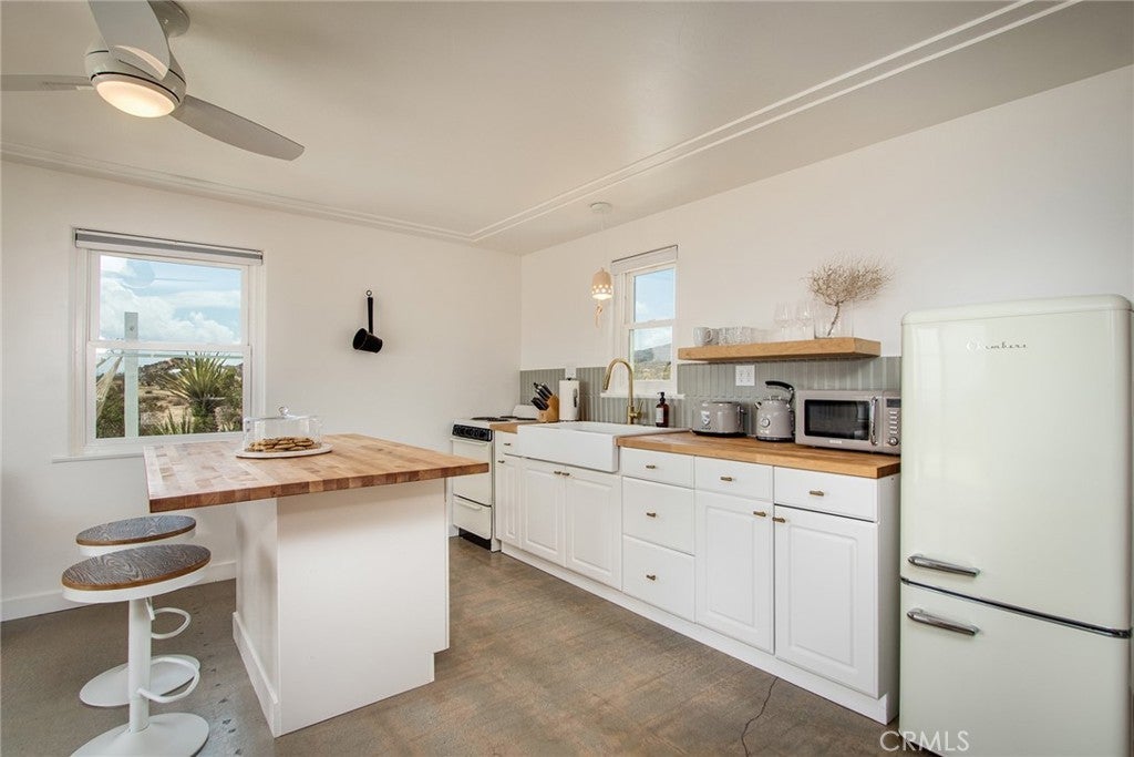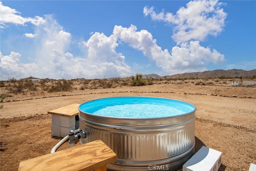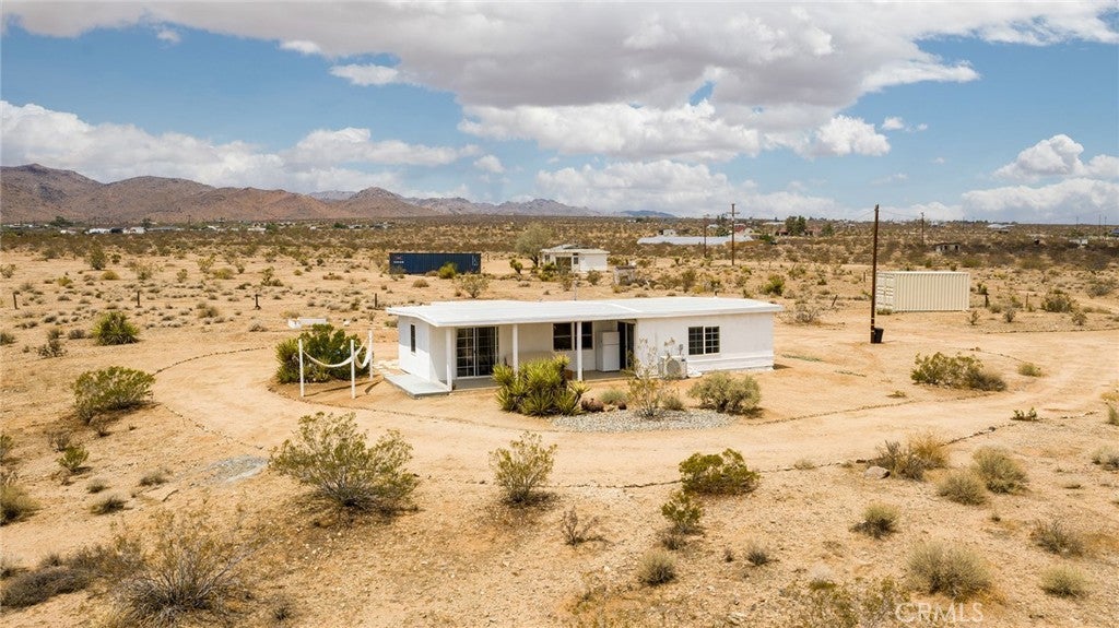 PRICE REDUCTION: Authentic Mid-Century Modern 2-Bedroom/2-Bathroom Bungalow - updated and reimagined by owner/architect, featuring new kitchen cabinets and island with butcher block counters and farmhouse sink. Polished concrete floors throughout. Floor-to-ceiling tile in walk-in shower. Zoned ductless mini-split heating/cooling for efficiency. Heated & Filtered Cowboy pool for year-round use. Shaded front porch to relax for morning or evening beverages. Rural location spread over a large 5-Acre parcel for privacy. Commanding views of iconic Goat Mountain. Short distant to world-famous Giant Rock for wilderness excursions. Local gourmet eateries, including La Copine & Giant Rock Reading room, great for socializing as well. Only a short drive to Joshua Tree National Park and Pappy & Harriet’s in Pioneertown for music. Great getaway but also perfect for remote work. Whether a vacation getaway or a primary residence, the rural ambiance is the grounding factor along with its convenient location to shopping & dining in nearby Flamingo Heights, Yucca Valley or Joshua Tree.