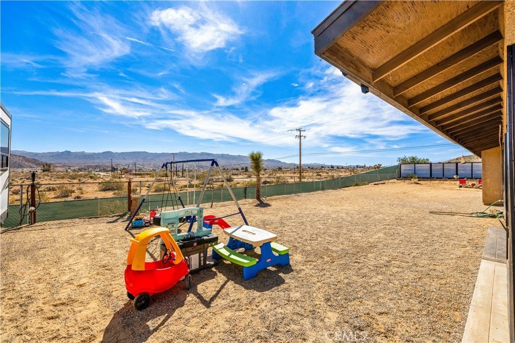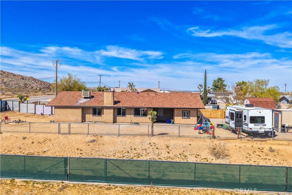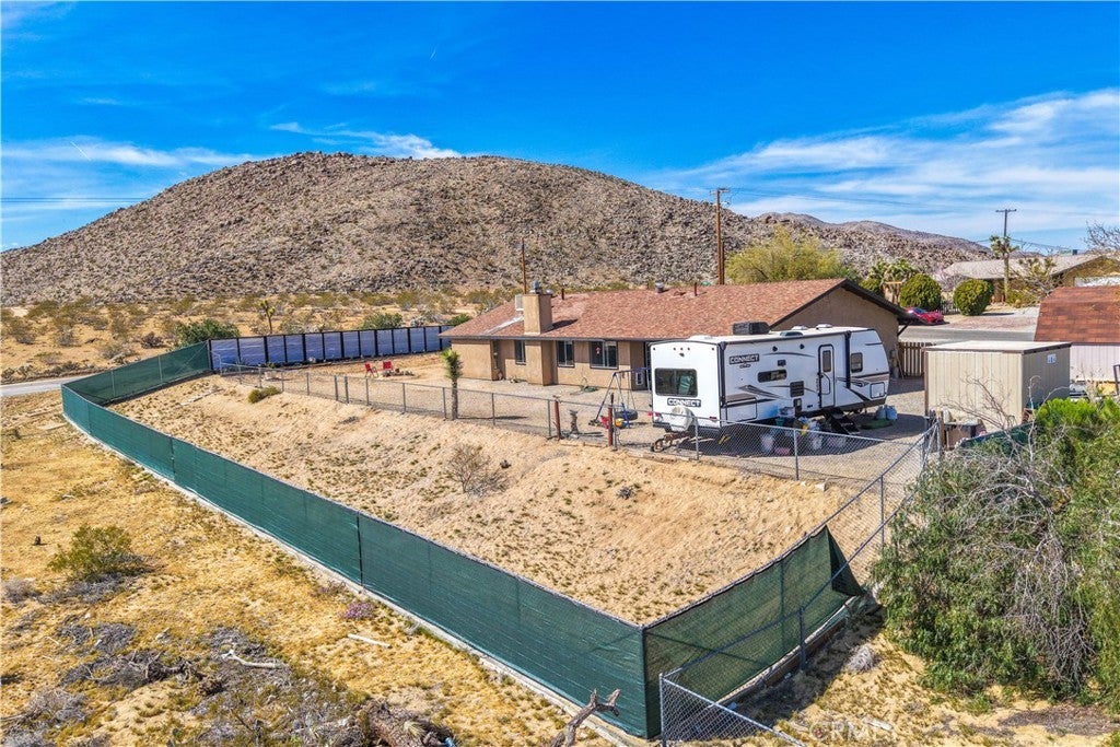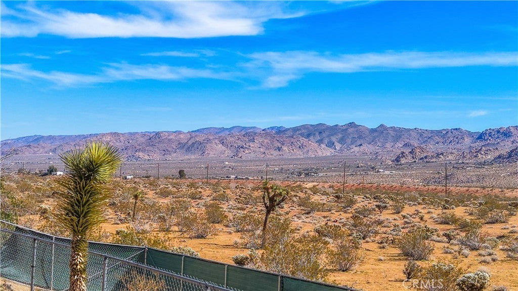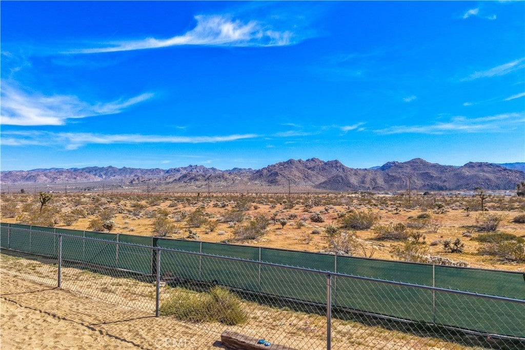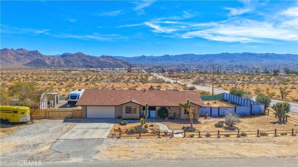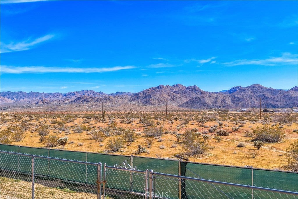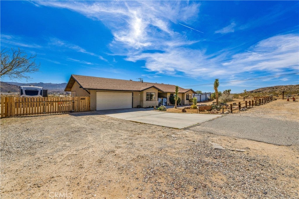 This spacious 3-bedroom, 2-bath home sits on a large corner lot and offers incredible views of the surrounding mountains near Joshua Tree National Park. As you approach the property, you’ll appreciate the mature desert landscaping and the abundance of parking. A concrete driveway leads to the attached two-car garage, while a side yard with a drive-through gate provides convenient RV parking with hookups along with plenty of additional space for trailers, vehicles, or desert toys. Before entering the home, you’ll pass through a gated front entry that creates a private courtyard, perfect for enjoying a quiet cup of coffee in the morning. Inside, the home welcomes you with beautiful vaulted tongue-and-groove ceilings in the living room and large banks of windows that bring in natural light and showcase the stunning mountain views. The open floor plan allows the living room to flow seamlessly into the dining area and kitchen, creating a comfortable and functional layout for everyday living and entertaining. The remodeled kitchen features butcher block countertops, a stylish backsplash, stainless steel appliances, and an island, along with an office desk space just off the kitchen. Nearby, a multipurpose room serves as both the laundry area and additional pantry or storage space. The primary bedroom is generously sized and offers ample closet storage. The ensuite bathroom has been remodeled and includes a new vanity and a stylish walk-in shower. The two additional bedrooms are both spacious, and the conveniently located guest bathroom has also been updated and features a shower-tub combo. The attached two-car garage includes an additional storage room, providing even more space for tools, equipment, or hobbies. Outside, the fully fenced backyard offers flat, usable space with beautiful views, along with two storage sheds, RV hookups, and a cross-fenced area that creates a large dog run. This home is ideally located close to downtown Joshua Tree, just down the street from Joshua Tree Elementary School, with the bus stop conveniently located right at the corner of the property. Homes with this combination of views, space, RV parking, and location are hard to find—schedule your showing today and come experience everything this property has to offer.