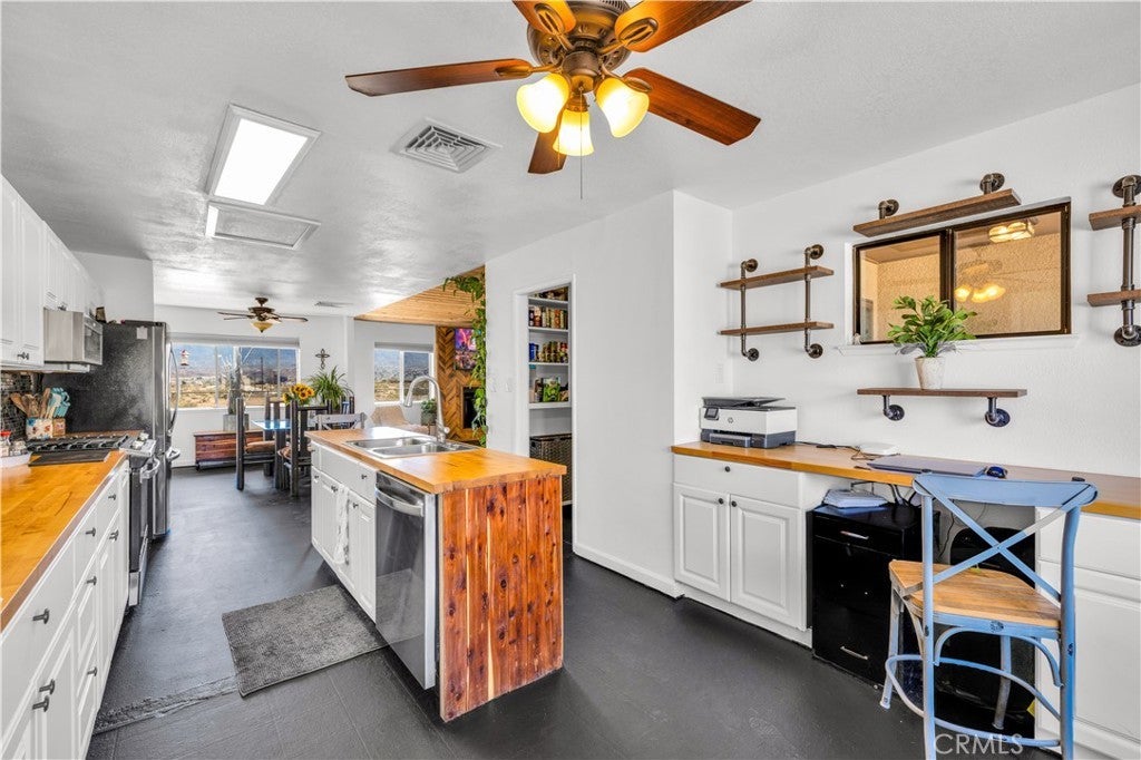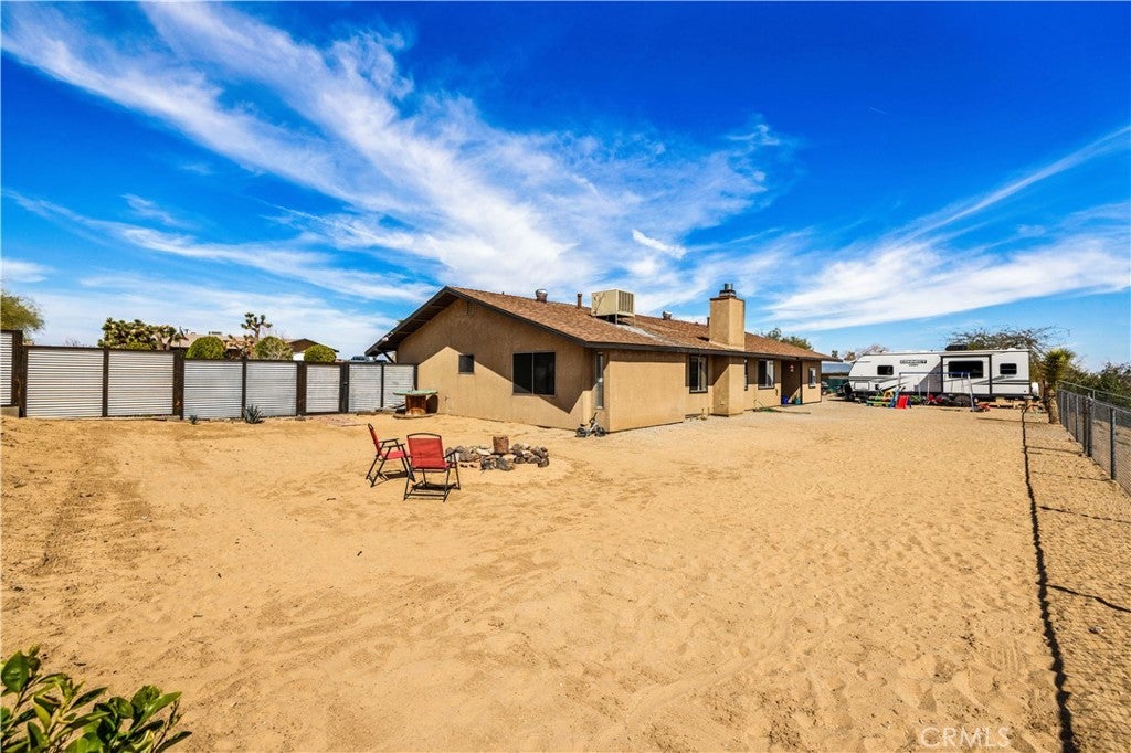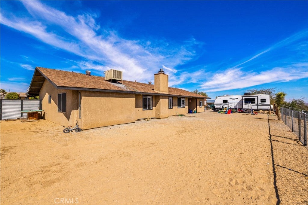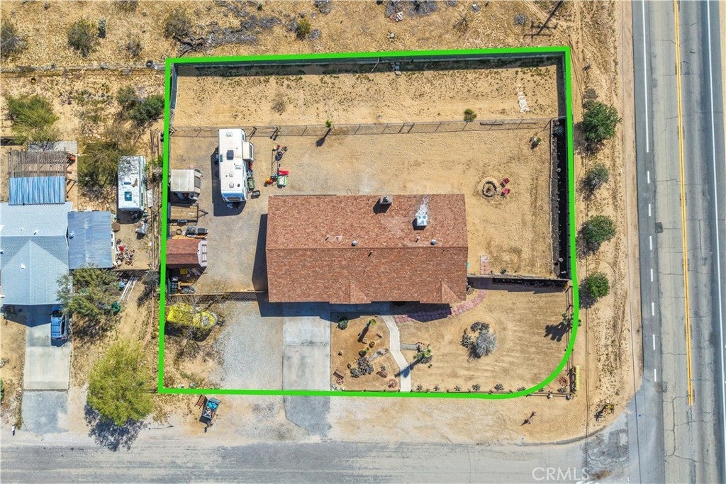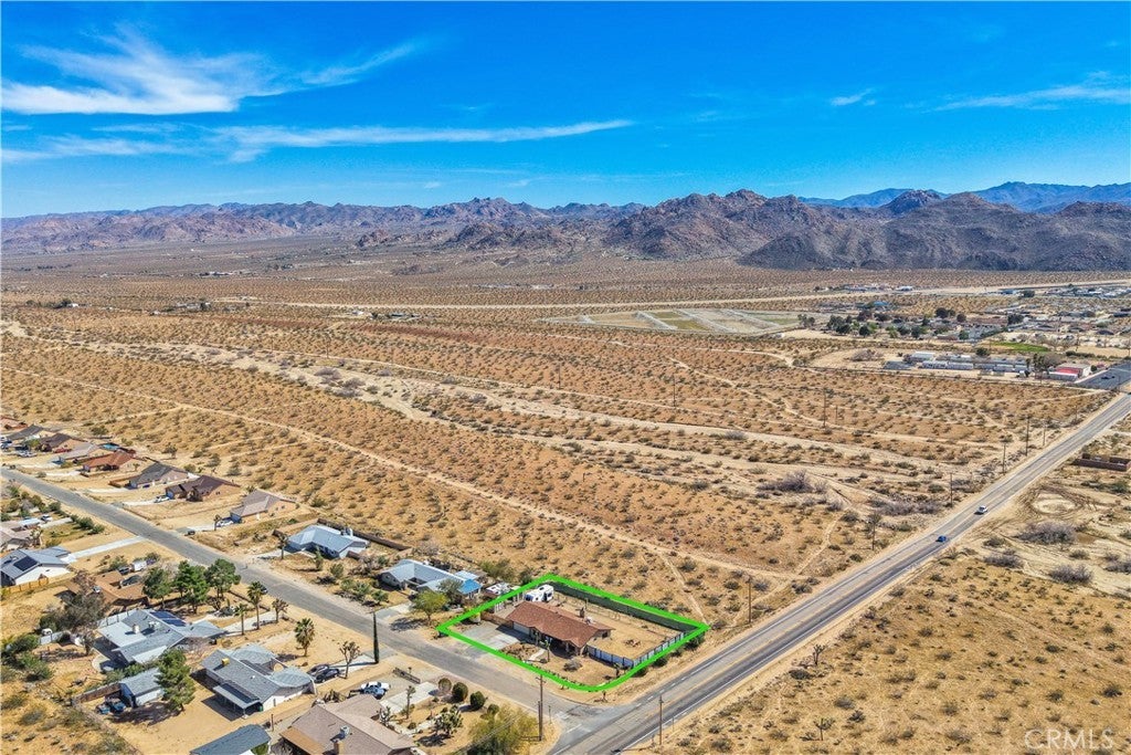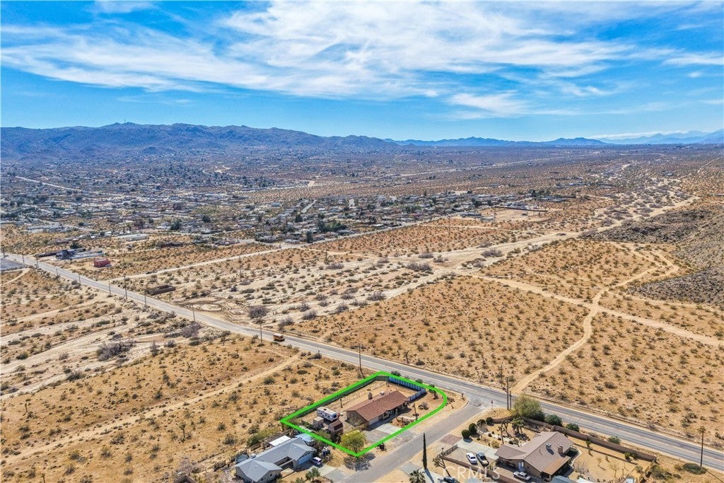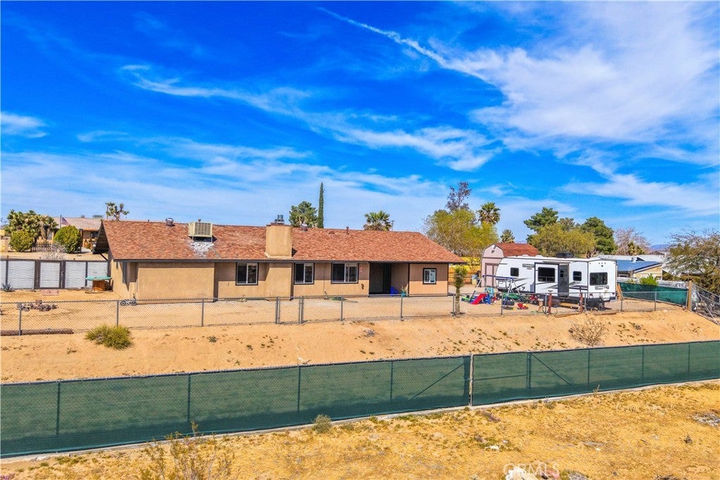 This spacious 3-bedroom, 2-bath home sits on a large corner lot and offers incredible views of the surrounding mountains near Joshua Tree National Park. As you approach the property, you’ll appreciate the mature desert landscaping and the abundance of parking. A concrete driveway leads to the attached two-car garage, while a side yard with a drive-through gate provides convenient RV parking with hookups along with plenty of additional space for trailers, vehicles, or desert toys. Before entering the home, you’ll pass through a gated front entry that creates a private courtyard, perfect for enjoying a quiet cup of coffee in the morning. Inside, the home welcomes you with beautiful vaulted tongue-and-groove ceilings in the living room and large banks of windows that bring in natural light and showcase the stunning mountain views. The open floor plan allows the living room to flow seamlessly into the dining area and kitchen, creating a comfortable and functional layout for everyday living and entertaining. The remodeled kitchen features butcher block countertops, a stylish backsplash, stainless steel appliances, and an island, along with an office desk space just off the kitchen. Nearby, a multipurpose room serves as both the laundry area and additional pantry or storage space. The primary bedroom is generously sized and offers ample closet storage. The ensuite bathroom has been remodeled and includes a new vanity and a stylish walk-in shower. The two additional bedrooms are both spacious, and the conveniently located guest bathroom has also been updated and features a shower-tub combo. The attached two-car garage includes an additional storage room, providing even more space for tools, equipment, or hobbies. Outside, the fully fenced backyard offers flat, usable space with beautiful views, along with two storage sheds, RV hookups, and a cross-fenced area that creates a large dog run. This home is ideally located close to downtown Joshua Tree, just down the street from Joshua Tree Elementary School, with the bus stop conveniently located right at the corner of the property. Homes with this combination of views, space, RV parking, and location are hard to find—schedule your showing today and come experience everything this property has to offer.