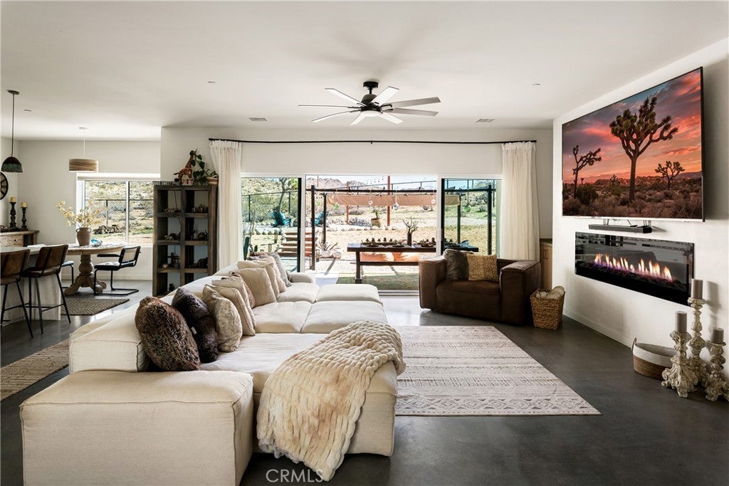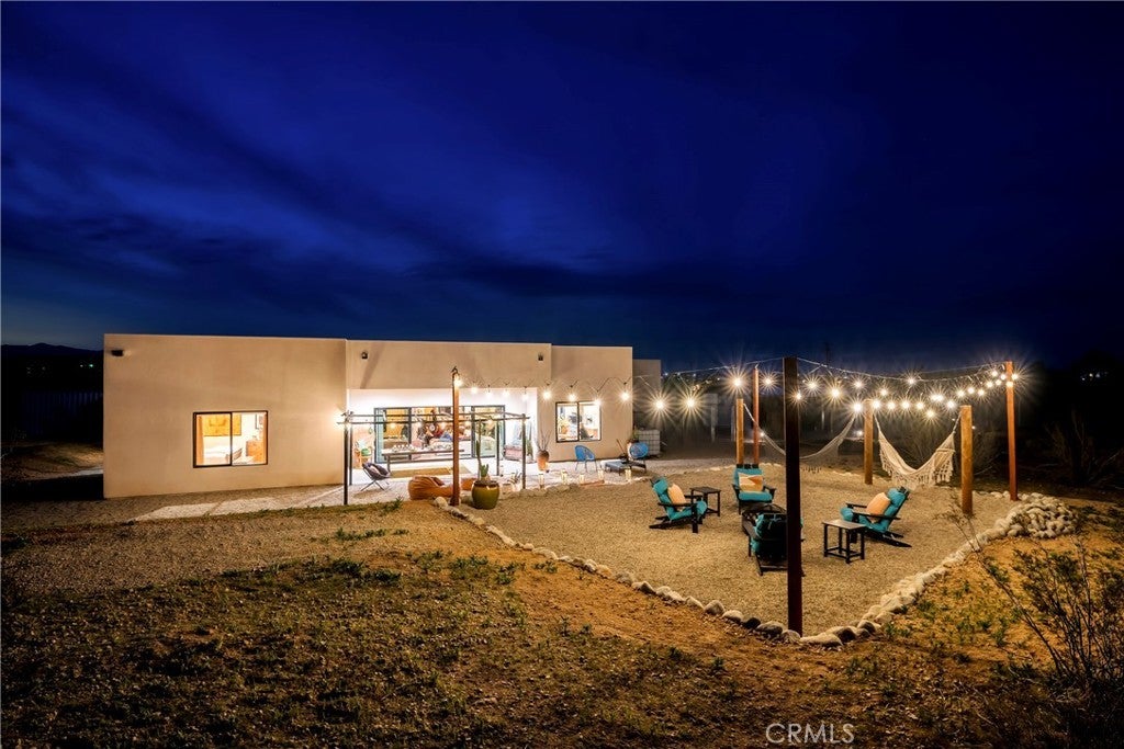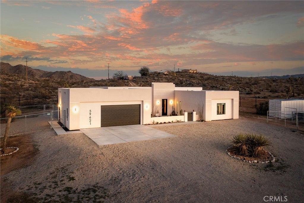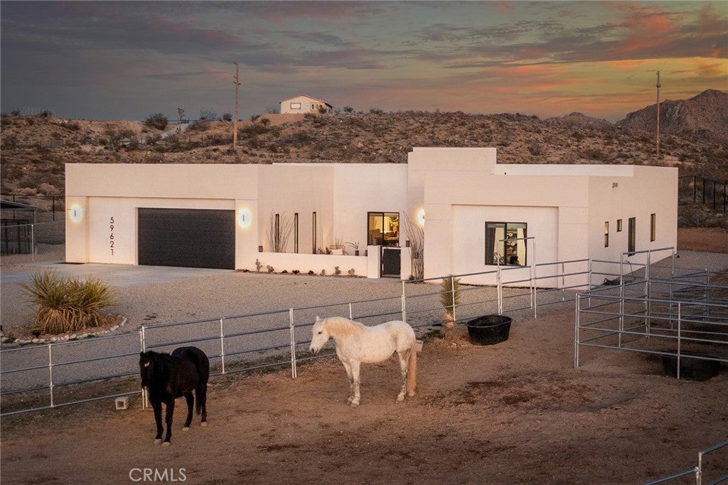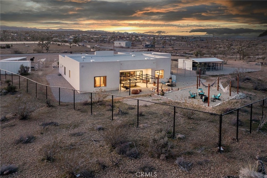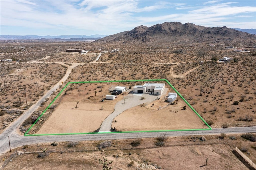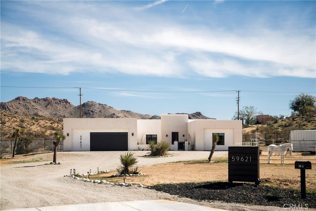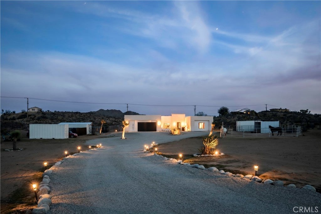 Modern living meets rural desert luxury on the Yucca Mesa, where higher elevation brings cooler summers and occasional snowfall in the winter. This newly built 2024 home features three en-suite bedrooms plus a separate powder room, high-end finishes throughout including a river rock stone sink, micro cement walls, polished concrete floors, ceramic and quartz counters, and custom light fixtures, with expansive windows and sliders framing 360° views from the Joshua Tree National Park ridgeline to the snow-capped peaks of San Jacinto and Big Bear. A long driveway sets a striking approach and guides you past the horse stables before arriving at the front gated courtyard, wrapped by a smooth stucco wall and landscaped with beautiful cacti and desert plants, centered around a built-in fire pit for sunset skies. The fenced backyard captures sunrise views, also framed by dramatic mountain backdrops. Inside, custom-designed storage cabinets run from the entry through the hallway, complemented by vertical glass panes that bring in views and soft, indirect lighting. The open-concept living, dining, and kitchen space is anchored by a large kitchen island, creating an easy flow for cooking, entertaining, and relaxing, while large sliders connect the living area to a covered patio for seamless indoor-outdoor living. The kitchen is finished with quartz counters, stainless appliances, a 36" range, and a large walk-in pantry; a conveniently located laundry room sits just off the kitchen and leads to a large attached two-car garage with additional window panels that bring in natural light. The primary suite offers a walk-in closet, private water closet, and a spa-style bath with double sinks, a separate shower, and a soaking tub positioned by a beautiful window with views. Just a few minutes from downtown Joshua Tree and the park entrance, with easy access to Pioneertown and downtown Yucca Valley, this home is ideal as a primary residence, vacation home, or short-term rental opportunity.