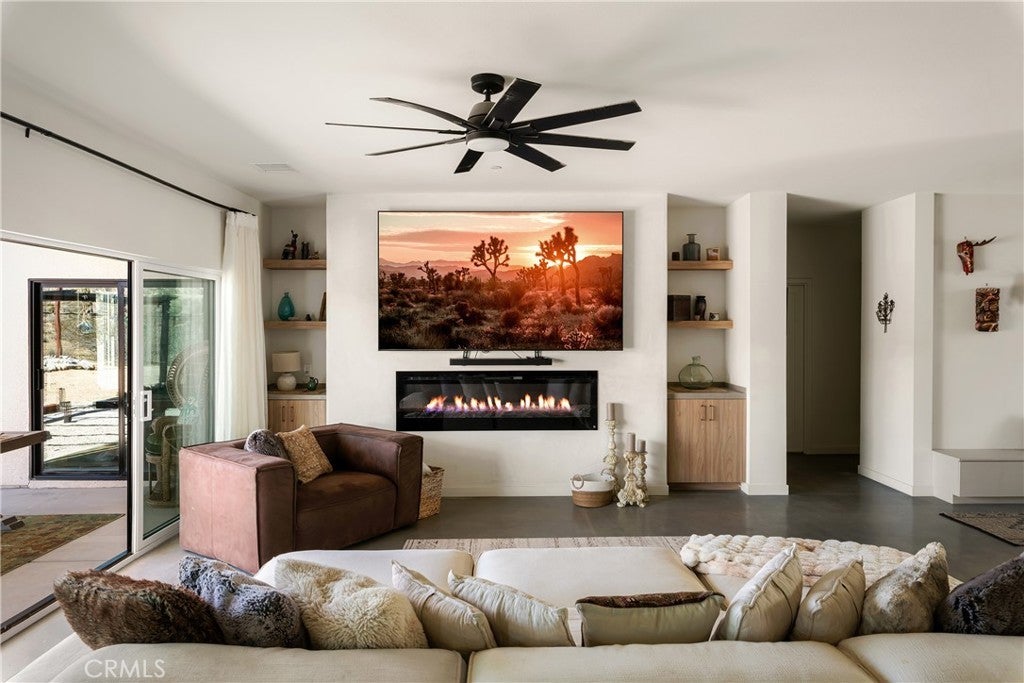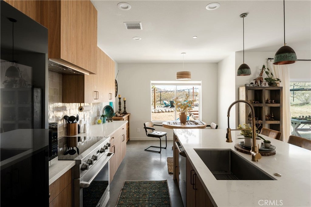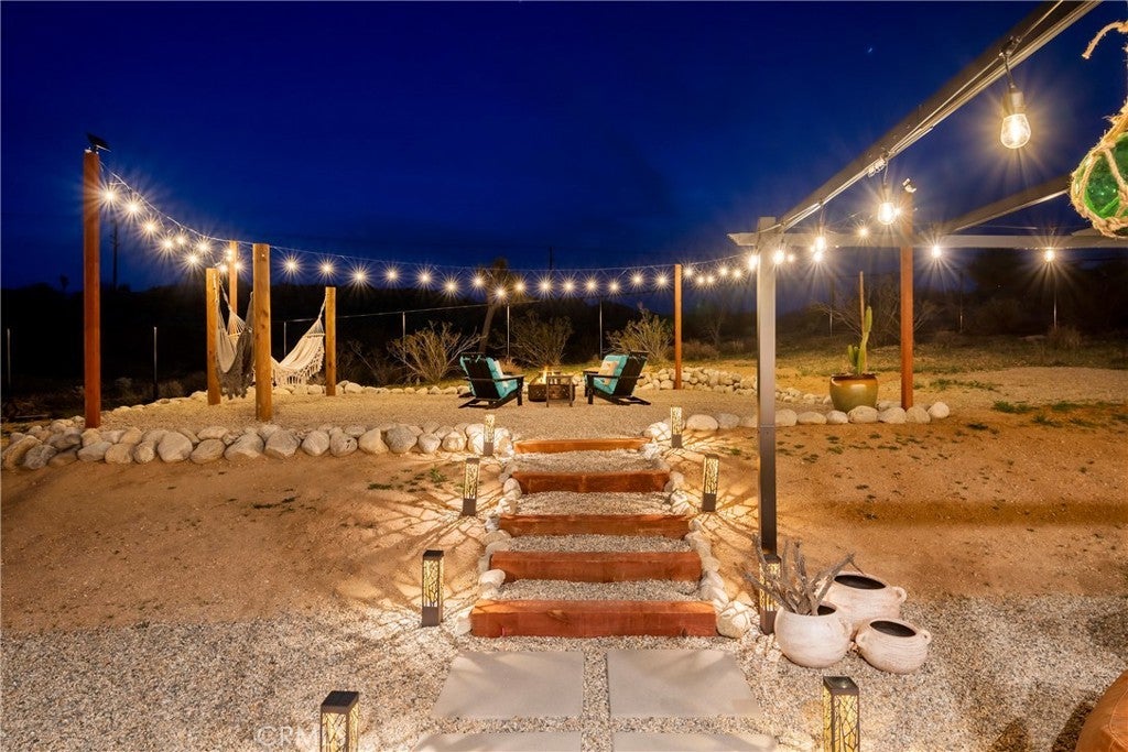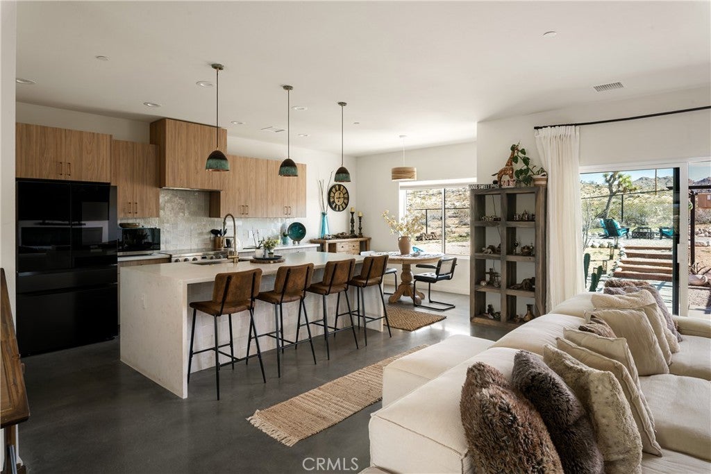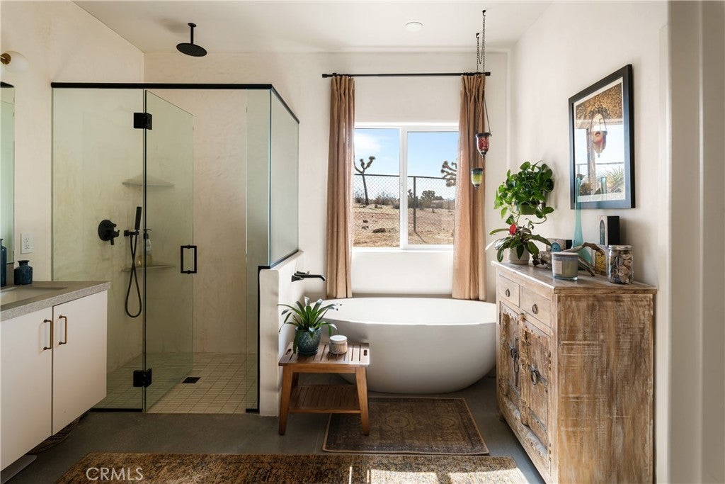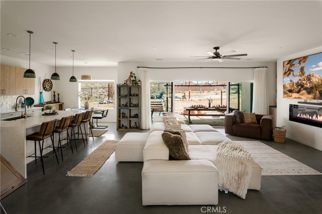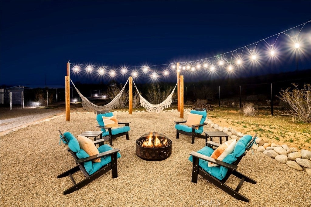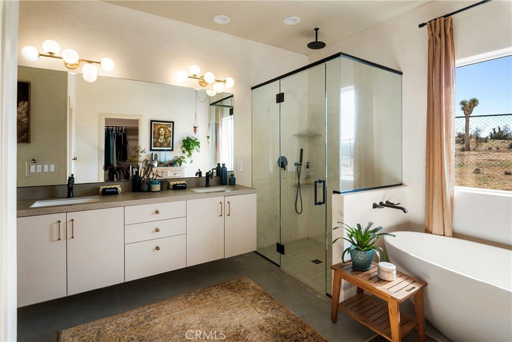 Modern living meets rural desert luxury on the Yucca Mesa, where higher elevation brings cooler summers and occasional snowfall in the winter. This newly built 2024 home features three en-suite bedrooms plus a separate powder room, high-end finishes throughout including a river rock stone sink, micro cement walls, polished concrete floors, ceramic and quartz counters, and custom light fixtures, with expansive windows and sliders framing 360° views from the Joshua Tree National Park ridgeline to the snow-capped peaks of San Jacinto and Big Bear. A long driveway sets a striking approach and guides you past the horse stables before arriving at the front gated courtyard, wrapped by a smooth stucco wall and landscaped with beautiful cacti and desert plants, centered around a built-in fire pit for sunset skies. The fenced backyard captures sunrise views, also framed by dramatic mountain backdrops. Inside, custom-designed storage cabinets run from the entry through the hallway, complemented by vertical glass panes that bring in views and soft, indirect lighting. The open-concept living, dining, and kitchen space is anchored by a large kitchen island, creating an easy flow for cooking, entertaining, and relaxing, while large sliders connect the living area to a covered patio for seamless indoor-outdoor living. The kitchen is finished with quartz counters, stainless appliances, a 36" range, and a large walk-in pantry; a conveniently located laundry room sits just off the kitchen and leads to a large attached two-car garage with additional window panels that bring in natural light. The primary suite offers a walk-in closet, private water closet, and a spa-style bath with double sinks, a separate shower, and a soaking tub positioned by a beautiful window with views. Just a few minutes from downtown Joshua Tree and the park entrance, with easy access to Pioneertown and downtown Yucca Valley, this home is ideal as a primary residence, vacation home, or short-term rental opportunity.