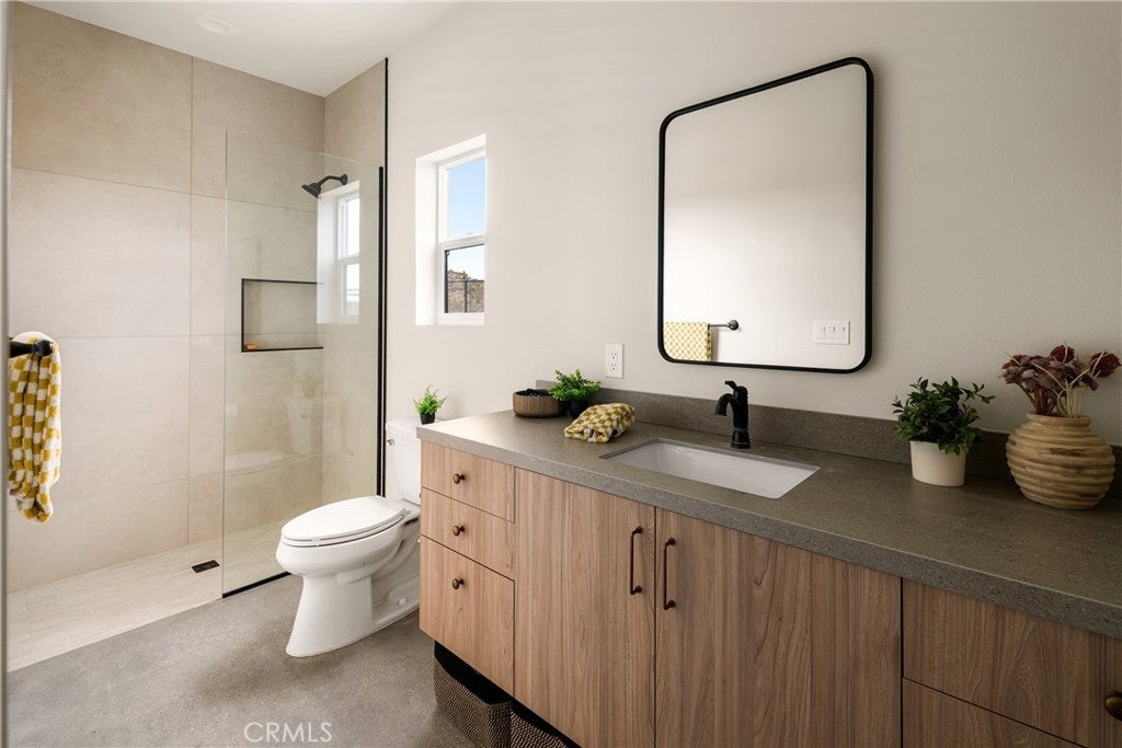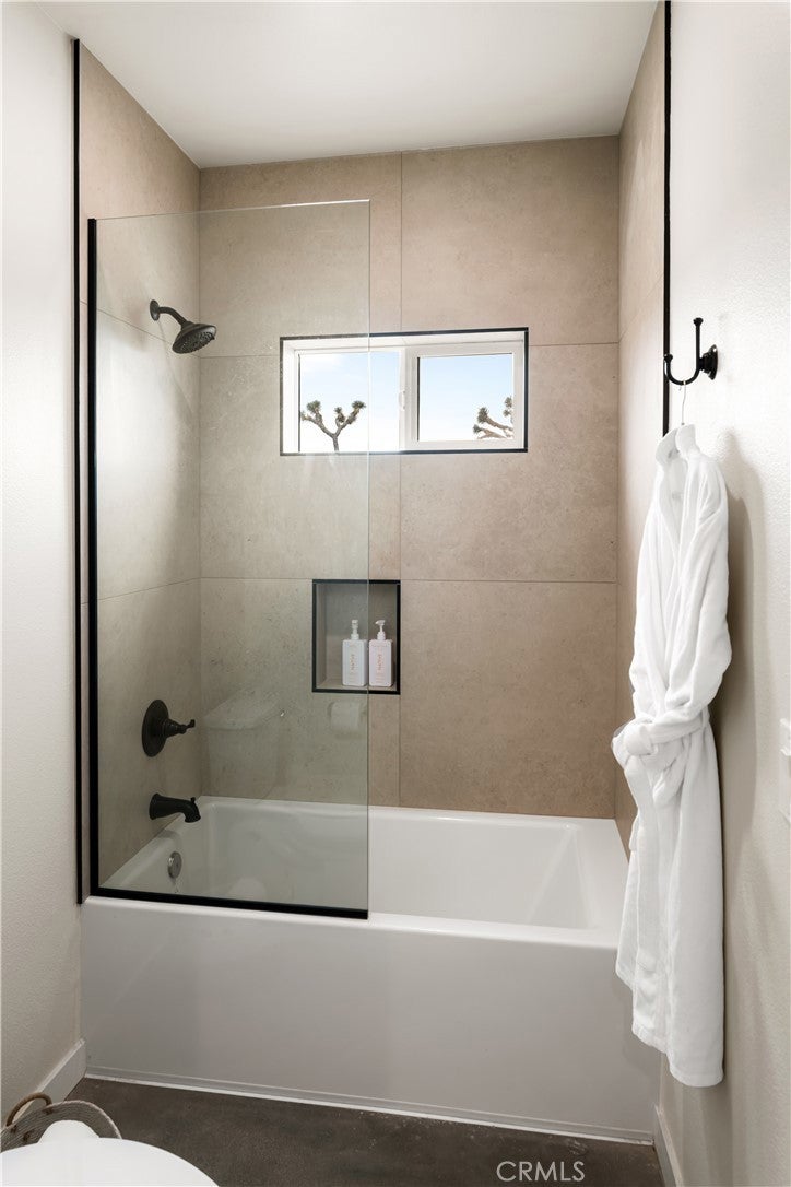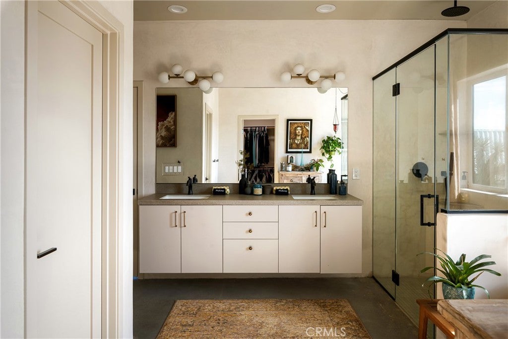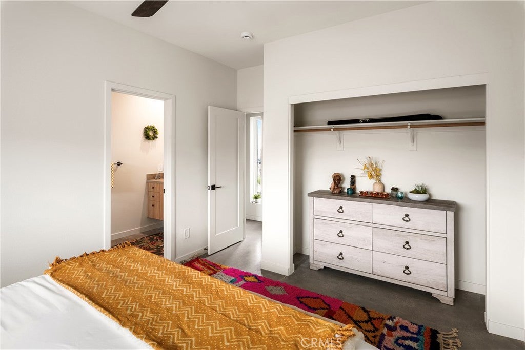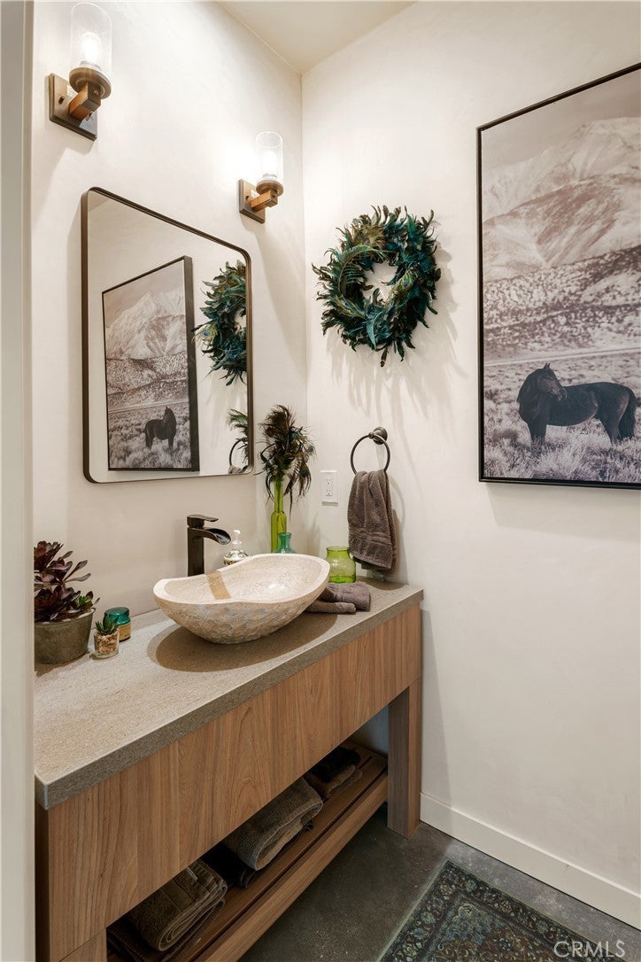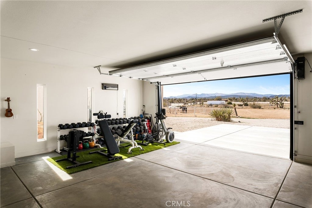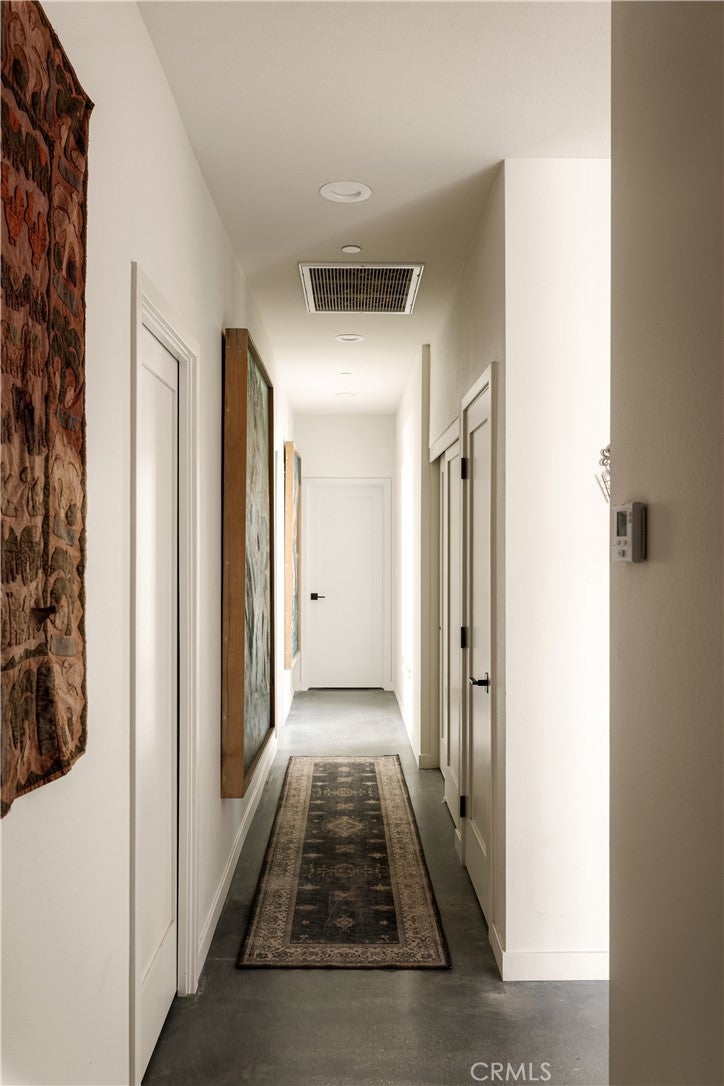 Modern living meets rural desert luxury on the Yucca Mesa, where higher elevation brings cooler summers and occasional snowfall in the winter. This newly built 2024 home features three en-suite bedrooms plus a separate powder room, high-end finishes throughout including a river rock stone sink, micro cement walls, polished concrete floors, ceramic and quartz counters, and custom light fixtures, with expansive windows and sliders framing 360° views from the Joshua Tree National Park ridgeline to the snow-capped peaks of San Jacinto and Big Bear. A long driveway sets a striking approach and guides you past the horse stables before arriving at the front gated courtyard, wrapped by a smooth stucco wall and landscaped with beautiful cacti and desert plants, centered around a built-in fire pit for sunset skies. The fenced backyard captures sunrise views, also framed by dramatic mountain backdrops. Inside, custom-designed storage cabinets run from the entry through the hallway, complemented by vertical glass panes that bring in views and soft, indirect lighting. The open-concept living, dining, and kitchen space is anchored by a large kitchen island, creating an easy flow for cooking, entertaining, and relaxing, while large sliders connect the living area to a covered patio for seamless indoor-outdoor living. The kitchen is finished with quartz counters, stainless appliances, a 36" range, and a large walk-in pantry; a conveniently located laundry room sits just off the kitchen and leads to a large attached two-car garage with additional window panels that bring in natural light. The primary suite offers a walk-in closet, private water closet, and a spa-style bath with double sinks, a separate shower, and a soaking tub positioned by a beautiful window with views. Just a few minutes from downtown Joshua Tree and the park entrance, with easy access to Pioneertown and downtown Yucca Valley, this home is ideal as a primary residence, vacation home, or short-term rental opportunity.
