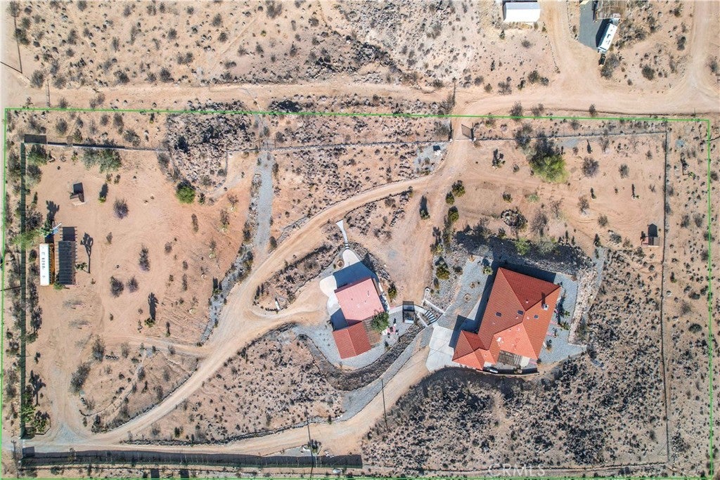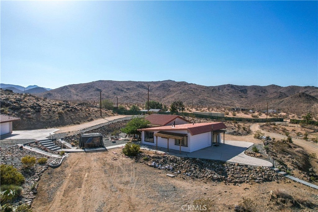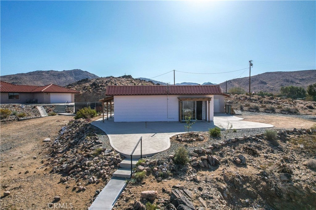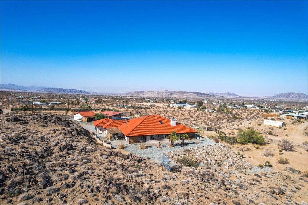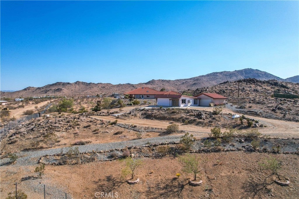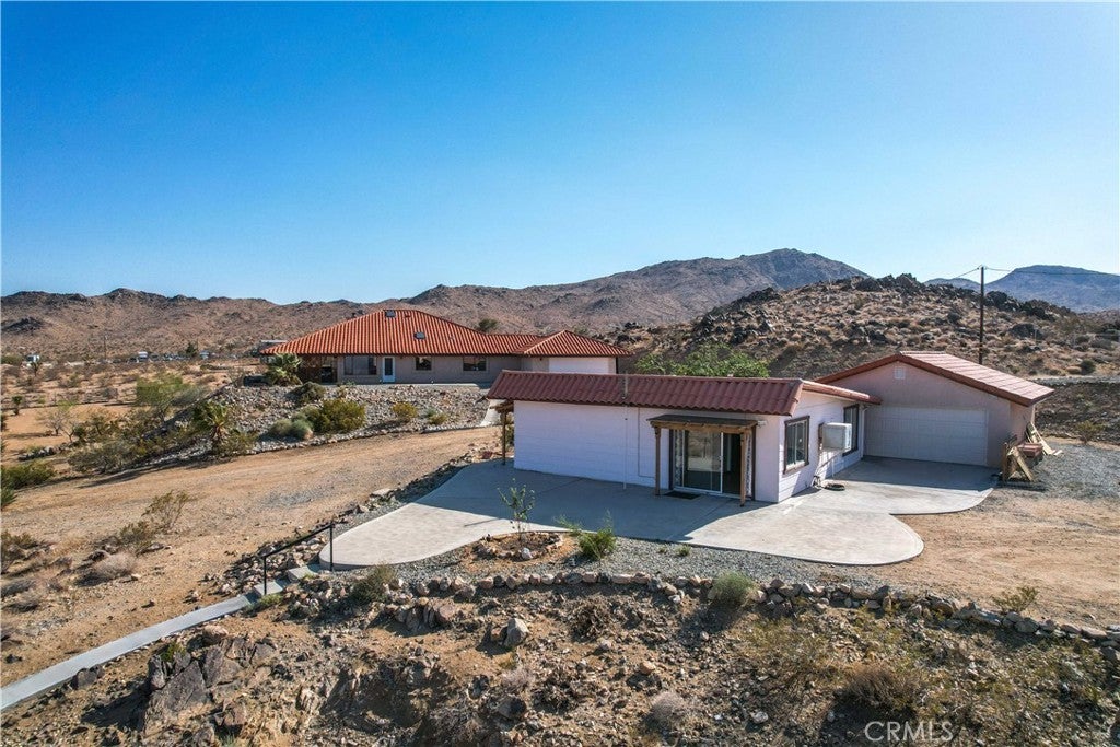 You will be amazed at the stunning views when you arrive. This one-of-a-kind property has two homes nestled against natural rocks. Main home has 2 bedrooms, 2 bathrooms, and a large great room with wood-beamed vaulted ceiling. Extraordinary views from windows on 3 sides. Kitchen has Corian counters with tons of cabinets. L-shape kitchen island has bar seating. Two large bedrooms with 3 walk-in closets. Huge soaking tub in the master bath. There is a south-facing sunroom which is perfect for soaking up the winter sun. The indoor laundry room has plenty of cabinets for all your storage needs. 2 car attached garage. The front patio runs the length of the home and provides endless eastern views. This home is perfect for hosting large parties or gatherings. The 2nd home has 1 bedroom, 1 bath with an enclosed porch. It also has it's own detached 2 car garage. The views from this 2nd home are incredible as well. The entire property of 5 acres is fully fenced with two gated entrances. Property is dotted with Joshua Trees, Palm Trees, Palo Verde trees, and Mojave Yuccas. Natural desert wildlife can often be seen, such as Quail, Rabbits, Coyotes and more. Landers is home to the Integraton, La Copine restaurant and world-famous Gublers Orchids. Popular riding trails nearby. Joshua Tree National Park is a mere 25 minutes away. Big Bear is 1 hour drive. This amazing property is perfect for vacation rental, wedding venue or other creative ideas. Live in one and rent the other. Many possibilities. Make your appointment to view today. Buyer to verify details and zoning etc.