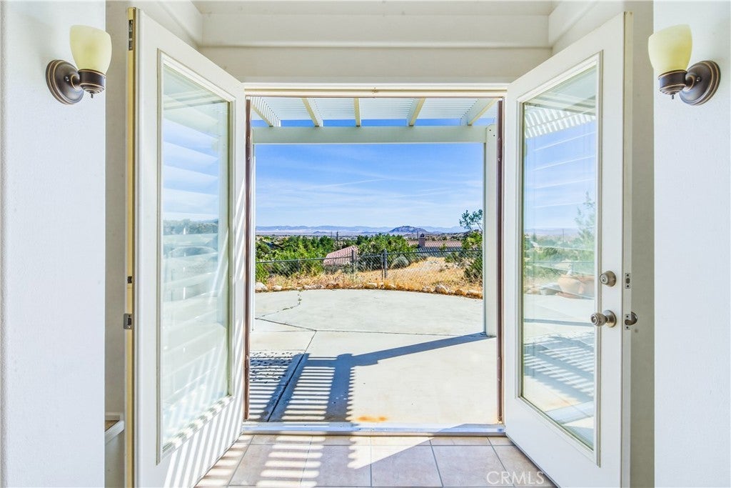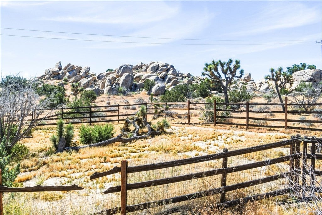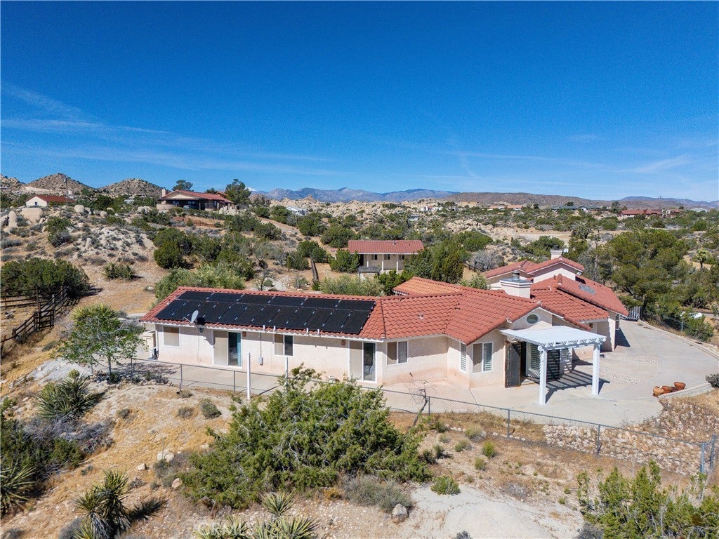 Relax and refresh at this serene custom home with panoramic views of the surrounding hills and valleys, mature landscapes of junipers, Joshua trees and plenty of boulders, all on 2.38 acres. The private driveway leads to a generous parking area and distinctive 2556 sq ft 3 bedroom, 3 bath main house, along with a standalone 450+ sq ft permitted studio/office that blend desert character with contemporary comforts. With >3000 sq ft in total, the home offers plenty of space for both entertaining and everyday life with abundant natural light and high ceilings. The great room includes a living room with a two-sided fireplace and a large formal dining room. There’s also a separate family room with its own fireplace. Custom interior finishes combined with plantation shutters and wraps-around patios extend living spaces into the desert landscape. The chef-ready kitchen features more expansive views, a large island with sink, newer top-of-the-line appliances, durable counters, and an oversized pantry. Other main house amenities include a generous laundry with washer and dryer and an oversized two car garage. The studio with a common area, mini-kitchen, upscale bath, new mini split system and ample storage is a perfect retreat or artist’s studio. Its private patio creates a lovely outdoor area for evenings under the stars. Sustainable items include a paid solar system (under NEM2.0) and two brand-new Tesla Powerwall 3 batteries which provide robust off-grid capability. A newer energy efficient heat-pump system provides both heating and cooling for the main house, along with 2 additional mini split units. Outside the property is ready to create an equestrian dream with room to add horse facilities. Located close to Joshua Tree National Park and Pioneer town.