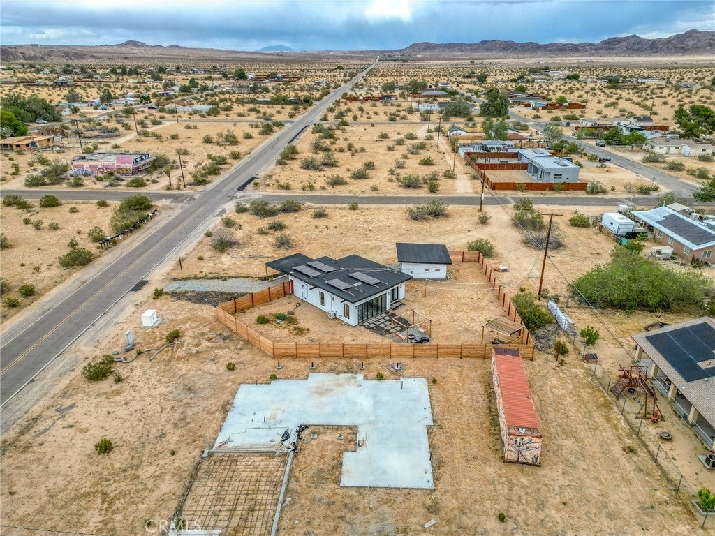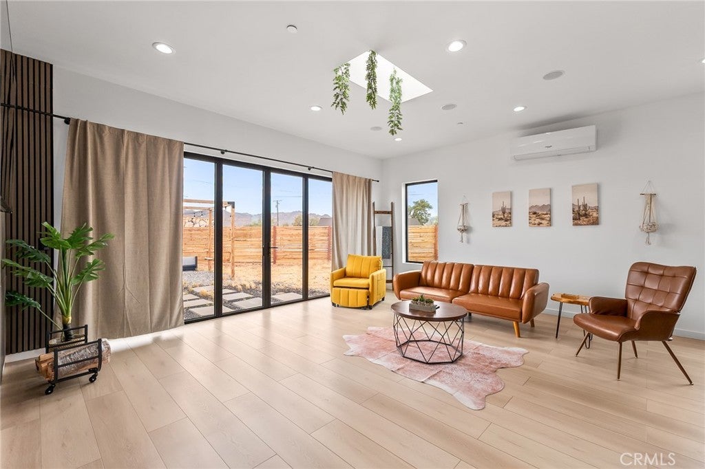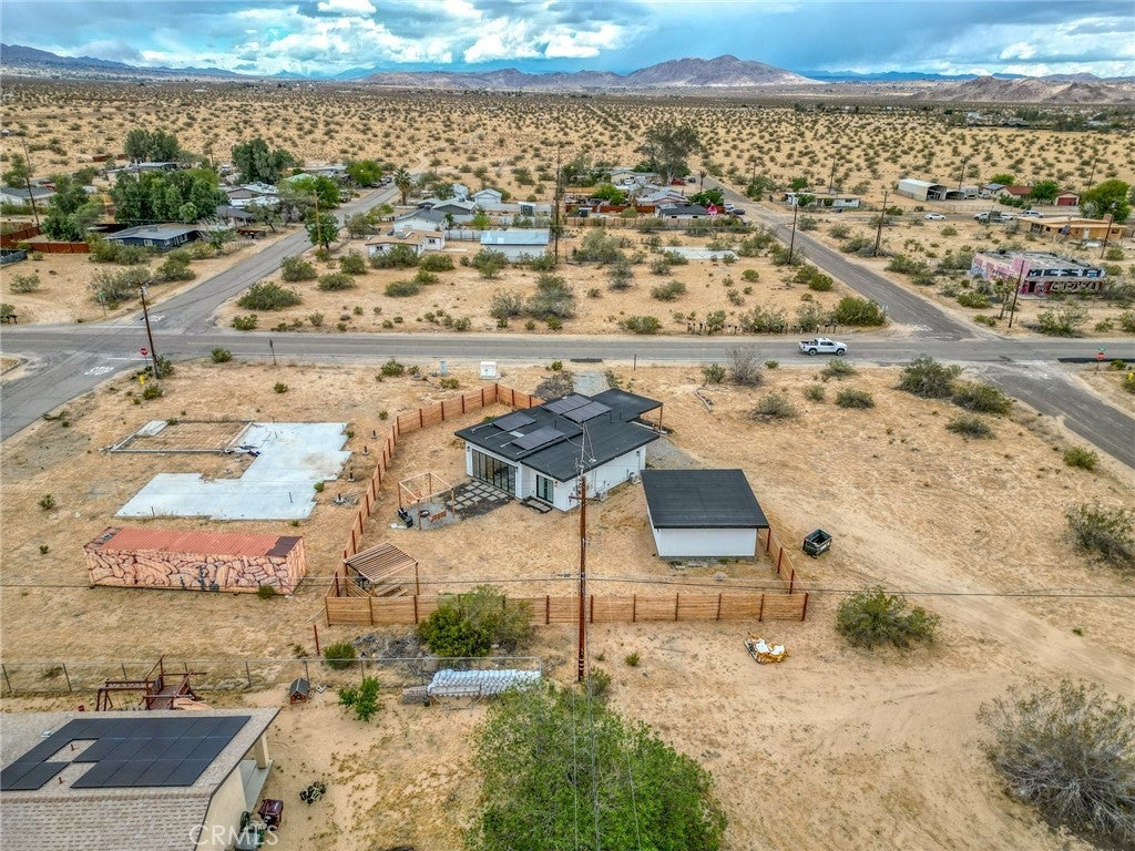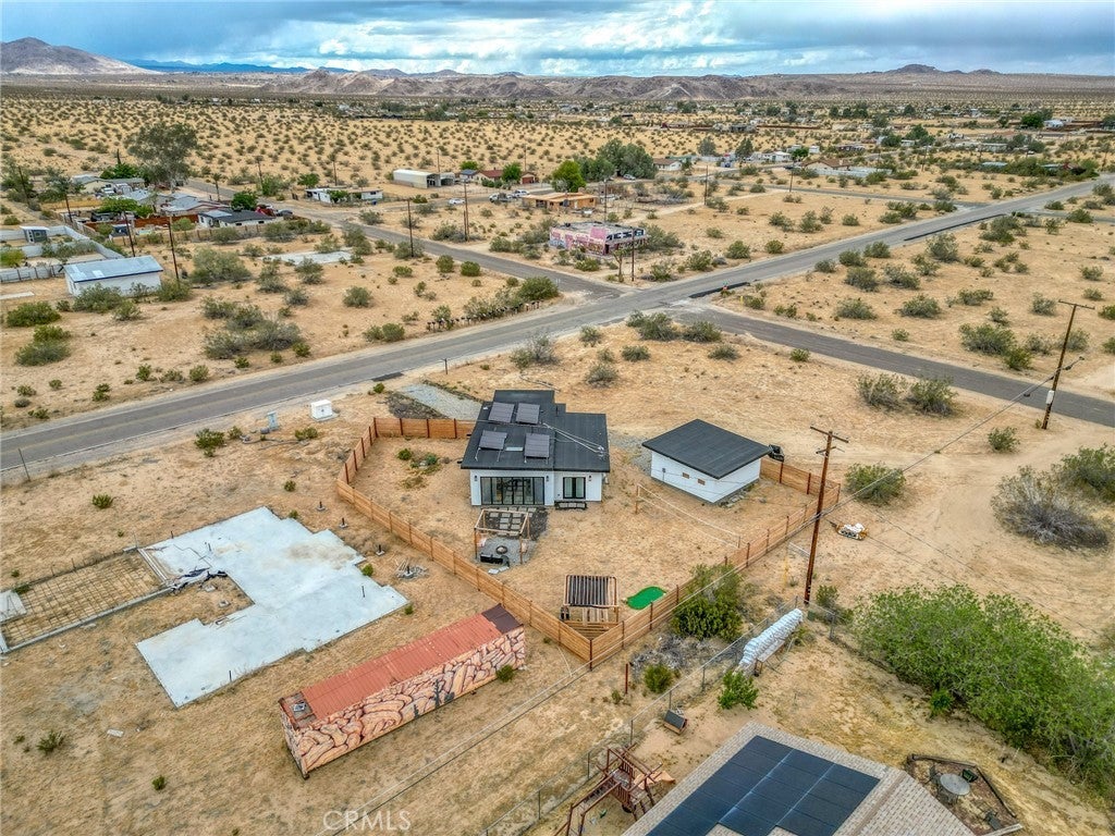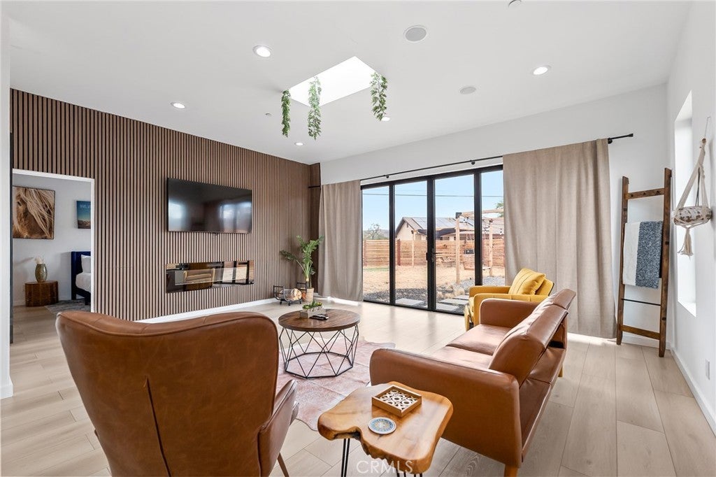 Welcome to Sunfair Palms, a soulful desert sanctuary nestled in the heart of Joshua Tree where modern luxury meets the quiet magic of the high desert. This fully electric home is as efficient as it is enchanting, featuring a paid off 10 kW solar system and a suite of smart home features designed for effortless living. From the moment you step inside, you are greeted by a warm, light filled interior where thoughtful design and natural textures create a sense of calm and connection. The living room is a true showpiece, highlighted by an inviting electric fireplace, a skylight that pours in golden desert light, acoustic accent paneling, recessed lighting, and six stunning glass doors that dissolve the boundary between indoors and out. The kitchen is both elegant and functional, anchored by striking waterfall countertops and a spacious island with sink, complemented by pendant lighting, recessed lights, and modern floating shelves that add a touch of artistic flair. The open dining area flows seamlessly between the kitchen and living room, perfect for gathering and entertaining. Each bedroom serves as a peaceful retreat, complete with mini split systems, charming wood barn closet doors, and private glass doors that open to the surrounding desert landscape. Both bathrooms are beautifully appointed, offering spa like experiences with curated finishes. One features a walk in shower wrapped in bold black tile with a sleek glass enclosure, while the other showcases a shower and tub combination adorned with blue ceramic subway tile, a glass enclosure, and a refined skirted toilet. The detached two car garage has been fully finished with epoxy floors and reimagined as a vibrant game room, complete with an electric vehicle charger. Step outside and experience a setting designed for unforgettable moments under expansive desert skies. A covered patio and separate pergola provide shaded escapes, while the fire pit lounge with whimsical swinging seating invites long evenings of stargazing and connection. A private volleyball court adds a playful touch, and built in Bluetooth speakers throughout the home create the perfect soundtrack to your desert escape. Just minutes from Joshua Tree National Park, Pioneertown, and other iconic destinations, Sunfair Palms is more than a home, it is an experience, offering tranquility, inspiration, and endless possibilities.