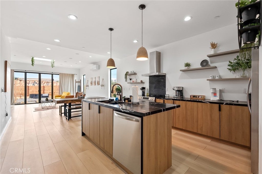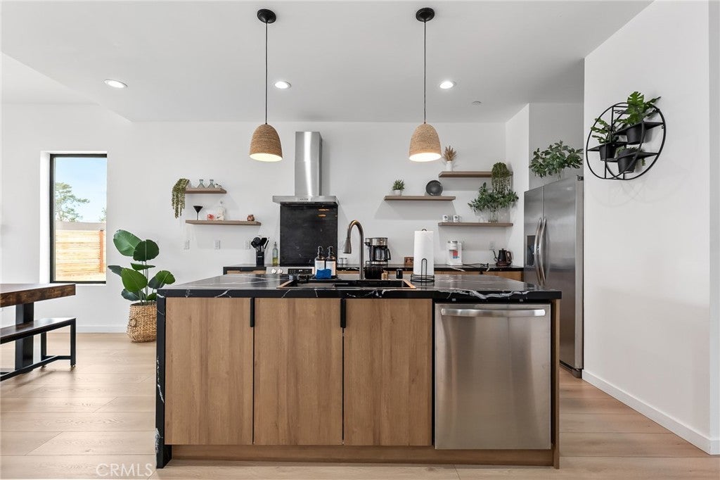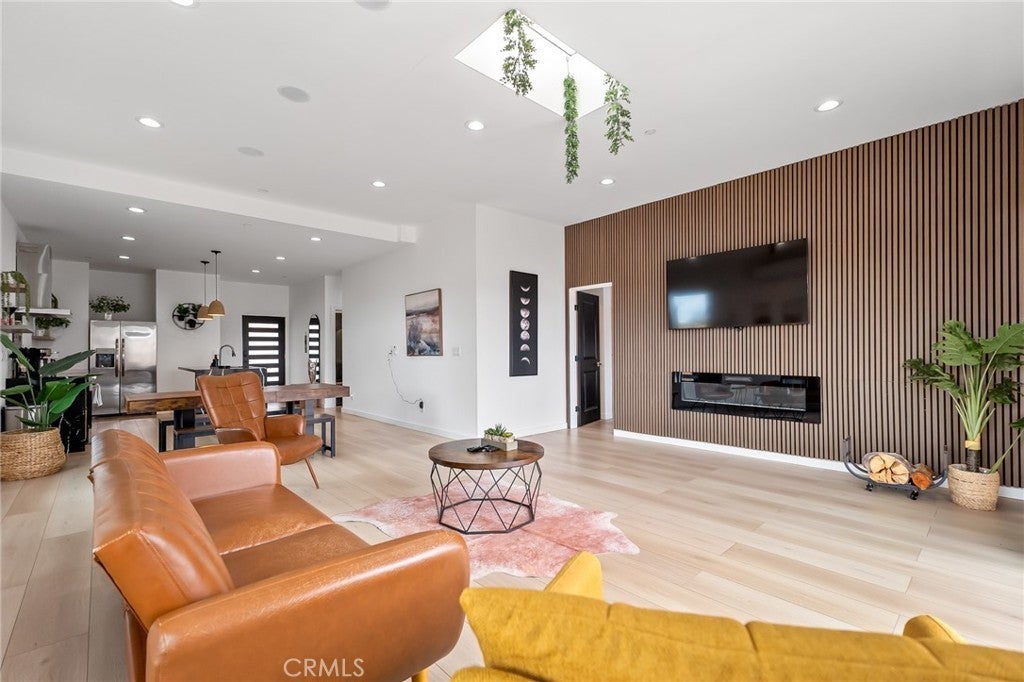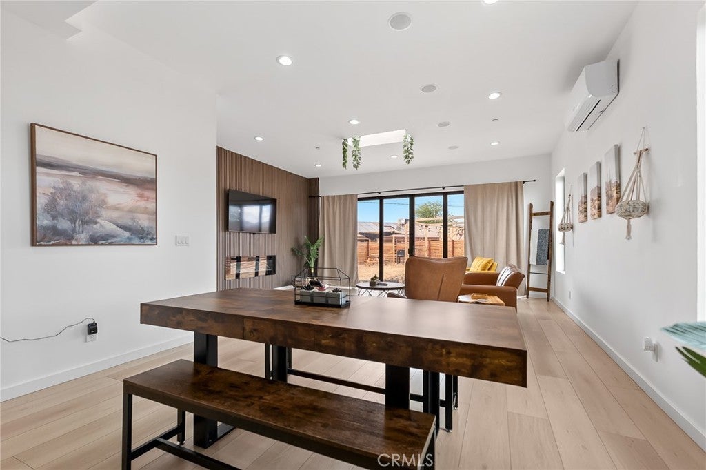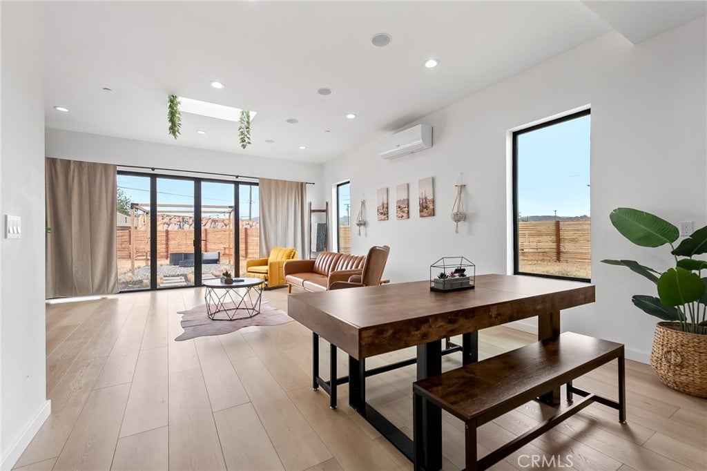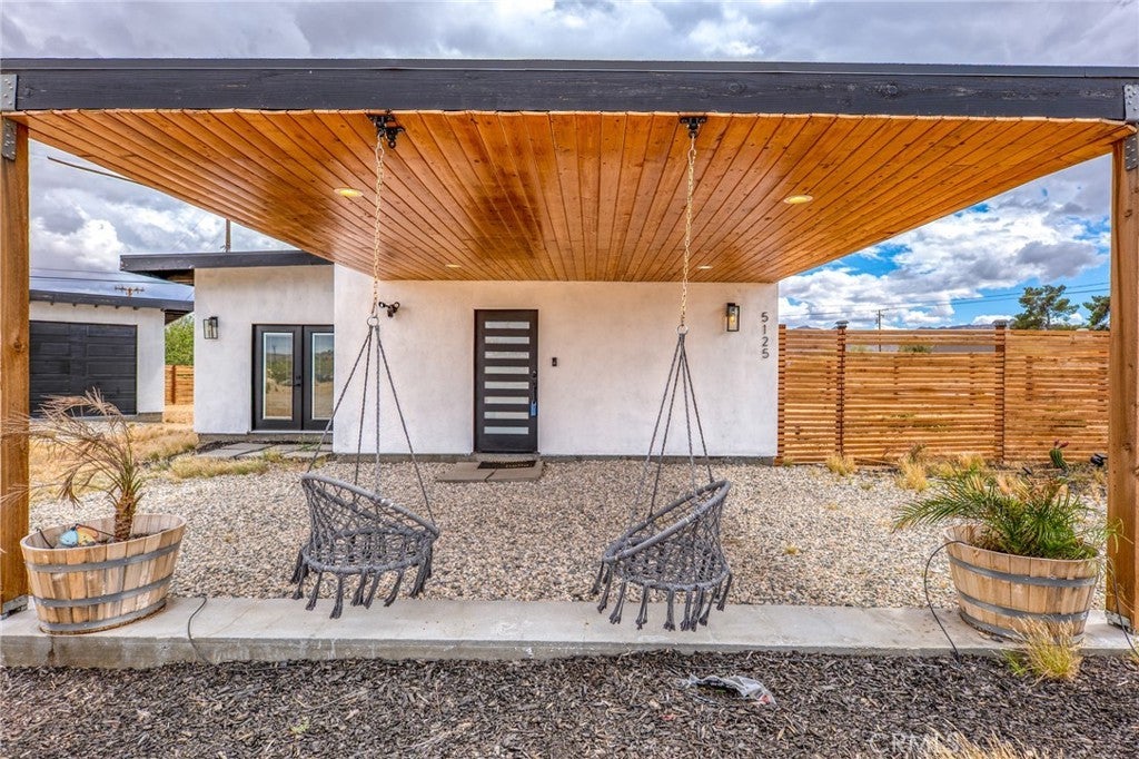 Welcome to Sunfair Palms, a soulful desert sanctuary nestled in the heart of Joshua Tree where modern luxury meets the quiet magic of the high desert. This fully electric home is as efficient as it is enchanting, featuring a paid off 10 kW solar system and a suite of smart home features designed for effortless living. From the moment you step inside, you are greeted by a warm, light filled interior where thoughtful design and natural textures create a sense of calm and connection. The living room is a true showpiece, highlighted by an inviting electric fireplace, a skylight that pours in golden desert light, acoustic accent paneling, recessed lighting, and six stunning glass doors that dissolve the boundary between indoors and out. The kitchen is both elegant and functional, anchored by striking waterfall countertops and a spacious island with sink, complemented by pendant lighting, recessed lights, and modern floating shelves that add a touch of artistic flair. The open dining area flows seamlessly between the kitchen and living room, perfect for gathering and entertaining. Each bedroom serves as a peaceful retreat, complete with mini split systems, charming wood barn closet doors, and private glass doors that open to the surrounding desert landscape. Both bathrooms are beautifully appointed, offering spa like experiences with curated finishes. One features a walk in shower wrapped in bold black tile with a sleek glass enclosure, while the other showcases a shower and tub combination adorned with blue ceramic subway tile, a glass enclosure, and a refined skirted toilet. The detached two car garage has been fully finished with epoxy floors and reimagined as a vibrant game room, complete with an electric vehicle charger. Step outside and experience a setting designed for unforgettable moments under expansive desert skies. A covered patio and separate pergola provide shaded escapes, while the fire pit lounge with whimsical swinging seating invites long evenings of stargazing and connection. A private volleyball court adds a playful touch, and built in Bluetooth speakers throughout the home create the perfect soundtrack to your desert escape. Just minutes from Joshua Tree National Park, Pioneertown, and other iconic destinations, Sunfair Palms is more than a home, it is an experience, offering tranquility, inspiration, and endless possibilities.