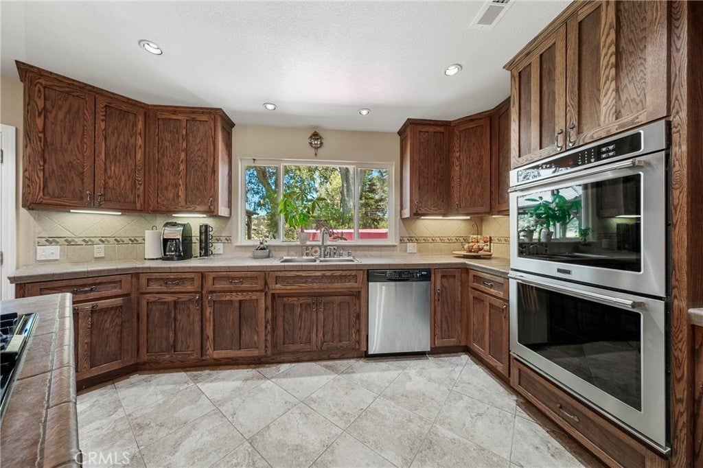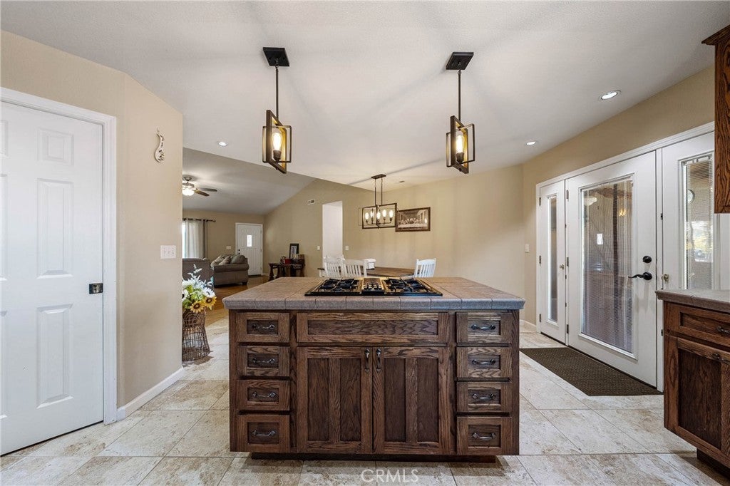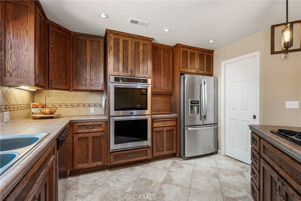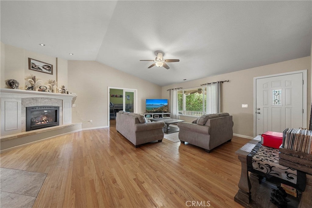 Tucked at the end of a quiet court, this spacious single-level home offers 5 bedrooms plus a flexible den—ideal for home office, playroom, or guest space. Four bedrooms are positioned in a dedicated wing alongside two bathrooms and a laundry room, making it easy to keep daily routines organized. The primary suite is privately located on the opposite side and features direct access to the backyard, an en-suite bath with double vanity and walk-in shower, and an attached den with glass French doors opening to the living room. The backyard is flat and level, thoughtfully maintained with shaded areas that create a safe, kid-friendly space perfect for playtime or relaxed outdoor gatherings. The main living area boasts vaulted ceilings, hardwood floors, and a fireplace, flowing seamlessly into the spacious kitchen with tile flooring, a large center island with propane cooktop, double oven, and generous sized pantry.