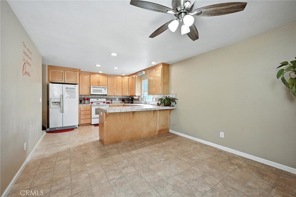 Charming Corner Home Welcome to your new sanctuary! This delightful turn-key property is nestled on a spacious corner lot, offering both comfort and style. As you step through the elegant formal entry, you'll be greeted by an oversized living room that’s perfect for entertaining, featuring vaulted ceilings and upgraded shutters that add a touch of sophistication. The heart of the home is the expansive kitchen, complete with neutral ceramic tile counters and backsplash, pull-out shelving, and a generous pantry closet. The adjoining dining area boasts a slider that opens to a covered back patio, ideal for outdoor gatherings. This home features three generously sized bedrooms, including a primary suite that offers a walk-in closet and a private bathroom with a convenient stall shower. The hall bathroom is equipped with a tub/shower combo, providing ample space. Convenience is key with a laundry closet located in the hallway, and the washer and dryer are included in the sale! The extra-long garage, measuring approximately 24 feet deep, provides plenty of room for oversized vehicles and even a boat. Enjoy low-maintenance, low-water landscaping in the front, side, allowing you to focus on your landscaping dreams while enjoying the fruits of your labor with producing nectarine and apple trees. Back yard has lush lawn. Situated in an ideal corner location, this home offers stunning golf course views without the hassle of being directly on the fairway. Don’t miss the opportunity to make this charming corner cutie your own! Come and see all that this lovely home has to offer!